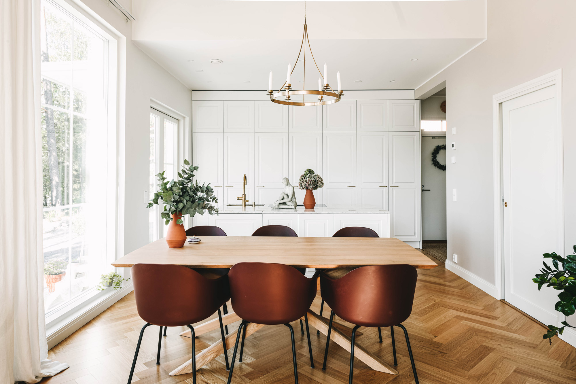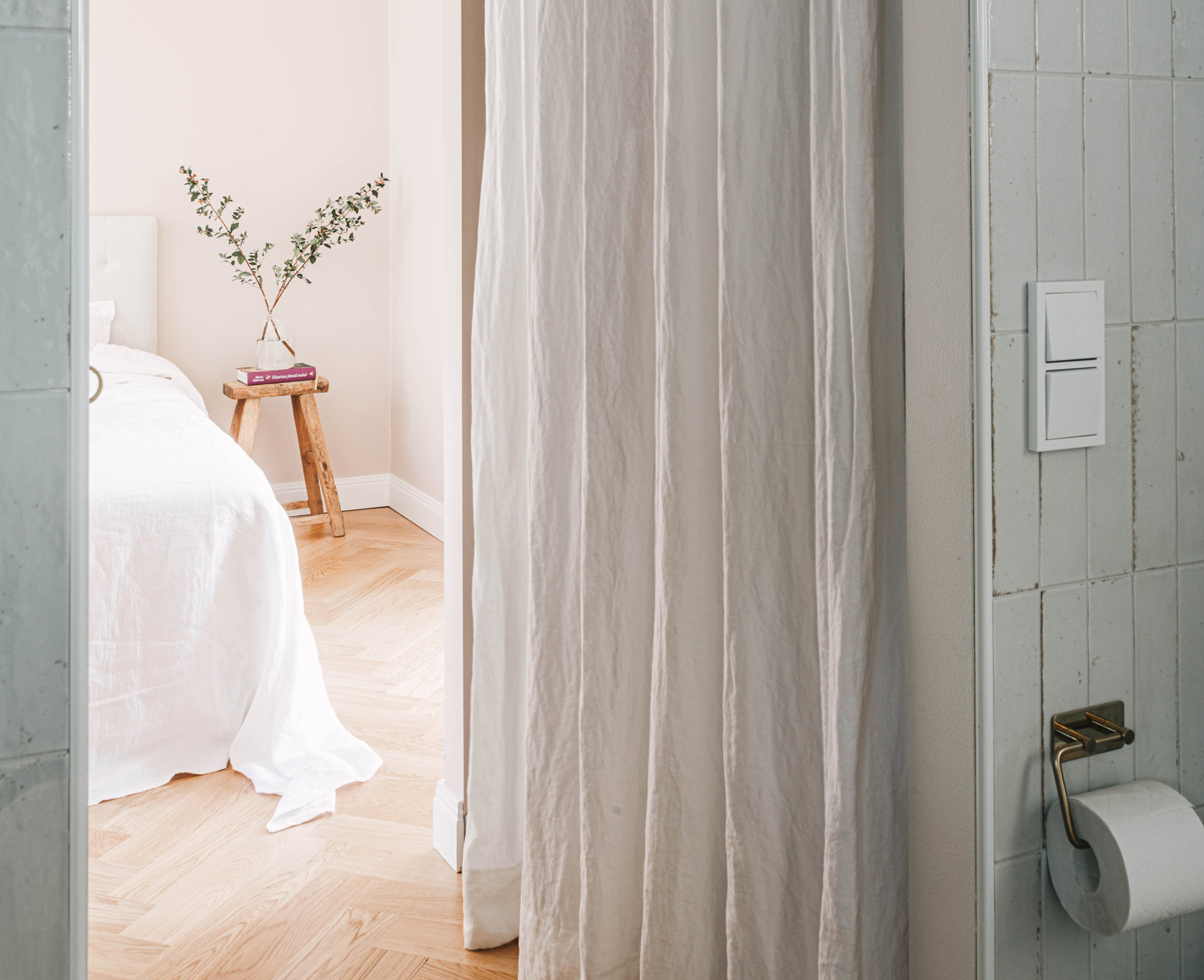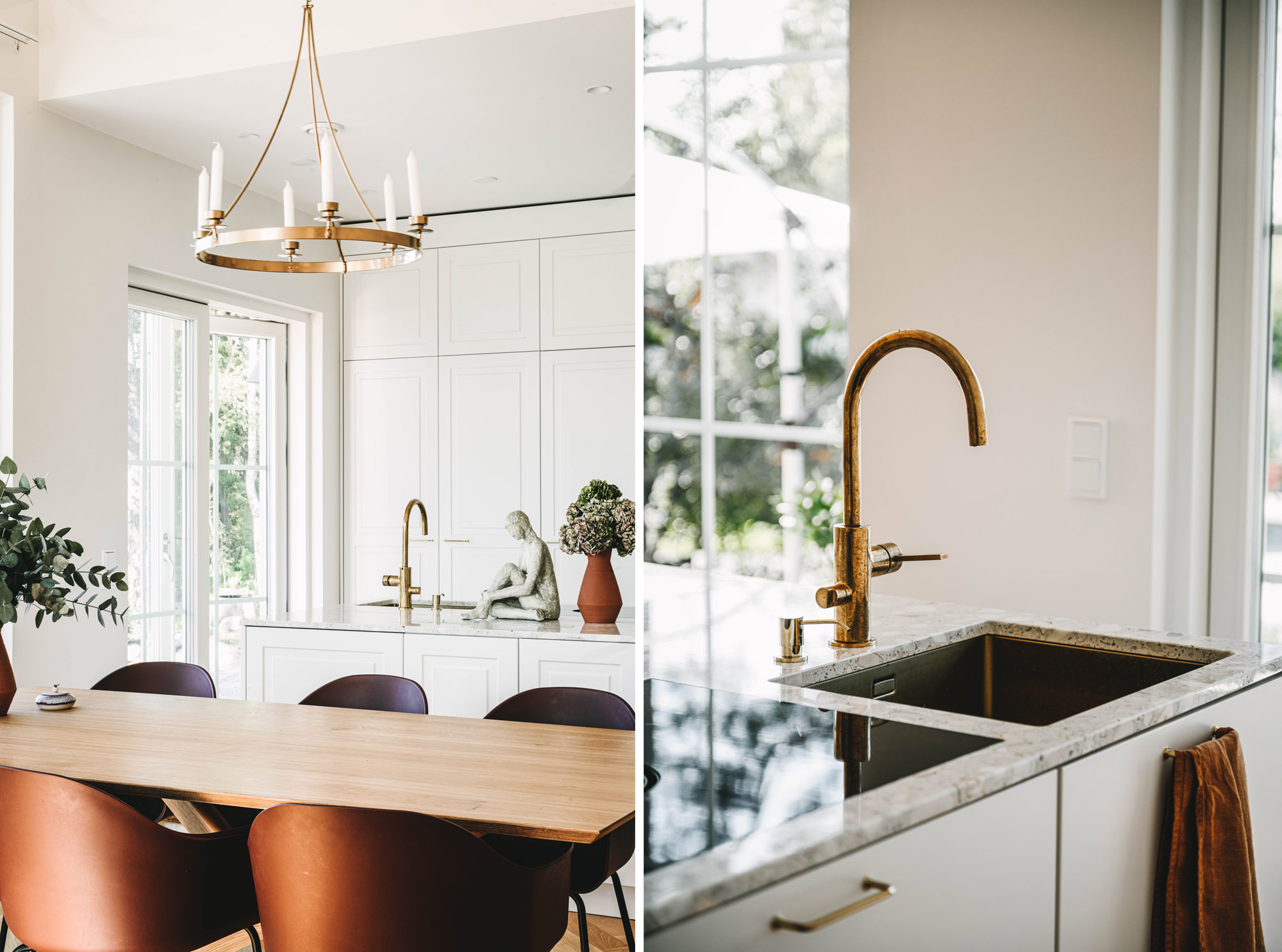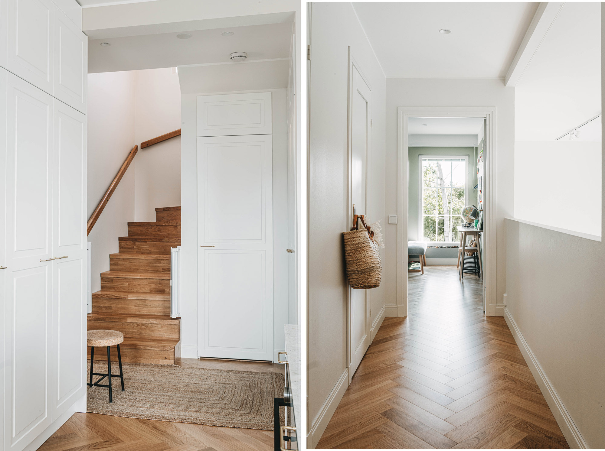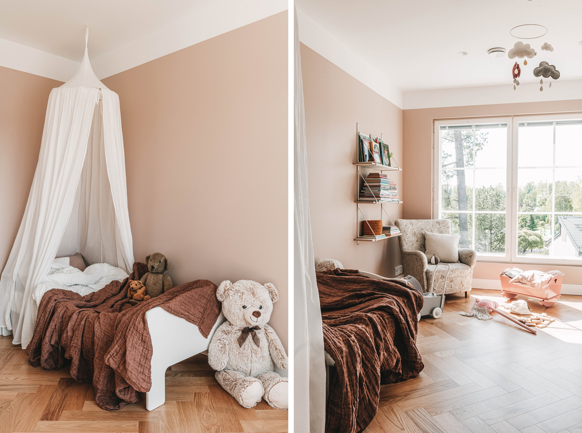 – Tykkäämme talon pohjasta. Tässä ei ole hukkatilaa missään, vaan kaikki nurkat on otettu hyötykäyttöön. Värimaailmasta ja materiaaleista päätimme heti alussa, että kotiimme tulee kalanruotoparketti, tammea, messinkiä ja kultaa sekä murretut pastelliset värit. Kun olimme tehneet päätökset isoista linjoista, sen jälkeen oli helppoa tehdä pienempiä päätöksiä rakentamisen aikana.