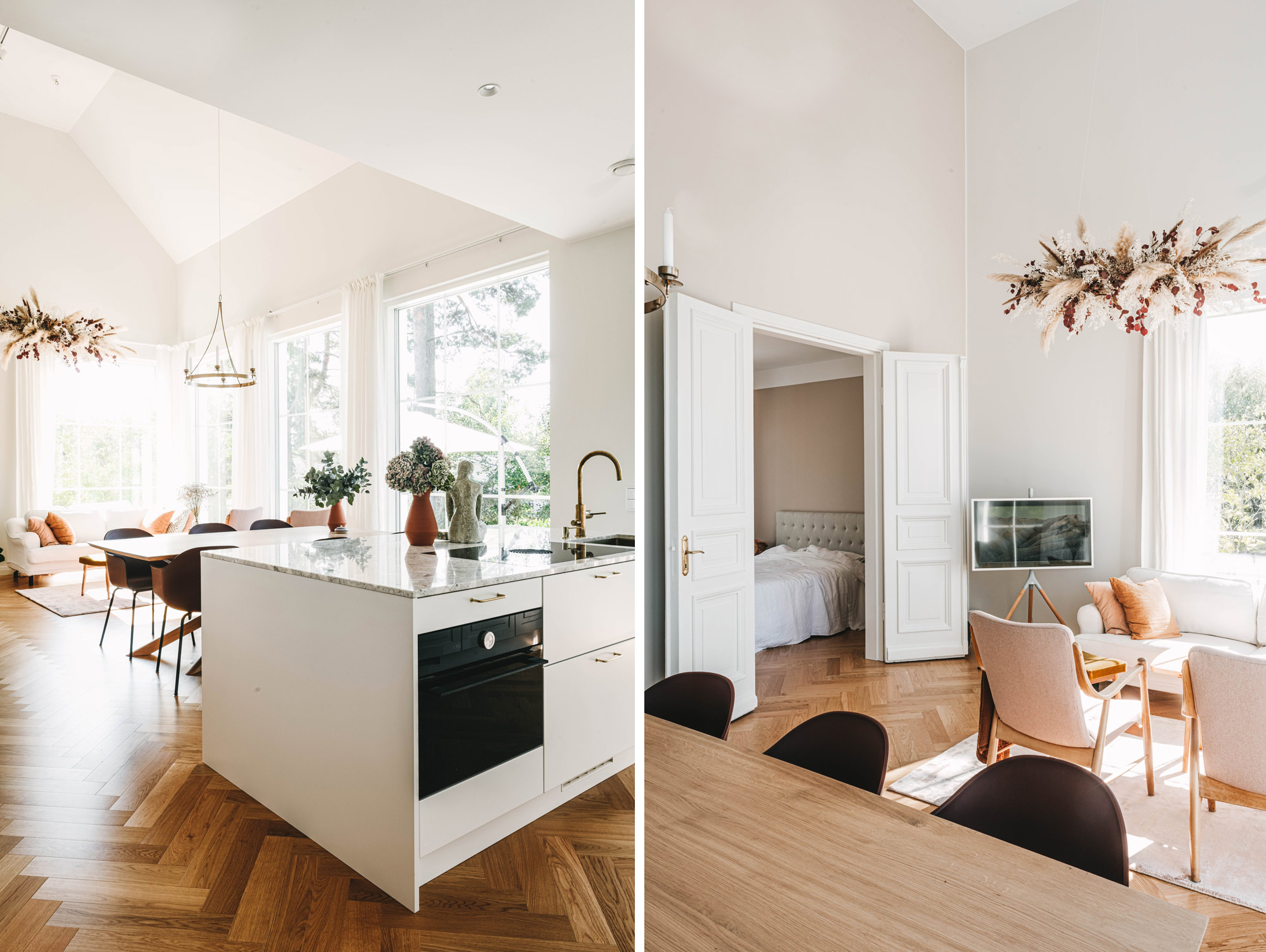 Avoimessa oleskelutilassa on hyödynnetty talon koko harjakorkeus. Saarekkeessa on tiskialtaan lisäksi pakastin, tiskikone, liesi ja uuni. Ruokapöydän päällä Jotexin kynttiläkruunu. Olohuoneen seiniin valittiin Tikkurilan sävy Shaali. Vanhempien makuuhuoneen oviksi kunnostettiin Designmuseon vanhat pariovet. Katosta roikkuva kukka-asetelma on kukkakauppa Florannasta Helsingistä.