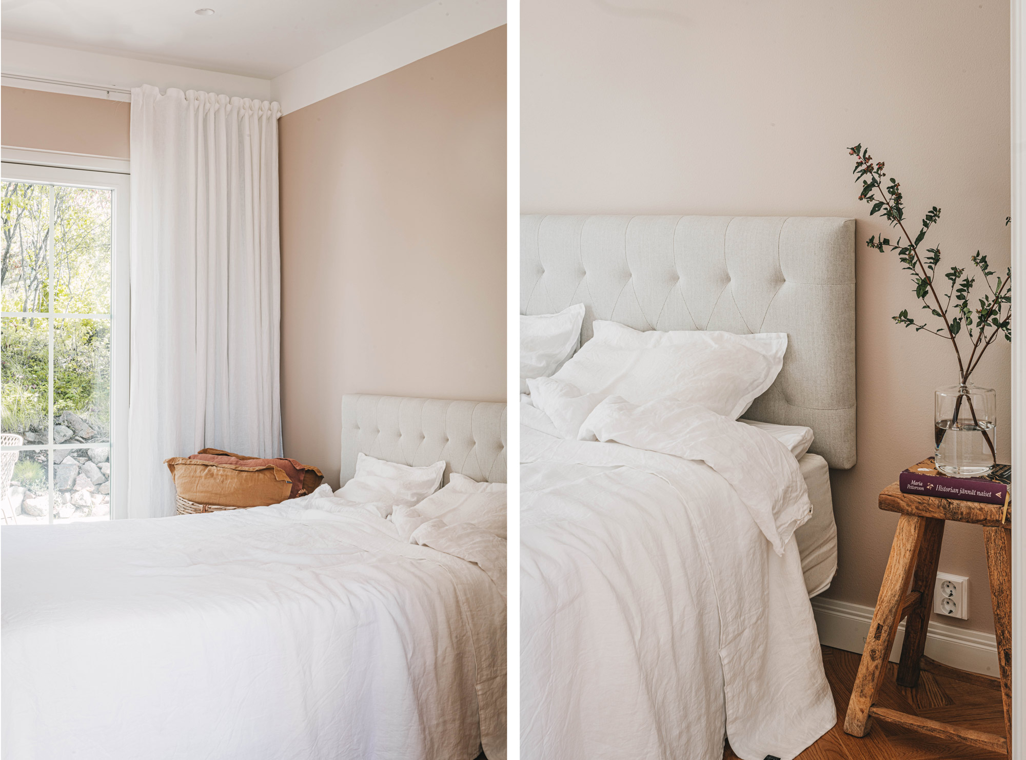 Vanhempien makuuhuoneen seinän väri on Tikkurilan Breksia, joka näyttää aina eri sävyiseltä valon vaihtuessa. Pieni jakkara on ostettu Cafelatte Lifestyle -liikkeestä.