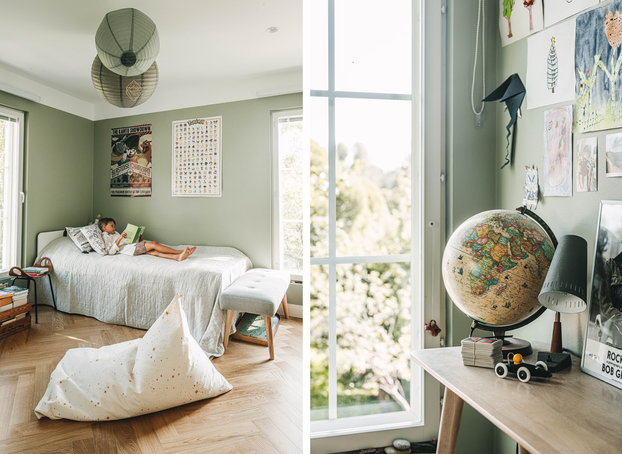 Lennonin huone on yläkerrassa käytävän päässä. Molempien lasten huoneista aukeaa korkeat ikkunat kahteen ilmansuuntaan. Seinien kaunis vihreä sävy on Tikkurilan Serpentiini.