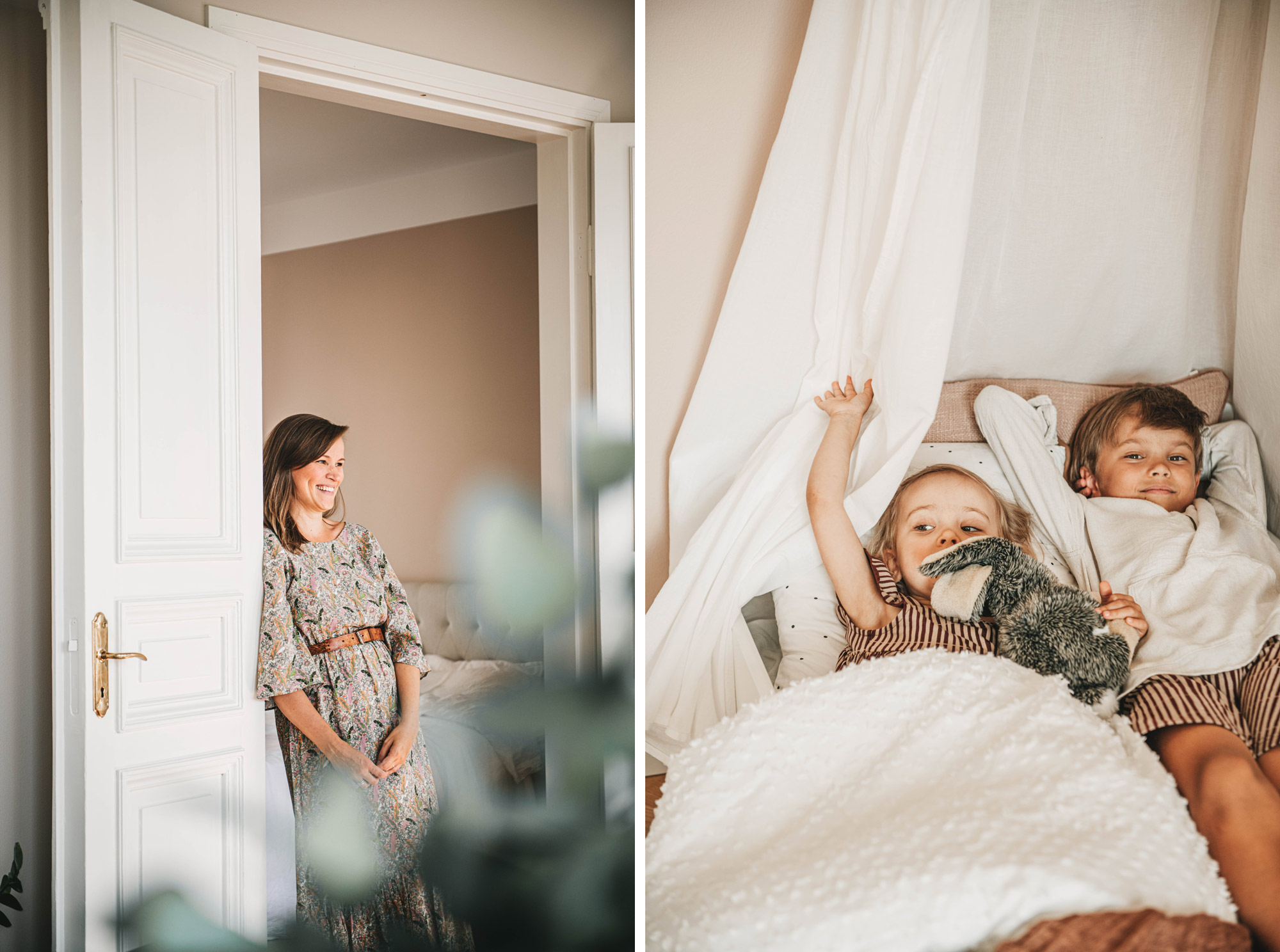 Yläkerran käytävästä suunniteltiin kapeampi, että lapsille saatiin isommat huoneet. Molempien huoneissa on kahteen ilmansuuntaan aukeavat korkeat ikkunat. Käytävän varrella on vaatehuone ja kylpyhuone, joka on lasten käytössä. Vaatehuone on perheelle riittävä säilytystila vaatekaappien lisäksi. He pyrkivät käymään tavaroita ja vaatteita ahkerasti läpi ja viemään ylimääräiset kierrätykseen.