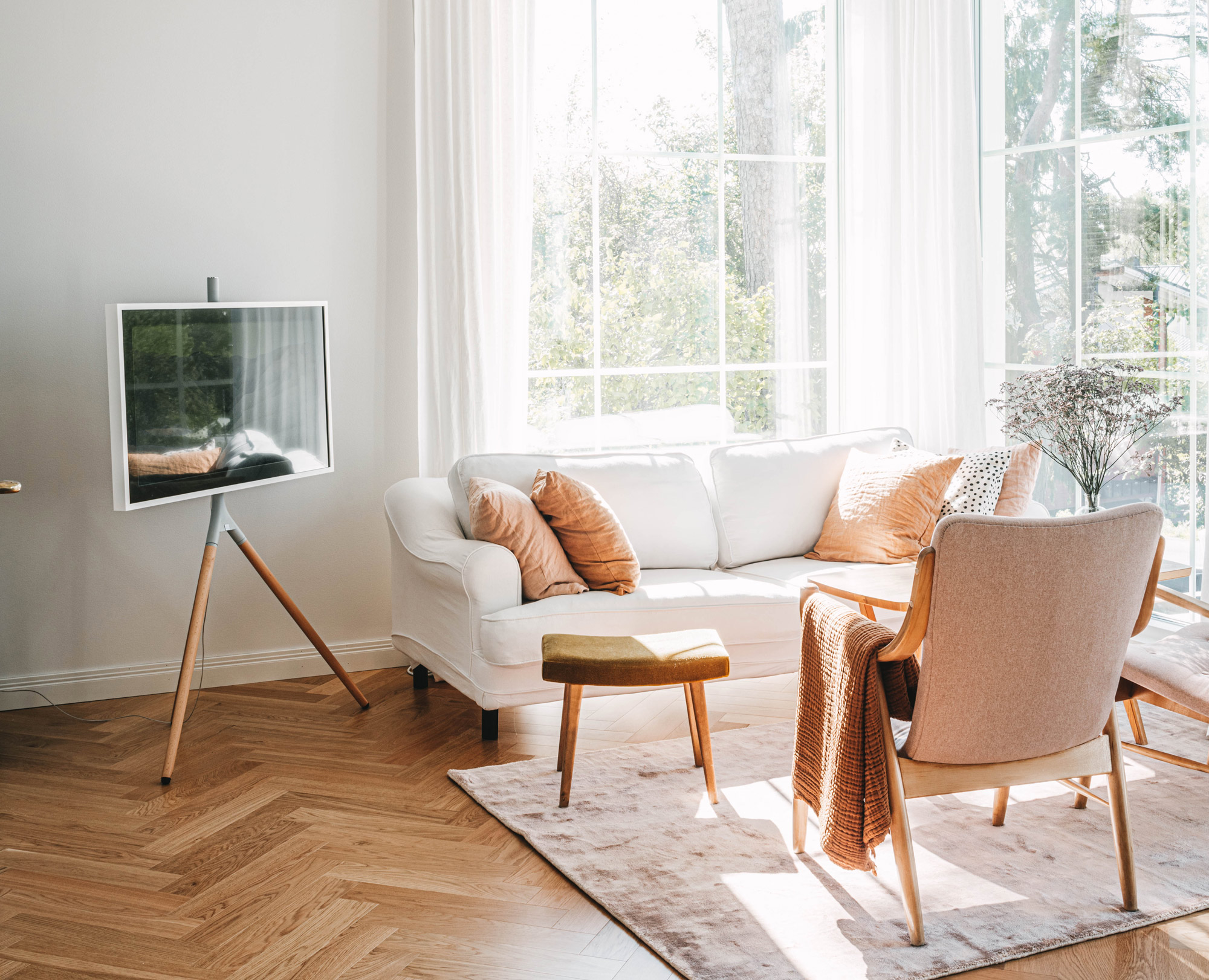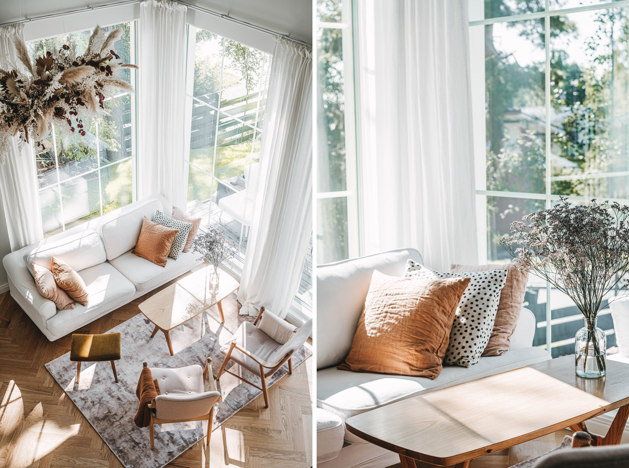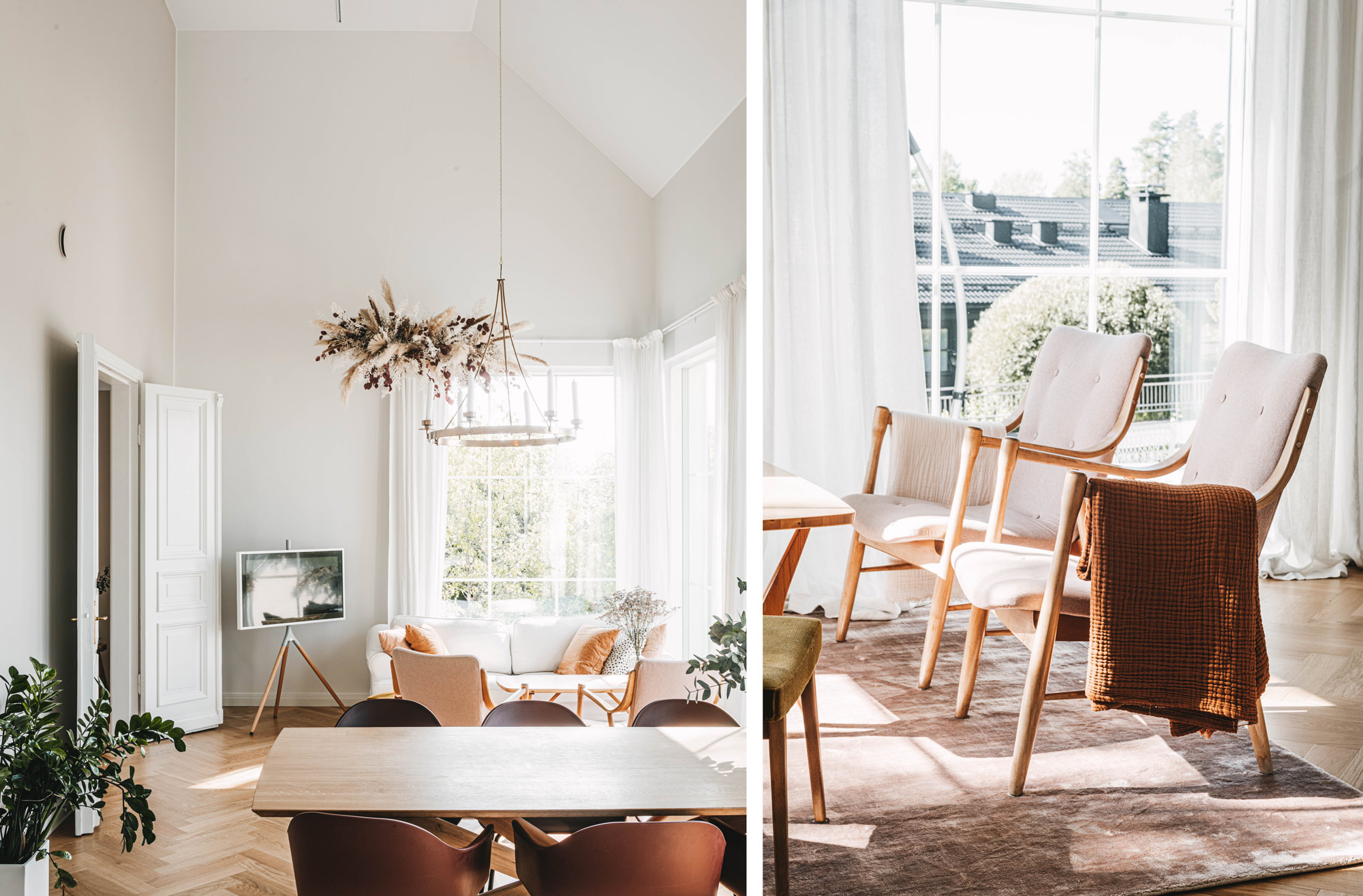 Terassille päin sijaitsevasta olohuoneesta aukeaa isot ikkunat kahteen suuntaan. Tilan tuntua avoimeen olohuoneeseen ja keittiöön tuo myös huonekorkeus. Uudelleen verhoiltu Furninovan sohva oli jo perheen edellisessä kodissa. Salla on saanut mumminsa omistamat Ilmari Lappalaisen suunnittelemat nojatuolit.
