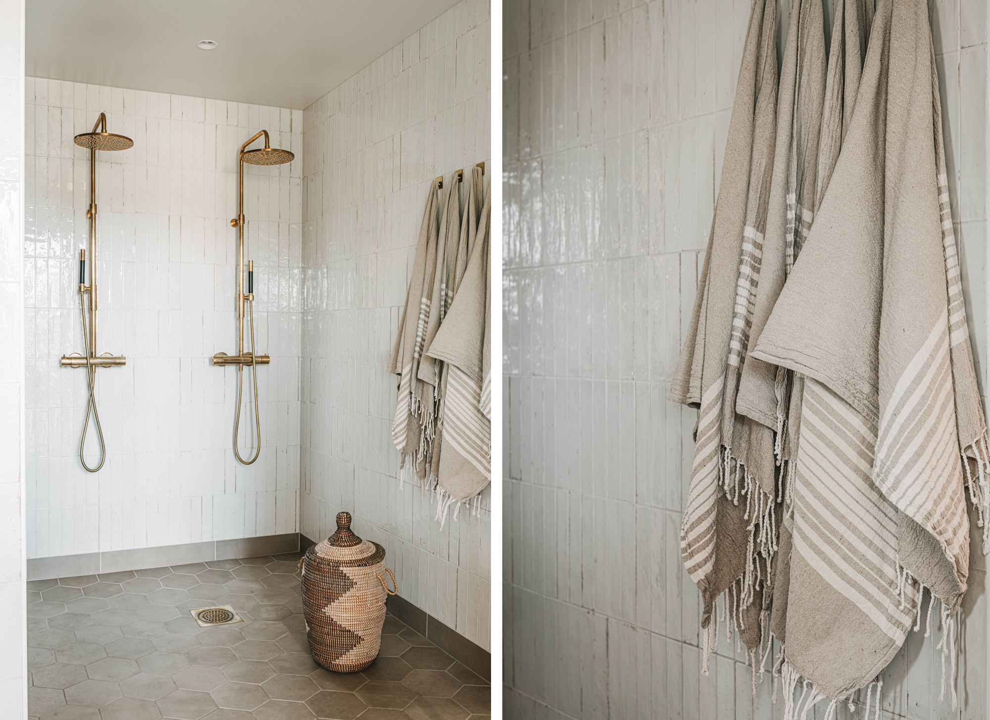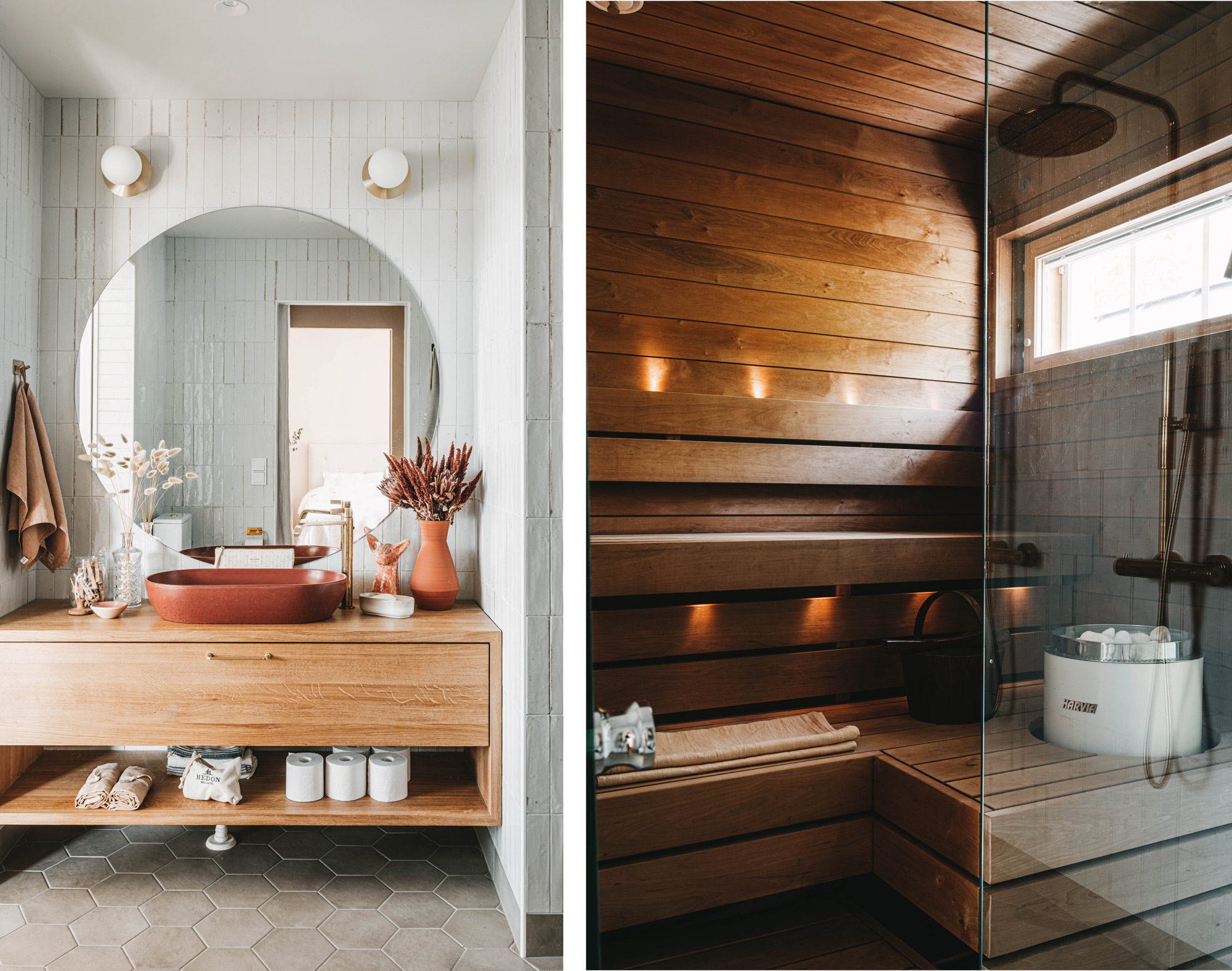Alakerran eteisen ja vanhempien makuuhuoneen välissä on yhdistetty kodinhoitohuone ja vaatehuone, kylpyhuone sekä sauna. Kylpyhuoneen kalusteet on tehnyt mittatilaustyönä Handyhand. Lume-seinälaatat on valittu Kannustalon materiaalivalikoimasta. Malja-allas on Concrete Nation ja siihen sopiva messingin värinen Tapwell Arman ARM081 -hana. Pyöreä iso peili Essis. Saunan lauteet on lämpökäsiteltyä haapaa. Kiuas Harvia.