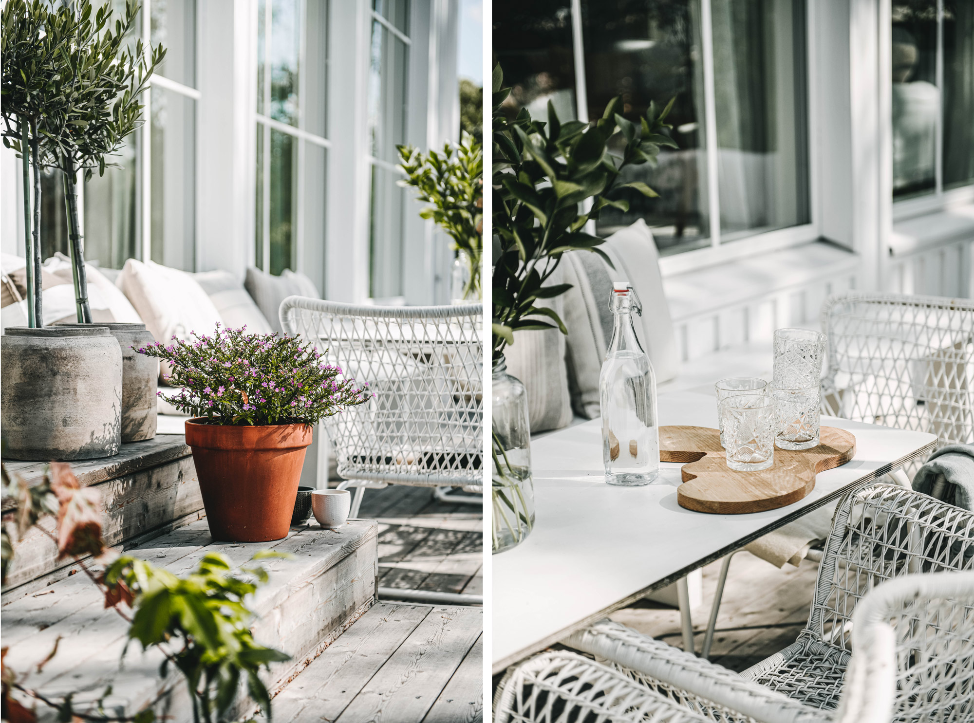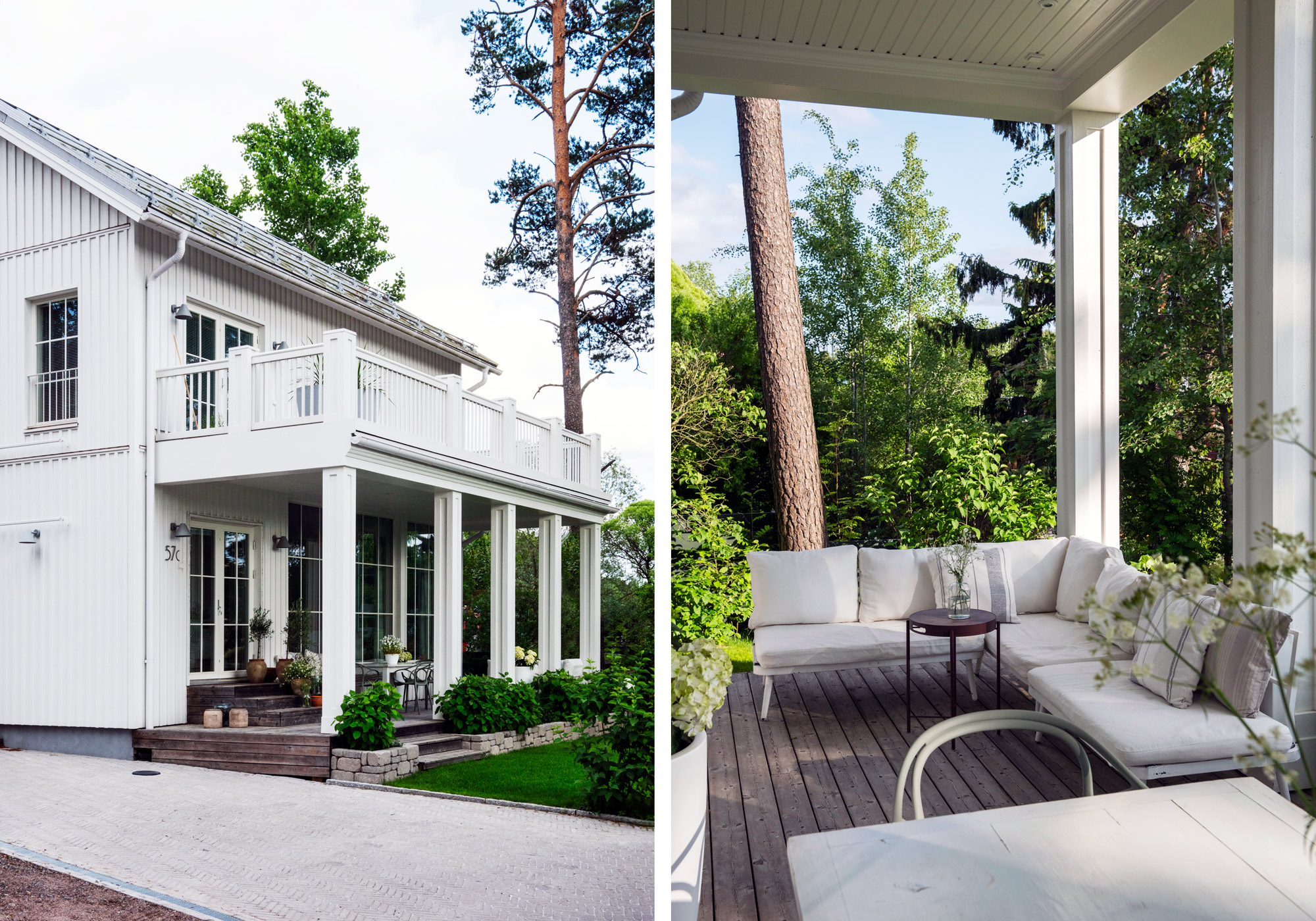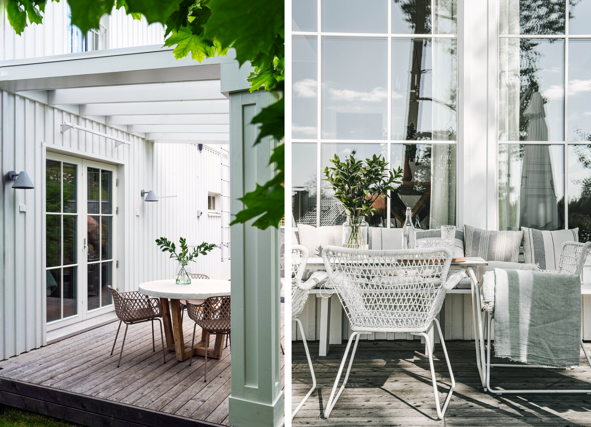 Makuuhuoneesta aukeaa toiset pariovet talon taakse tehdylle pienelle, suojaiselle terassille, jonne Markus rakensi pihavaraston ylijäämälaudasta. Talon takana on villi puutarha, jonne näkyy naapurin tontilta isot, alkukesästä kauniisti kukkivat syreenit. Pienelle takaterassille ei paista aurinko enää puolen päivän jälkeen, vaan siellä on juuri sopivan viileää. Varsinkin alkuaikoina takaterassilla vietettiin paljon aikaa. Salla ja Markus ovat tyytyväisiä, että asuivat hetken uudessa talossa ennen kuin tekivät päätöksiä. Esimerkiksi pihakiveys olisi erilainen, jos se olisi tehty heti.