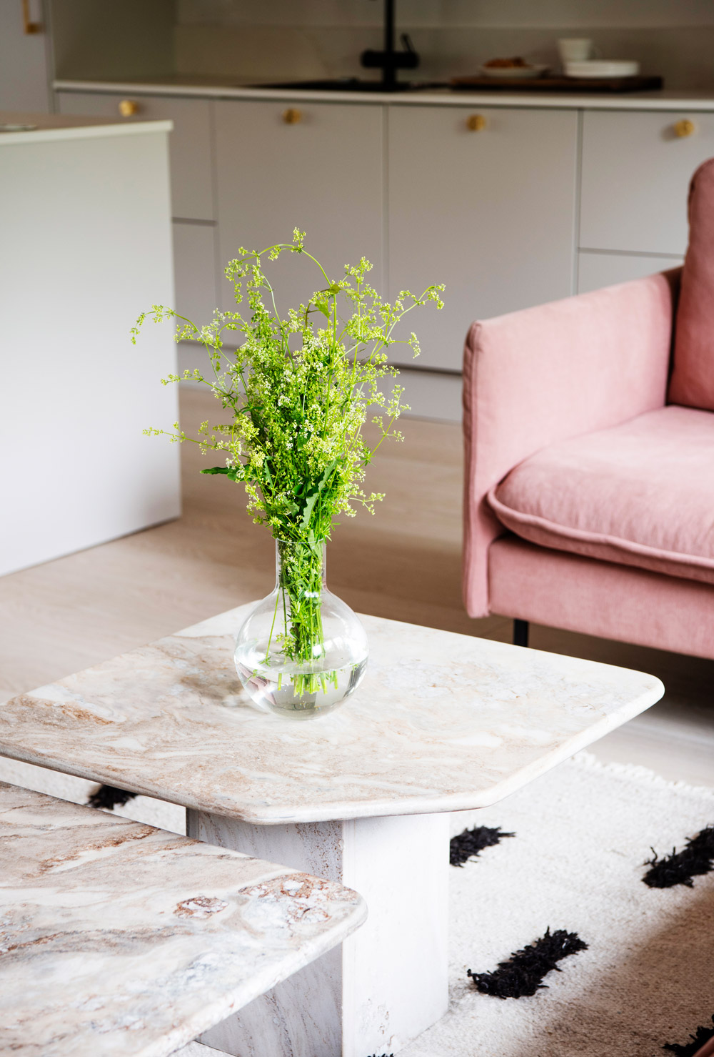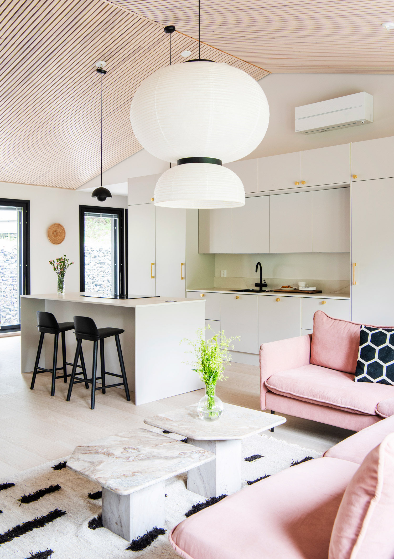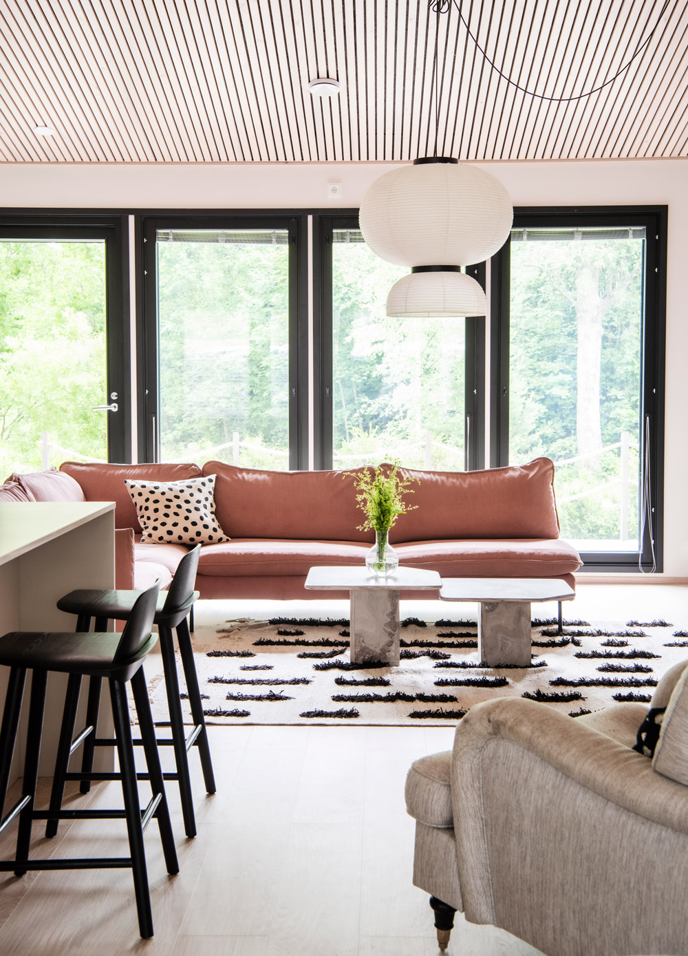 Oleskelutilan harjakorkeus on neljä metriä, muissa tiloissa huonekorkeus on 2,6 metriä. Väritykseltään mustavalkoiseen avoimeen tilaan hankittiin kiviset vintage-sohvapöydät &Traditionin Formakami-valaisin ja Sera Helsingin Laine-matto. Kuusilinnalta ostettu vaaleanpunainen sohva tuo tilaan väriä. Ikkunan puitteet ovat Tiivin Black.