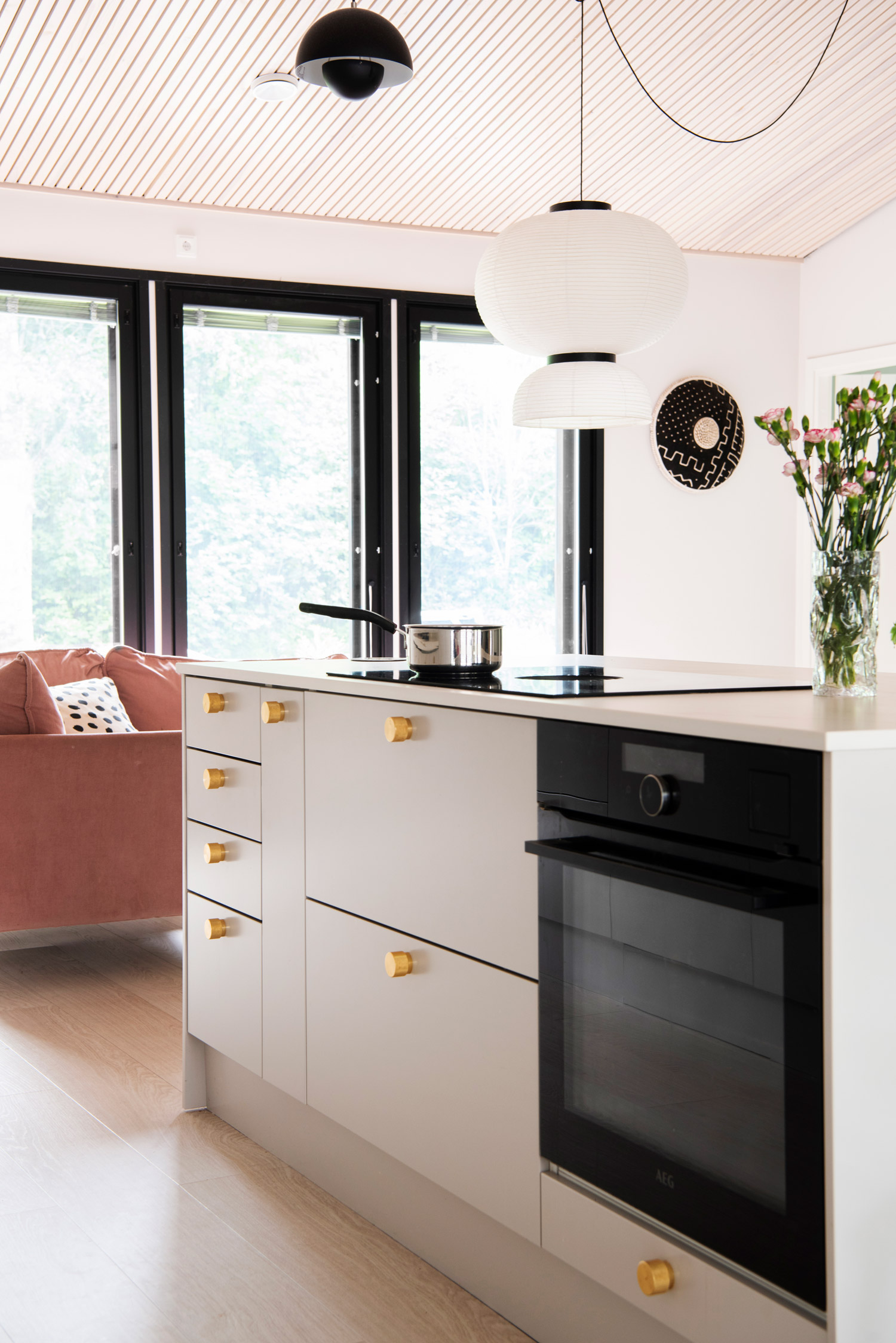 Avoimessa tilassa on hyödynnetty harjakaton koko korkeus. Kattoon on asennettu kalajokelaisen Centin valkolakatusta männystä valmistetut 40 x 20 -milliset kattorimat, jotka toimivat myös akustisena elementtinä. Topi-Keittiöiden Kosketus-keittiökalusteet ovat Kashmir OIP74M-sävyiset, vetimet nro 117.