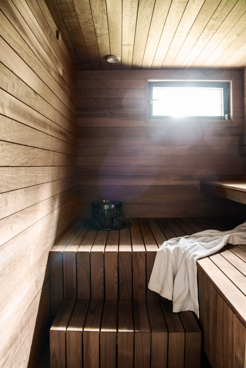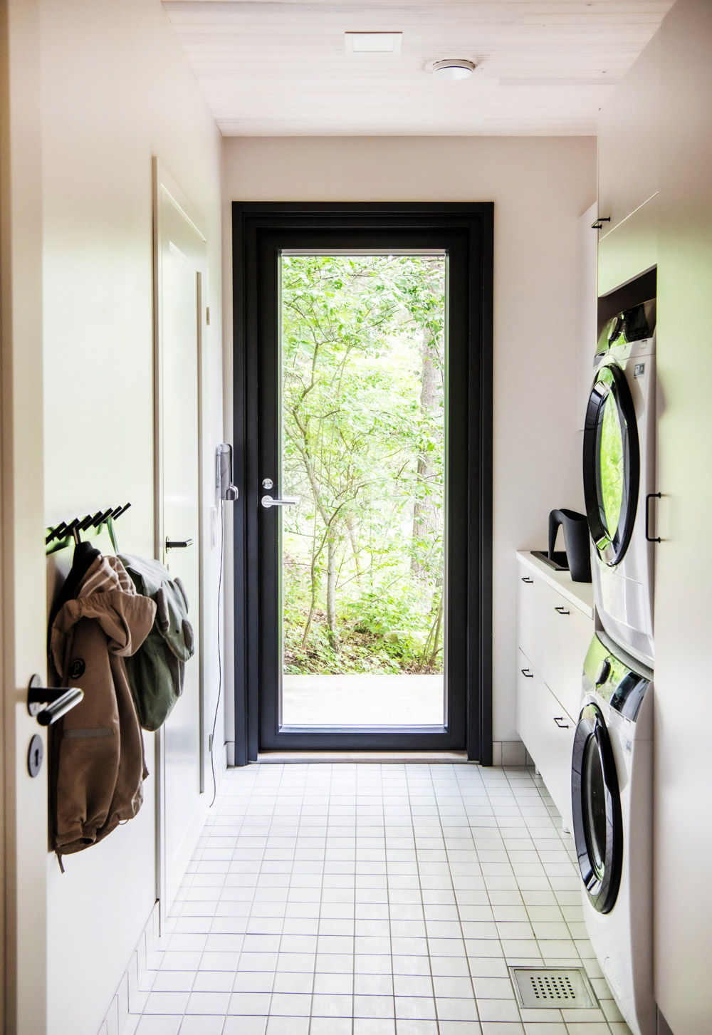 Singon puukaluste valmisti ja asensi saunan lauteet sekä seinä- ja kattopaneelit Centin lämpökäsitellystä haapapuusta. Kodinhoitohuoneessa on sama 10 x 10 -senttinen lattialaatta kuin kylpyhuoneessa, Värisilmän Concept R37F Bianco. Kiintokalusteet Topi-keittiöiden Dyyni-sarjan Kashmir DY981-sävyä. Pesutornin koneet AEG.