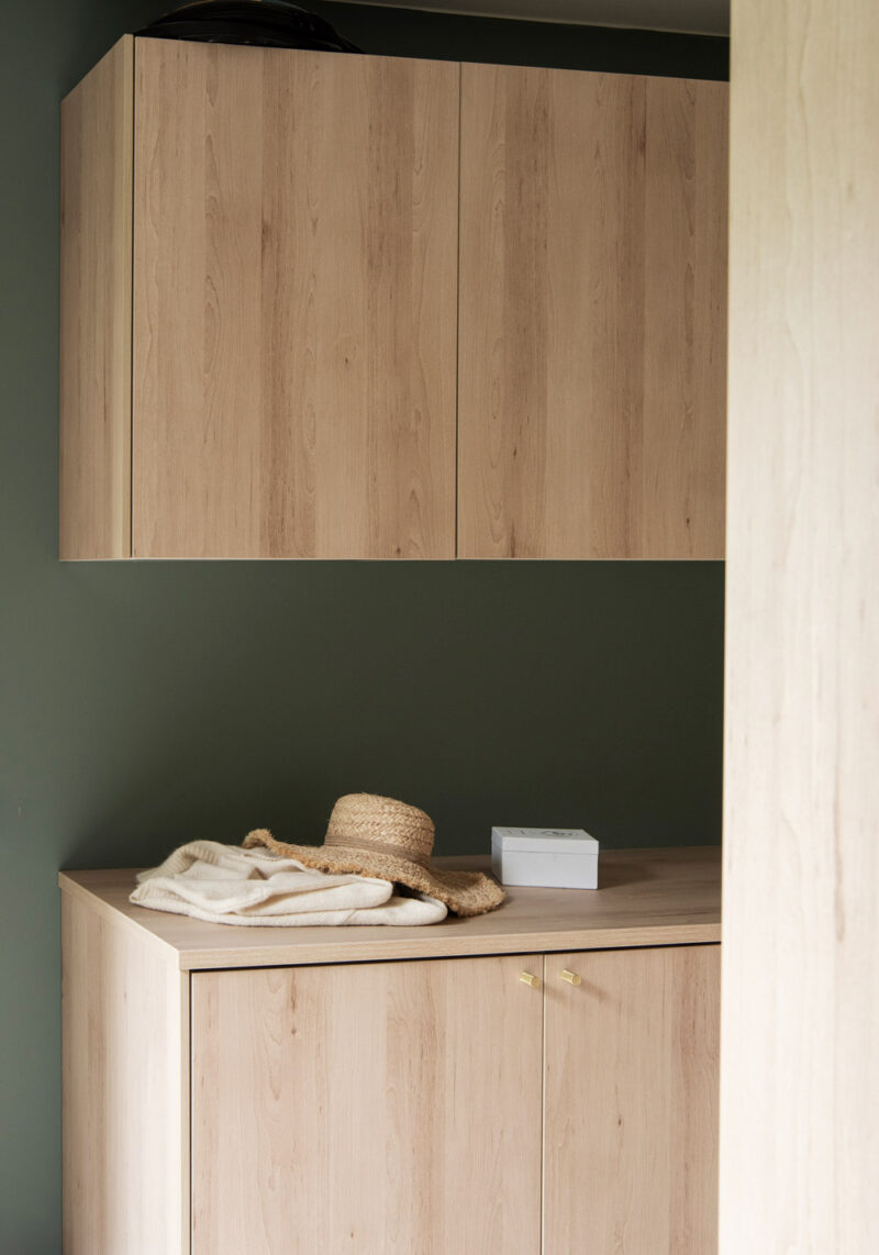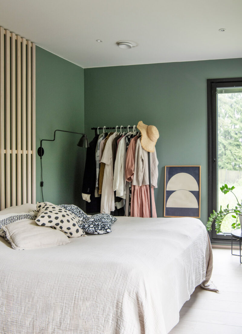 Kodin kaikissa makuuhuoneissa on eri sävyiset vihreät seinät. Vanhempien makuuhuoneessa on Teknoksen vihreä TV N494. Sängyn päädyssä on Matiaksen suunnittelema pystyrimoitus Centin valkolakatusta rimasta. Musta seinävalaisin on Cessakin-mallistosta. Olohuoneen ja vanhempien makuuhuoneen välissä on tila, johon valittiin samaa kalustesarjaa kuin wc-tilaan, Topi-keittiöiden Aitta-kalusteet, Rantapyökki AT13. Seinien sävy on sama kuin vanhempien makuuhuoneessa, Teknoksen vihreä TV N494. Työtaso on Topi-keittiöiden laminaattitaso TL K013.