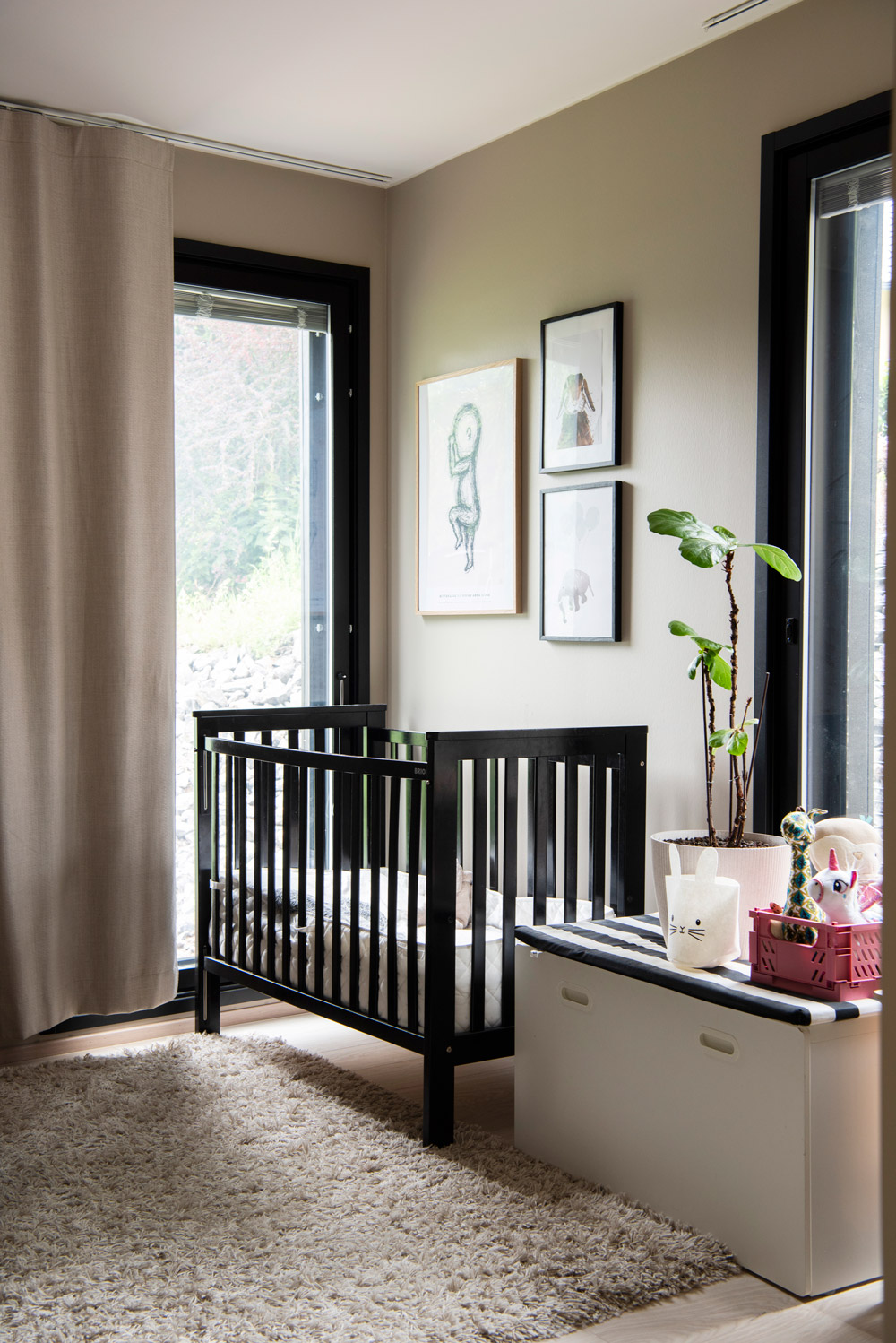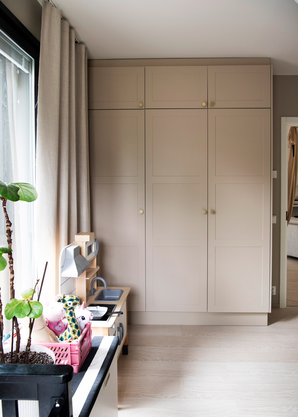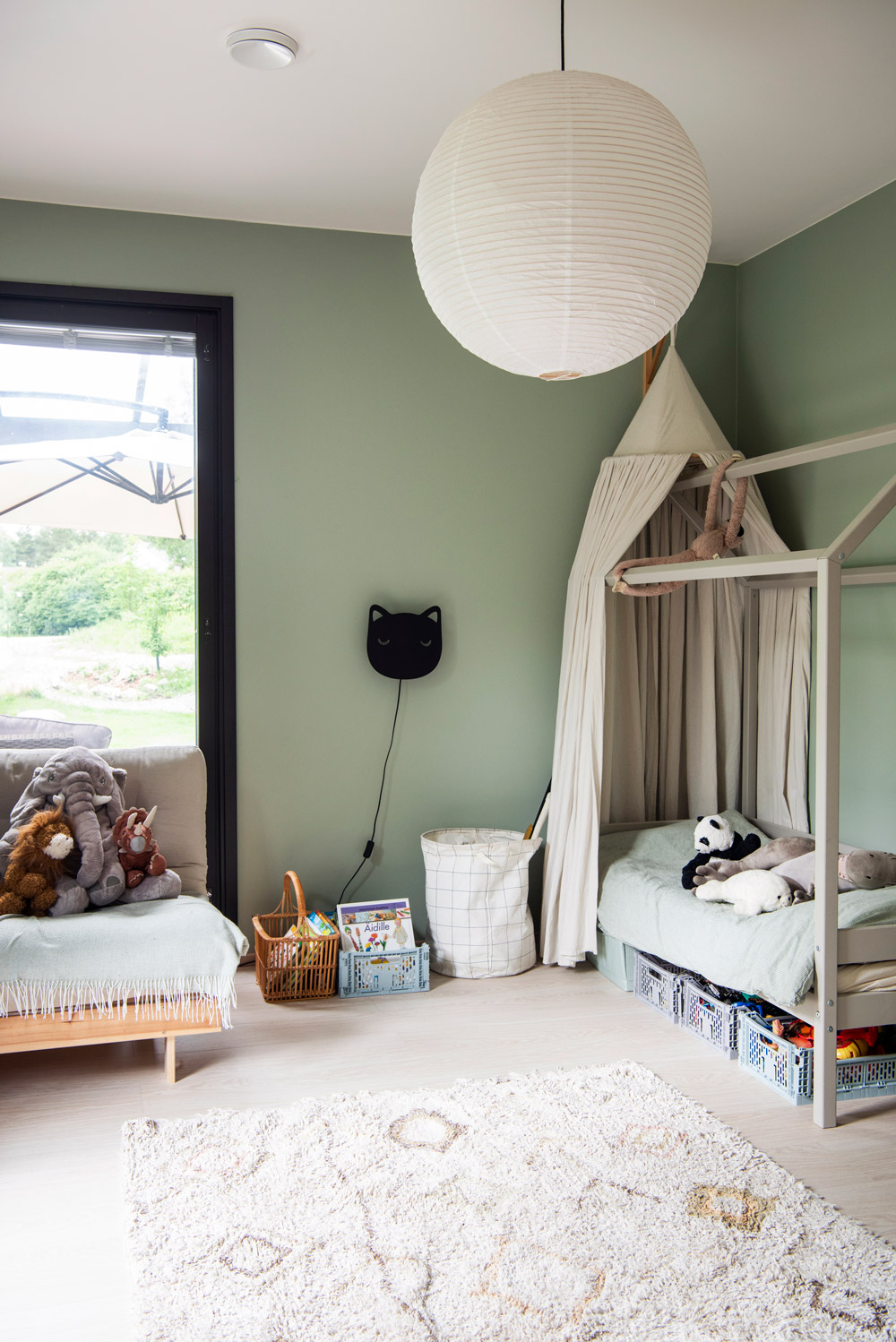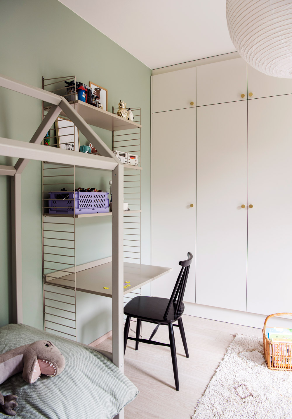 Pojan huoneesta aukeaa näkymä terassille ja kohti autotallia. Seinäväriksi valittiin Teknoksen Serpentiini-sävy 2907-G35Y. Vaatekaapit ovat Topi-Keittiöiden Kosketus, värisävy Hiekka OIP17M. Katossänky on HoppeKidsin-mallistosta ECO Dream -talosänky. Matto on Lorena Canalsin ja paperivalaisin Hayn. Tyttären huoneessa koko huonekorkeus on hyödynnetty kaappitilaksi. ’’Erityisen ylpeitä olemme tämän tilan kalustevalinnasta. Topi-keittiöiden Hella-kaapiston Cappuccino-sävy sointuu huoneen muuhun värimaailmaan, Teknoksen sävyyn TV V484.’’
