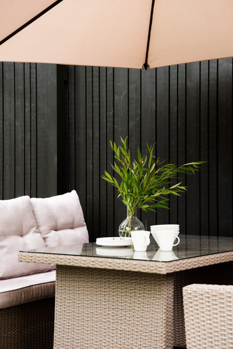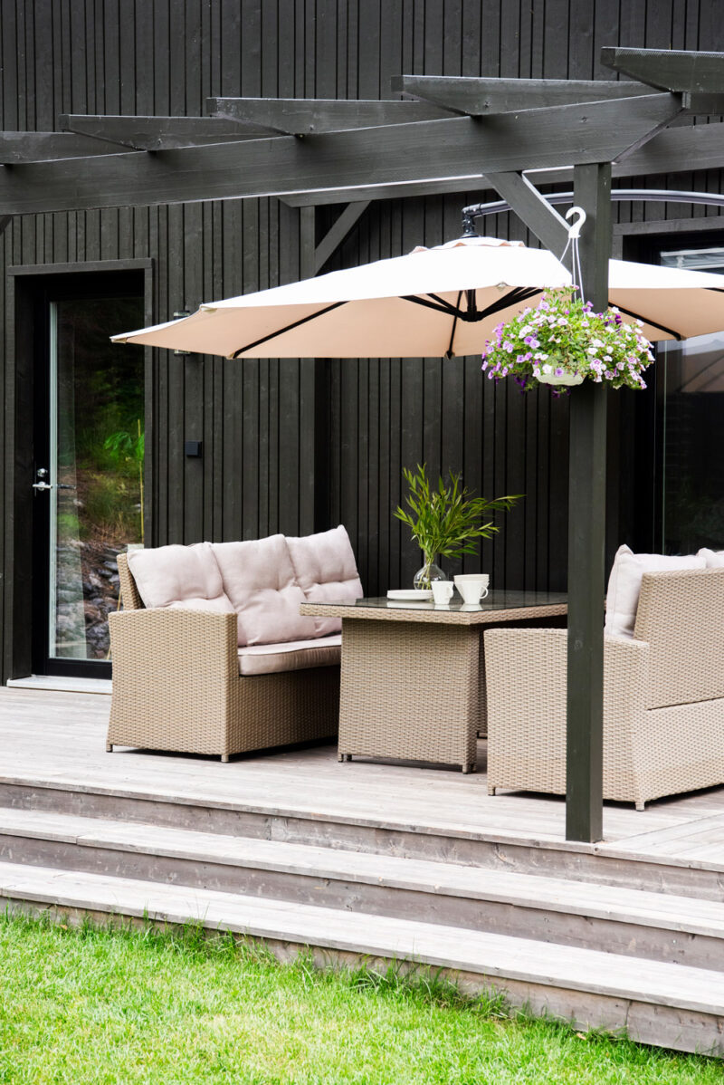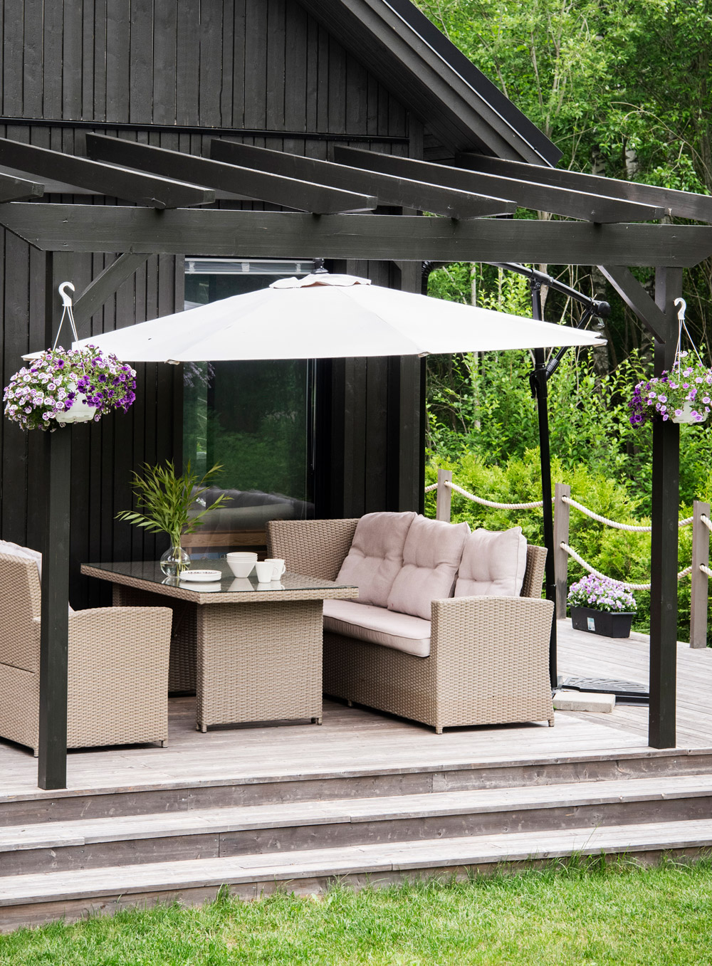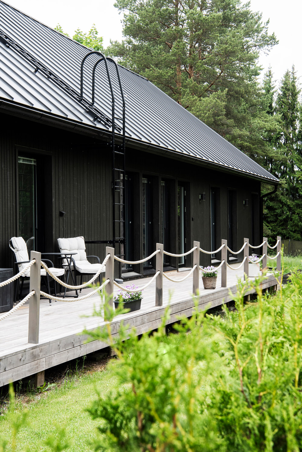 Talon eteläpäätyyn ja toiselle pitkälle sivulle rakennettiin L-muotoinen terassi Cent Pauha -terassilaudasta, joka on valmistettu kotimaisesta kuusesta. Päätyyn hankittiin pehmustettu istuinryhmä, jonka ääressä voidaan syödä kesällä.