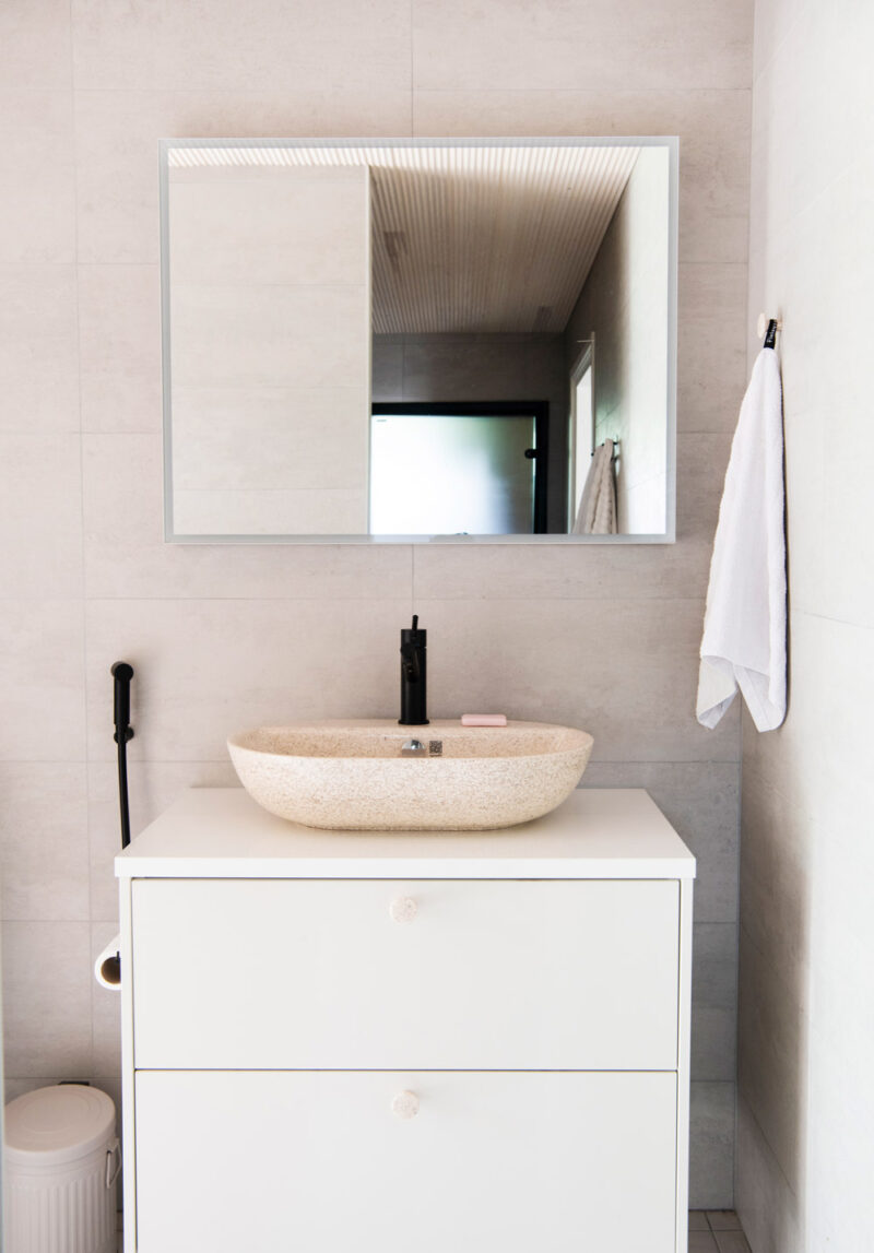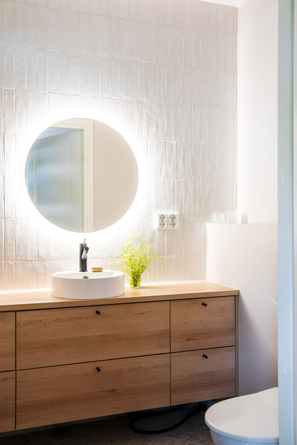 Vessan seinät kaakeloitiin Värisilmän Look R8FM Bianco Glossy -kaakeleilla, joiden käsin tehtyä vaikutelmaa valaistus korostaa. Puun värinen kaluste on Topi-Keittiöiden Aitta, sävy Rantapyökki AT13. Pyöreä, takaa valaistu peili Topi-Keittiöiden Lumi ja Lavuaari Topi-Keittiöiden Vapy. Hana on Tapwellin-mallistosta.