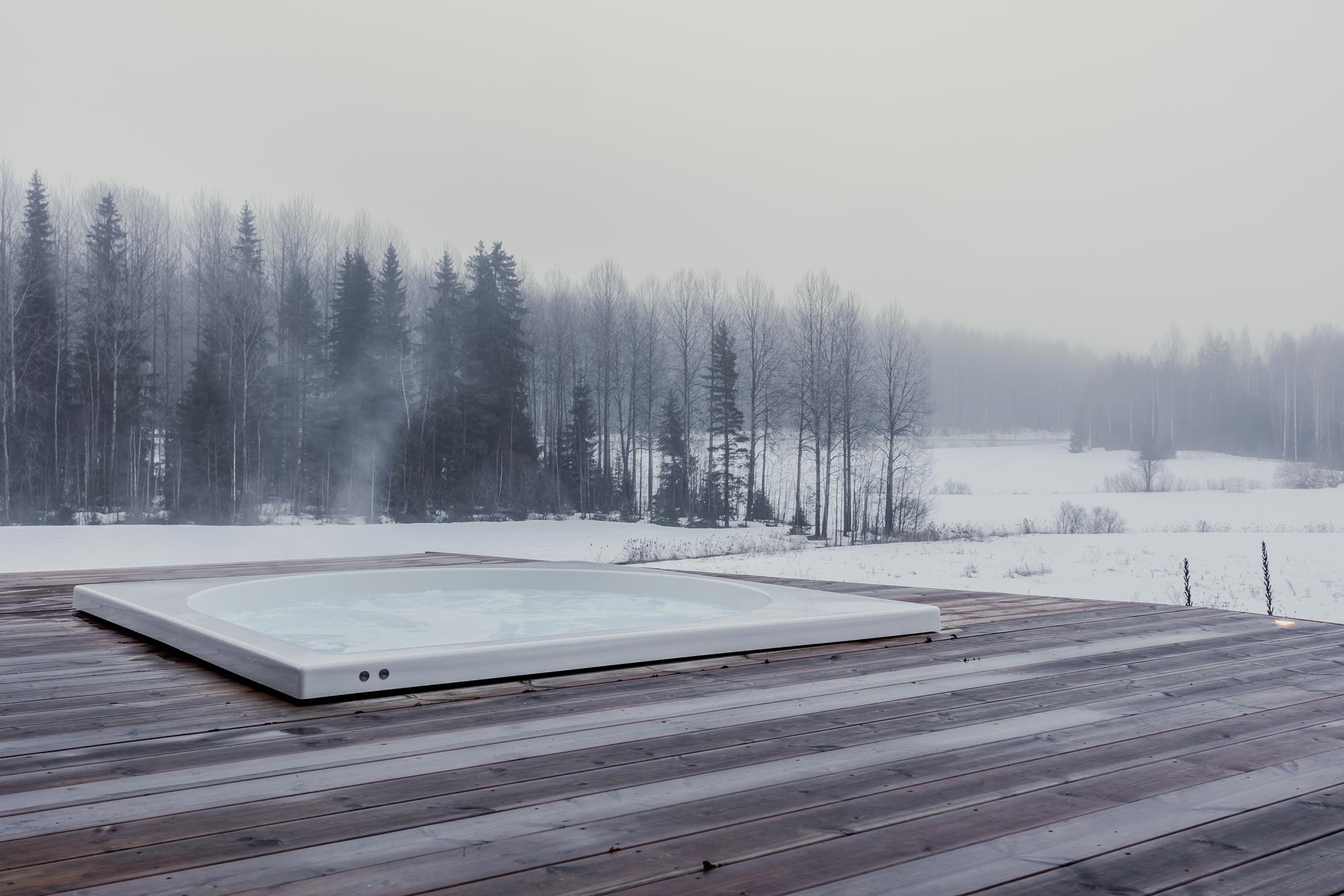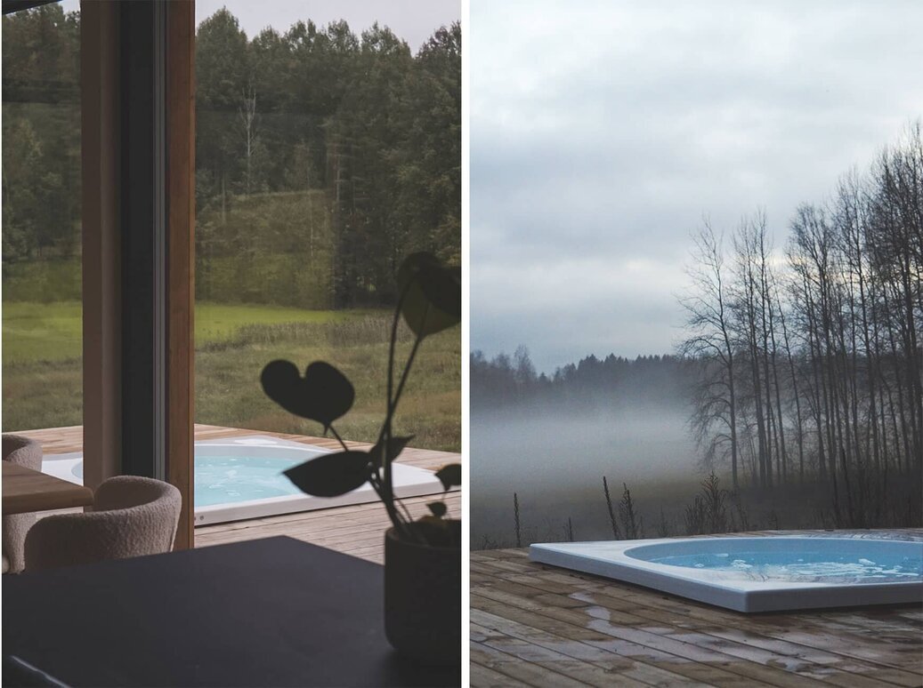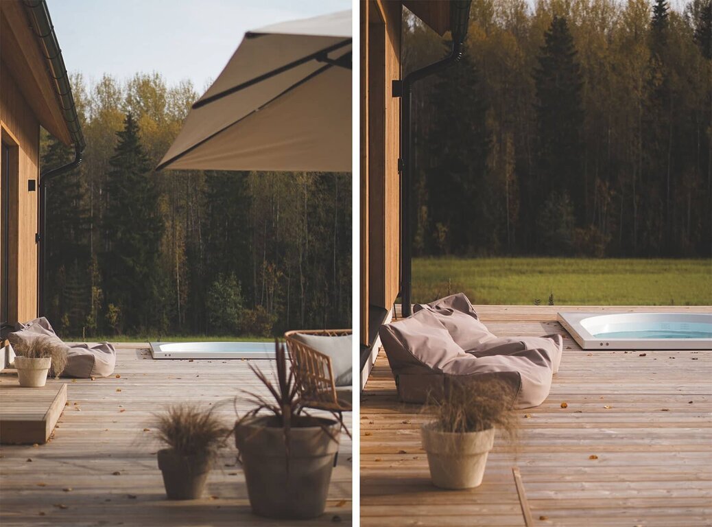 Kodin kaunista lähiympäristöä ihaillaan tunnelmalliselta terassilta, josta löytyy upotettuna Drop-ulkoporeallas. Piha on haluttu säilyttää mahdollisimman luonnonmukaisena ympäristöä kunnioittaen. Myös talon ulkoverhoilu käsiteltiin luonnollisen lopputuloksen aikaansaamiseksi sävytetyllä kuullotteella, joka tuo puupinnalle suojaa Suomen vaihtelevissa sääolosuhteissa. Kuullotteeksi valikoitui Tikkurilan Valtti Plus Color sävyssä Sora. Terassin laudoitus on tarkoitus käsitellä vielä samalla kuullotteella.