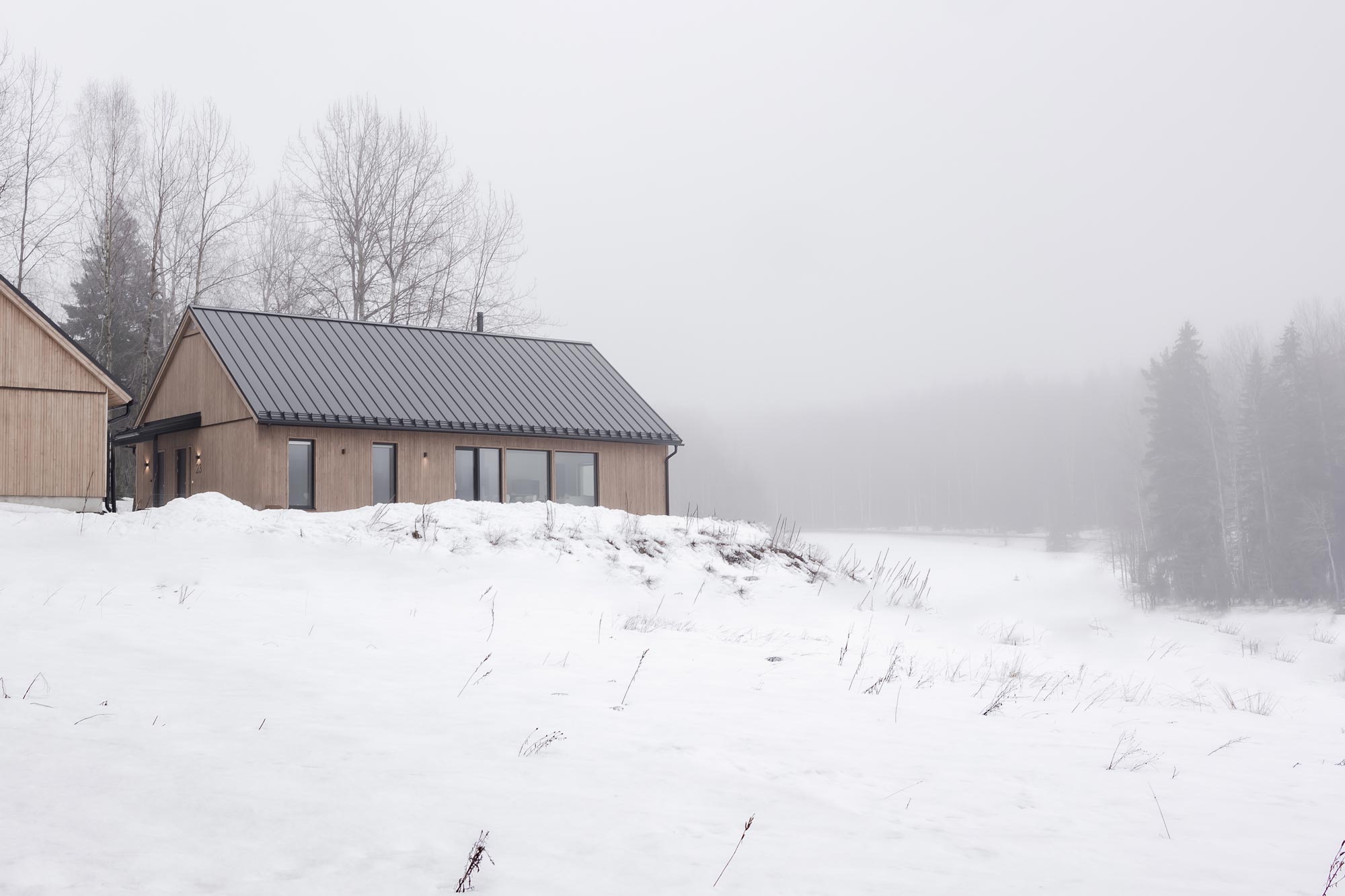 Talo saatiin suunniteltua päättyvän tien tontille täysin omaan suojaansa, sillä maisema suurista ikkunoista avautuu pellon puolelle. Kylpytilat oivallettiin sijoittaa naapurin vastaisen seinän puolelle, jonka myötä oleskelutiloissa ja terassilla nautitaan täydestä yksityisyydestä.