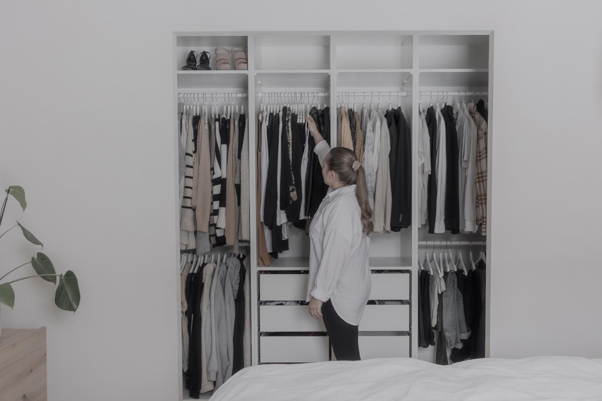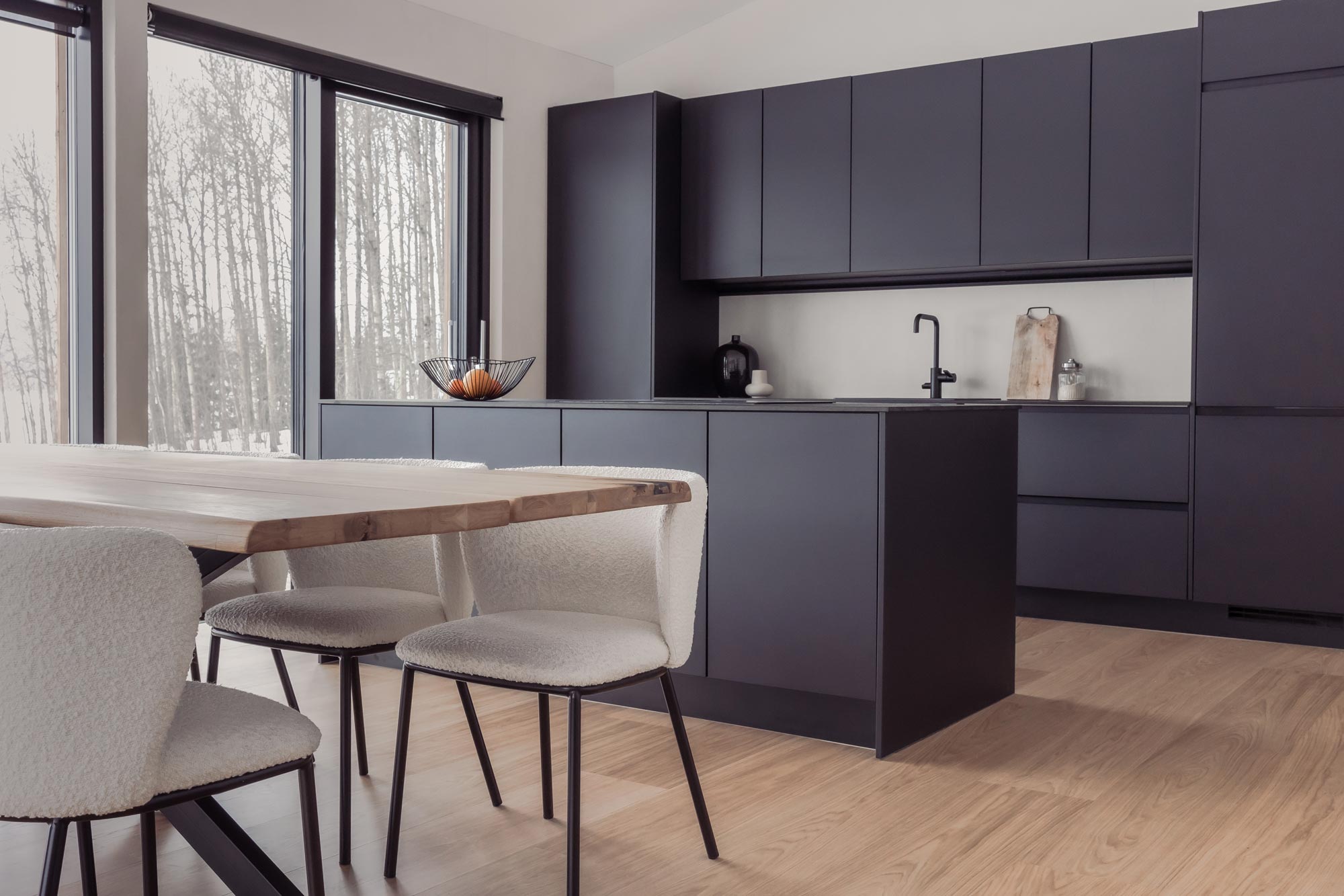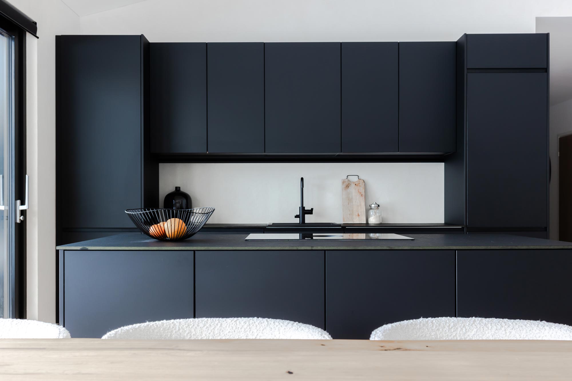 Oviin valittiin käytännöllinen anti fingerprint-käsittely, joka on osoittautunut erityisen hyväksi valinnaksi. Tasomateriaalina keittiössä toimii kivikomposiitti. Kodinkoneet on integroitu kaapistoihin, joka mahdollisti tämän minimalistisen ja tyylikkään kokonaisuuden. Aamiaiskaappi kätkee sisäänsä pienkodinkoneet kuten mikron, kahvinkeittimen ja leivänpaahtimen. Hana on hankittu Tapwelliltä ja induktiotaso on Boran. Puinen ruokapöytä löytyi Finnlandian valikoimasta ja teddykankaiset tuolit on hankittu Kave Homelta.