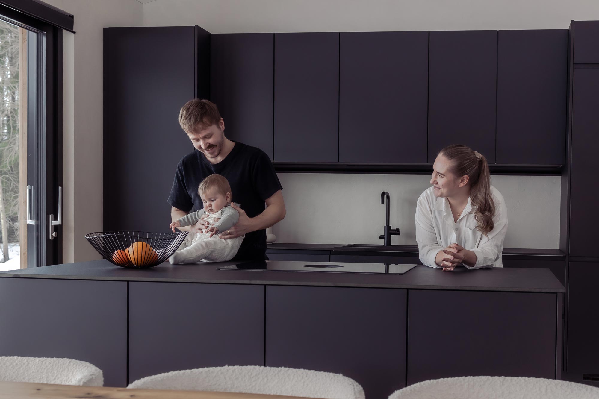 Kodin keittiöstä on suoraan käynti terassille, joka helpottaa ruokailutarvikkeiden kuljettamista keittiön ja terassin välillä. Mieleinen ja perheen tarpeisiin sopiva mattamusta keittiö löytyi Noblessalta. Musta ja selkeälinjainen keittiö olikin alusta lähtien parille selvä valinta. Keittiön suunnittelussa panostettiin riittävään säilytys- ja tasotilaan.