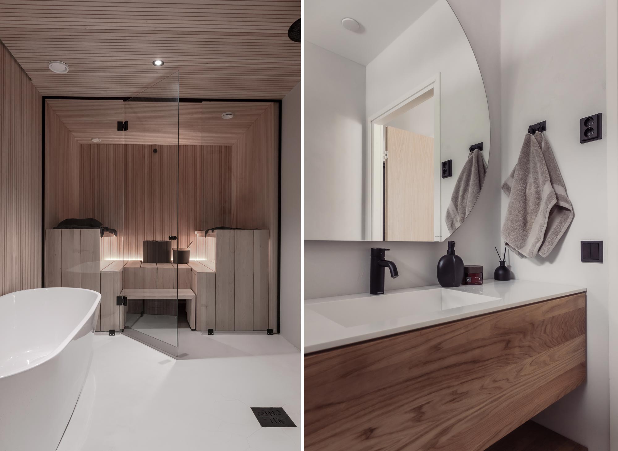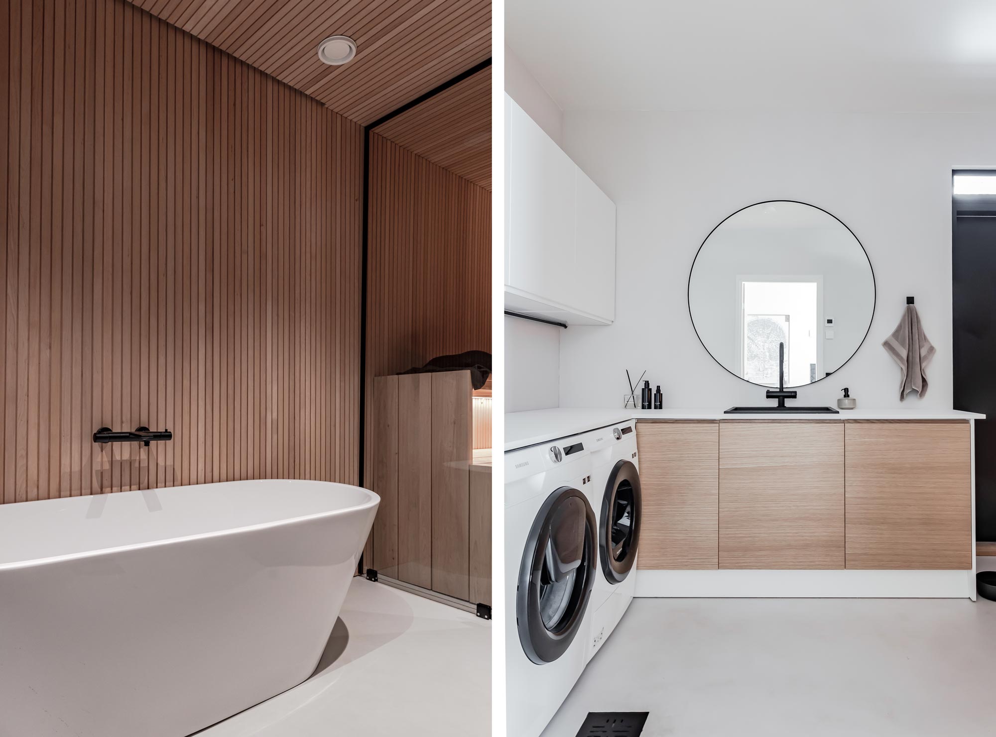 Kylpyhuoneen lopputuloksesta oli pariskunnalla mielessään vahva ja selkeä visio. Sanni oli haaveillut omasta kylpyammeesta koko elämänsä ja se oli yksi niistä asioista, mistä tässä kodissa ei tingitty. Kylpyamme olikin yksi rakennusprojektin ensimmäisistä ostoksista. Suomen Tervaleppä Oy toimitti saunan puumateriaalit ja pariskunta toteutti lauteet sekä rimoitukset itse tervalepästä. Minimalistinen ja rauhoittava kylpyhuone pinnoitettiin Basebetonilla, jonka ansiosta tila on saumaton ja helposti puhtaana pidettävä. Kiuas on Tulikiven Sumu. Arjen luksusta lisäämässä on älypuhelimella ohjattavat kylpyhuoneen toiminnot.