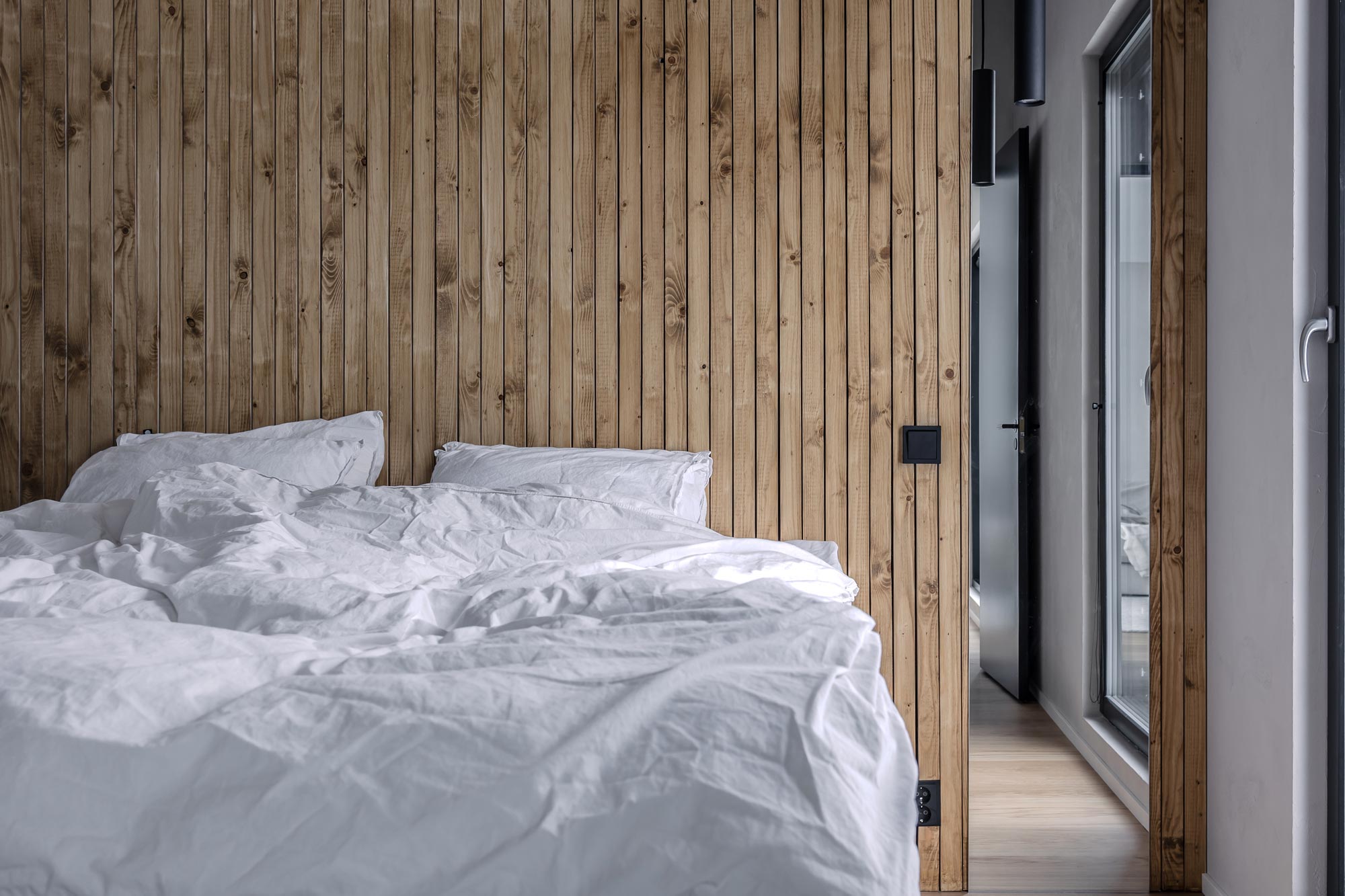 Talon perältä löytyvän vanhempien makuuhuoneen suunnittelussa lähdettiin hakemaan hotellitunnelmaa puurimoituksineen, roikkuvine valaisimineen ja kapeine pystypeileineen. Makuuhuoneen yhteydestä löytyy walk in-closet, jossa on runsaasti henkaritilaa perheen aikuisten vaatteille. Makuuhuoneen seinät ja katto pinnoitettiin Decorativin Travertino-kalkkilaastilla sävyssä Taupe.