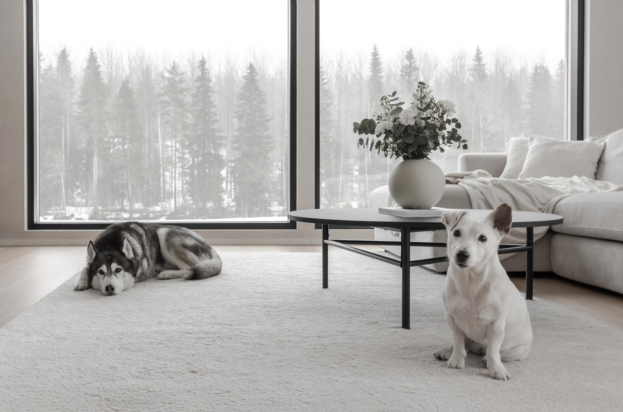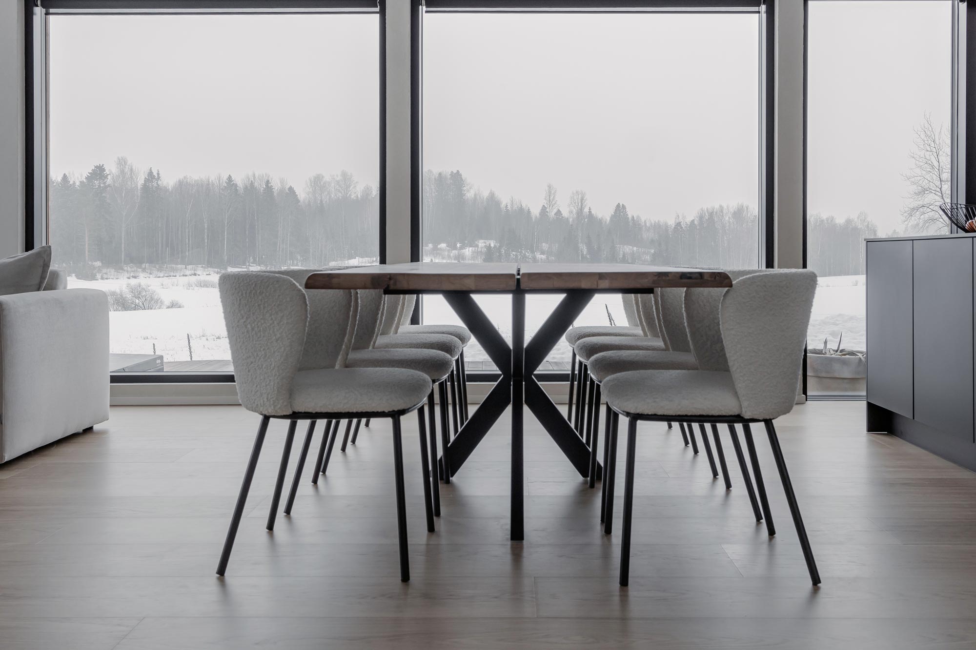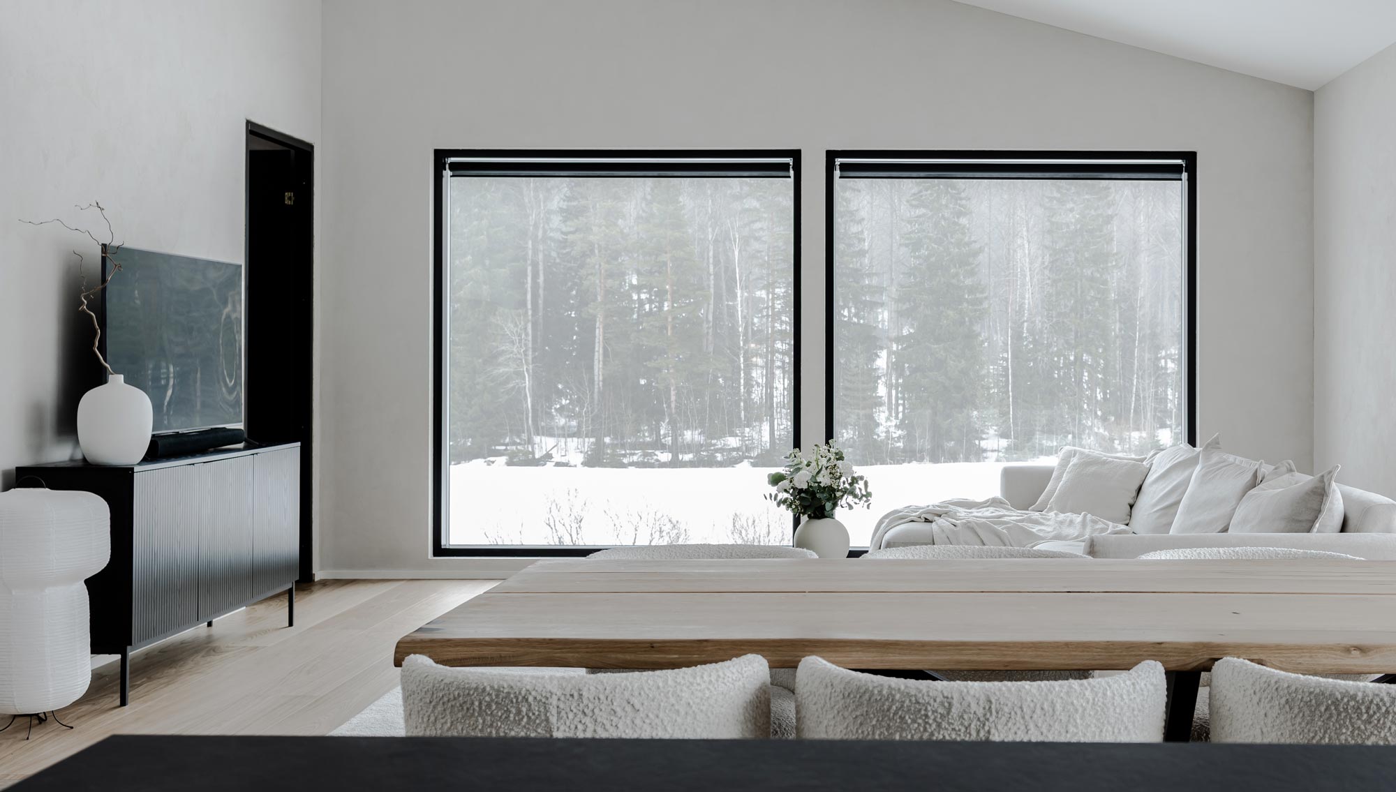Kodin suuriin ikkunoihin asennettiin sähköllä toimivat rullaverhot, jotka peittävät tehokkaasti suurista ikkunoista sisään tulvivan auringonvalon. Läpinäkyvä screenkangas ei peitä kaunista näkymää, vaan luo näkösuojan ja helpottaa kesän paahteella. Kiinni ollessaan rullaverhot eivät juurikaan erotu ikkunoiden mustista karmeista.