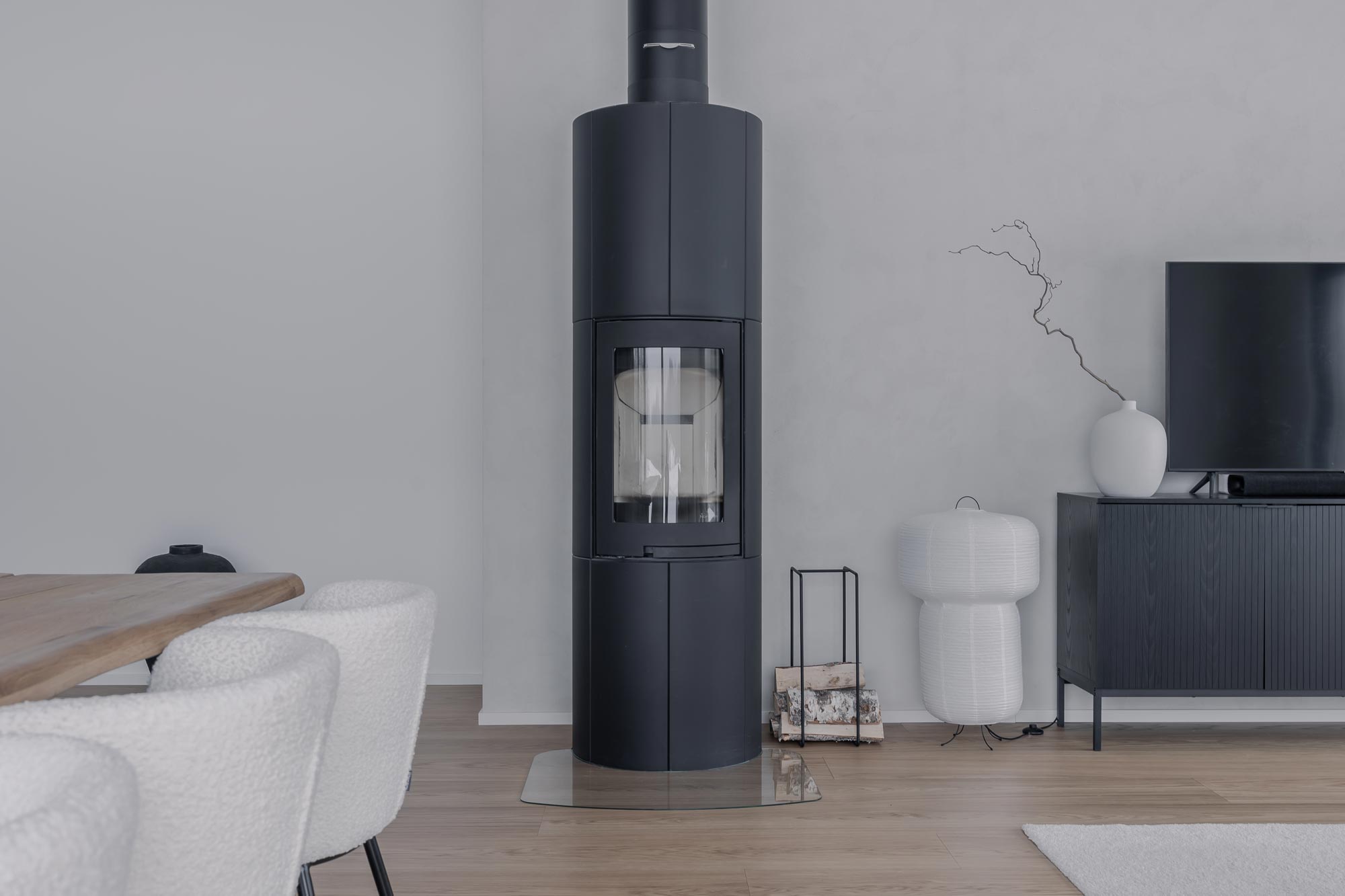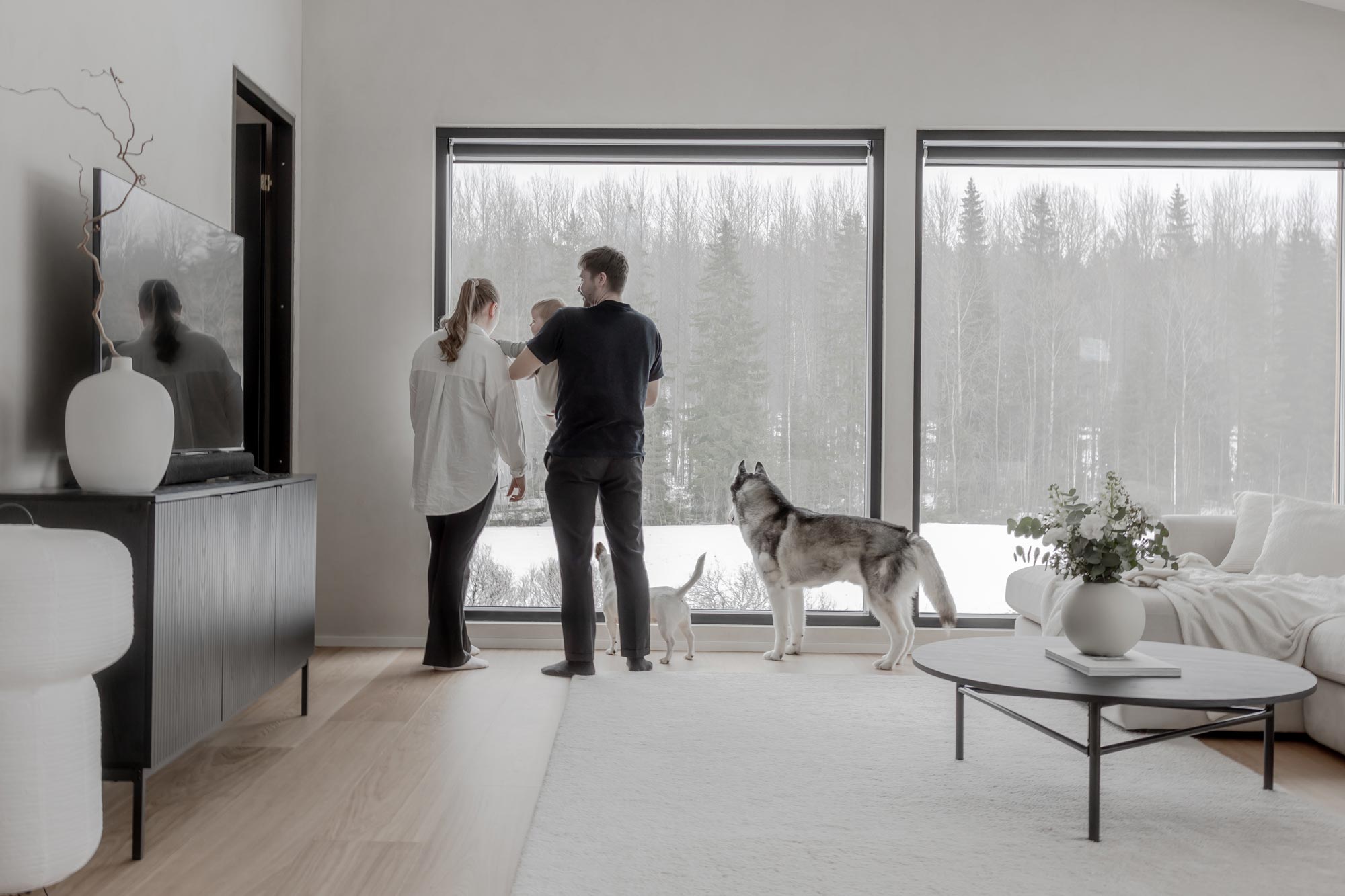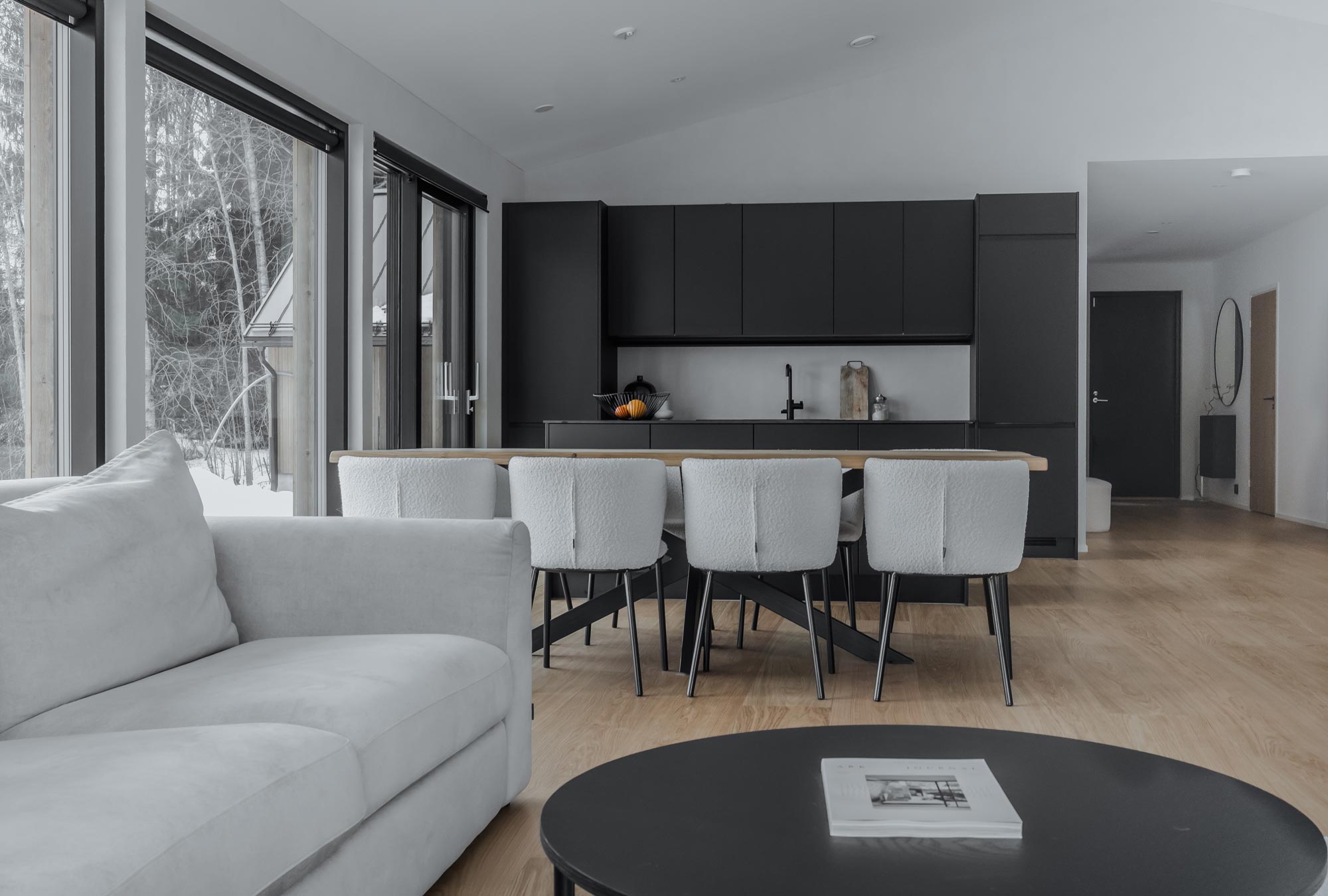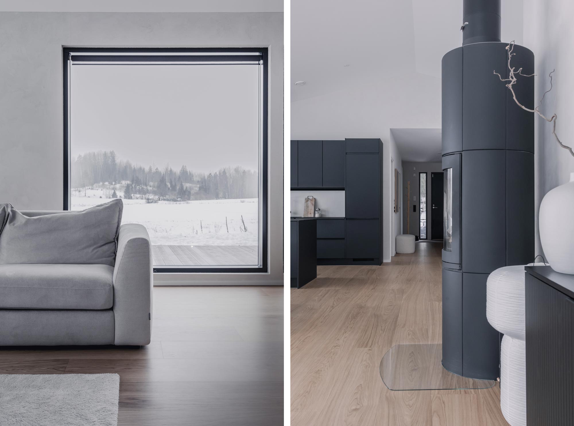 Olohuoneen katseenvangitsijana toimiva musta kivitakka tilattiin käytännössä saman tien, kun kaupat talotoimittajan kanssa oltiin tehty. Kauniin ulkomuotonsa lisäksi takka on toiminut talvella lämmön- ja tunnelmanluojana. Kodin taiteena toimii suurista ikkunoista avautuva luonnon maisemataulu, joka elää ja muuttuu kauniisti vuodenaikojen mukaan.