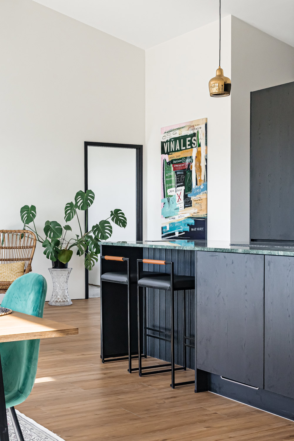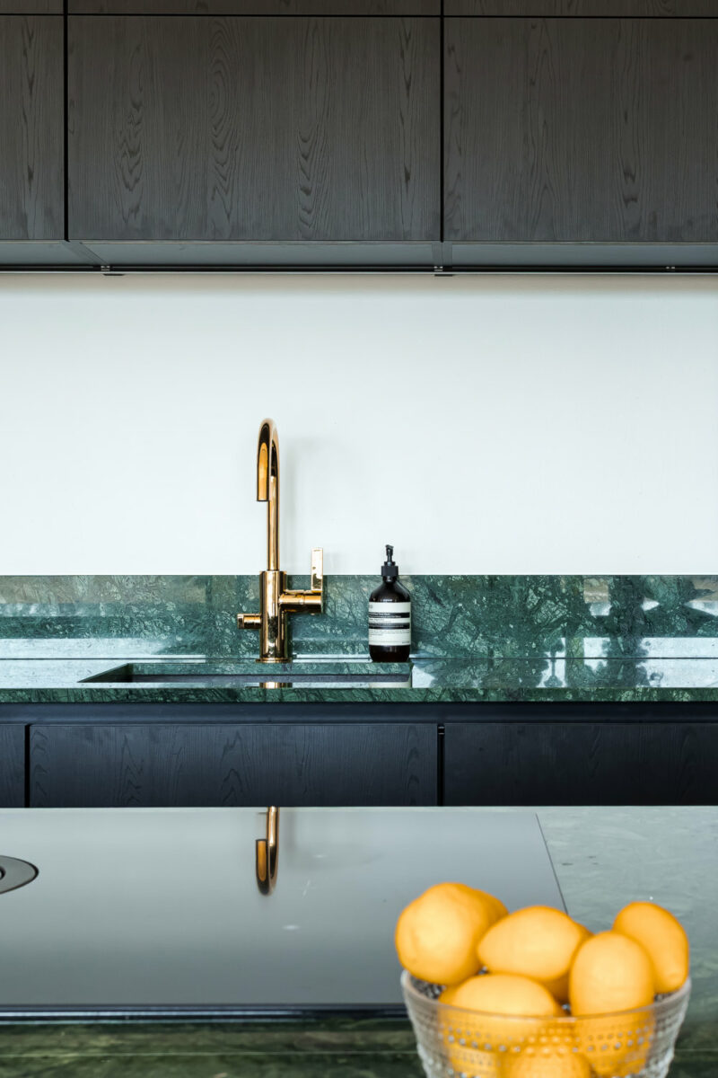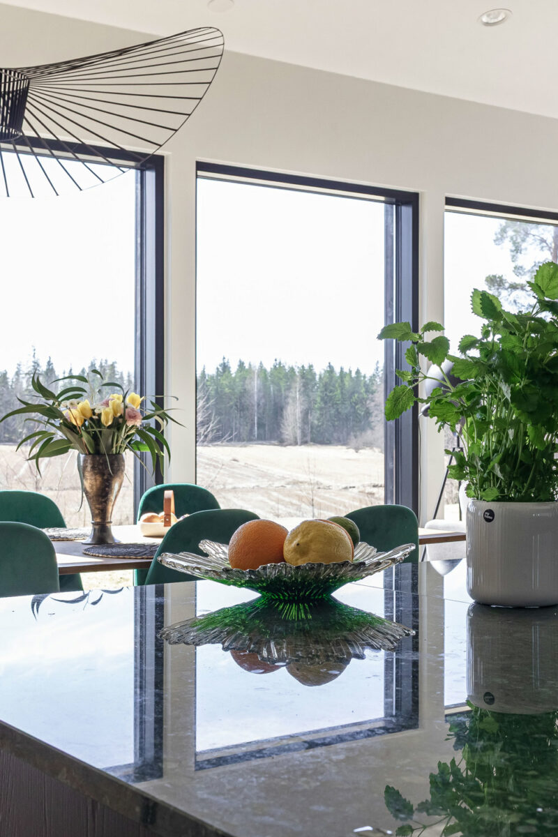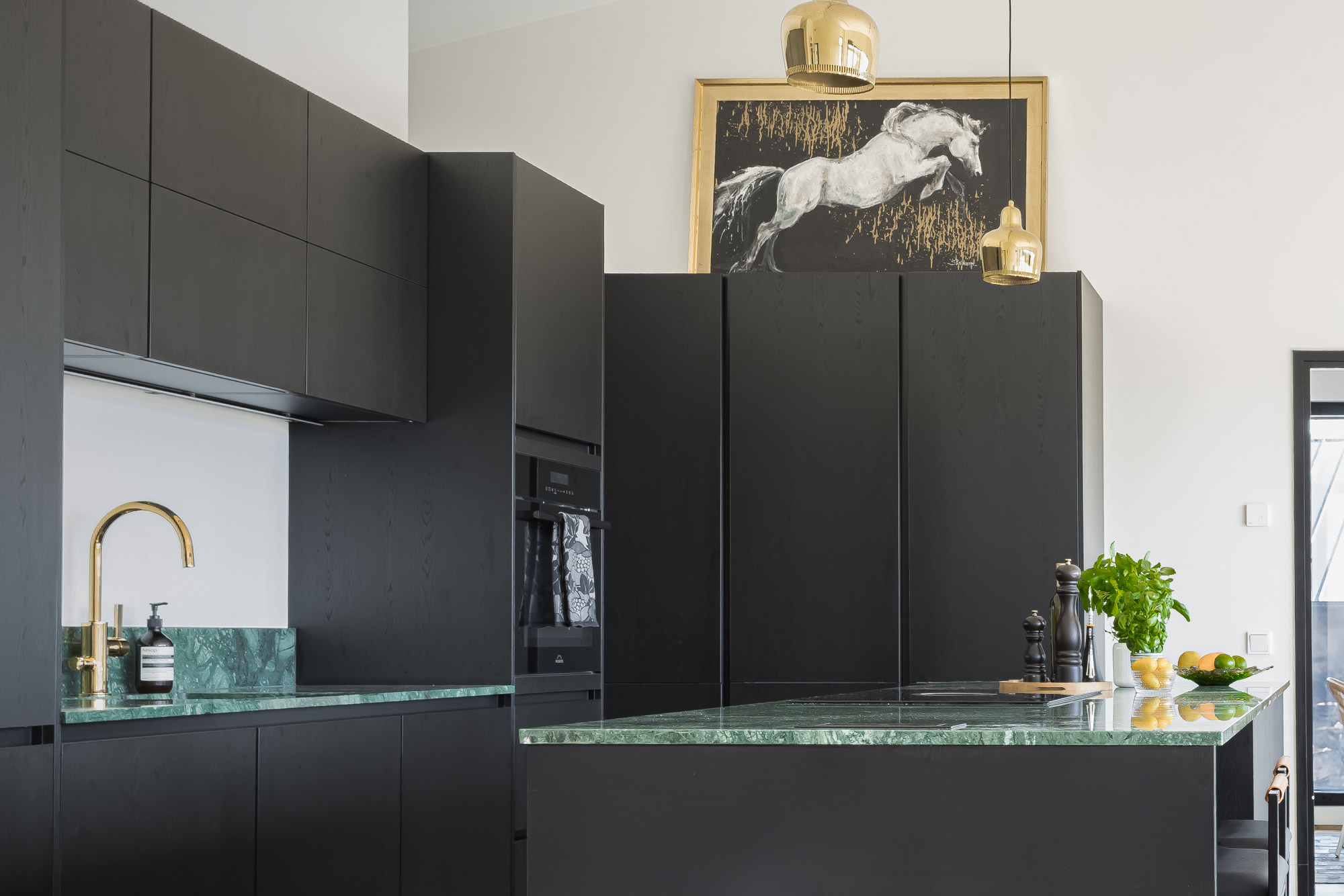 Keittiö toimi koko kodin suunnittelussa punaisena lankana. Alusta lähtien oli selvää, että kotiin tulisi musta keittiö pystysuuntaisella viilukuviolla. Viikonloppuisin pariskunta tykkää kokkailla yhdessä ja keittiö on kodin sydän. Suuri saareke on kolme metriä leveä ja siinä on keittotaso liesituulettimella. Vihreät marmoritasot ovat olleet yksi suosikkiasioista uudessa kodissa.