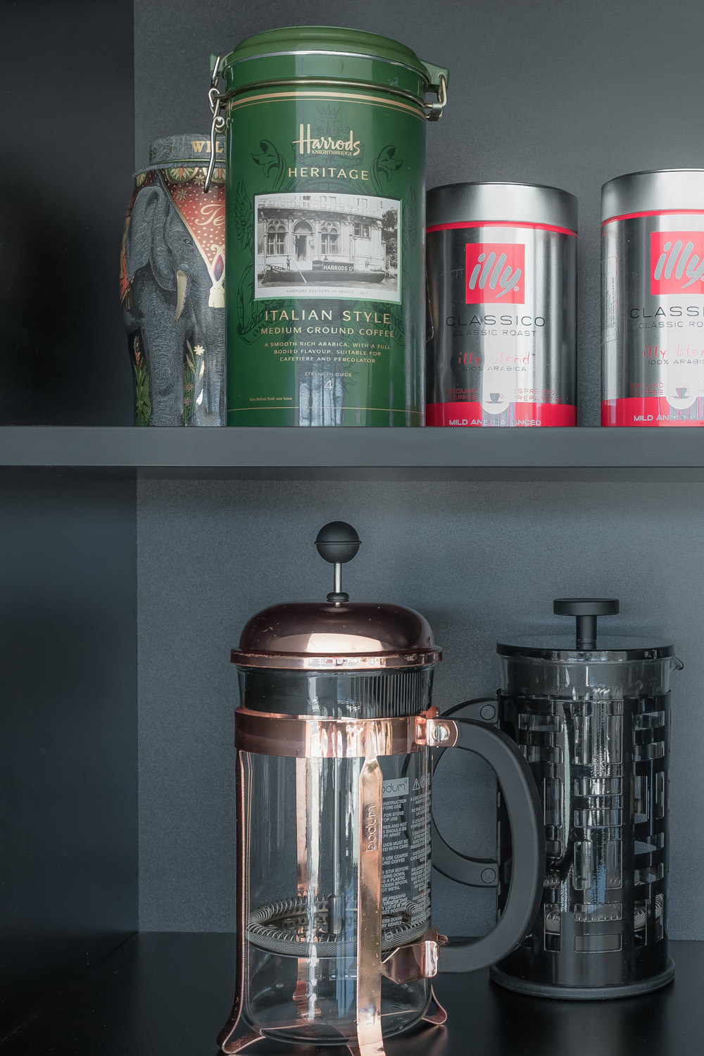 120cm:n levyinen aamiaiskaappi on ollut arjessa erityisen toimiva ratkaisu. Pariskunta kuvailee itseään kahvihifistelijöiksi. Siksi aamiaiskaapista löytyykin perinteisen kahvinkeittimen sijaan pressopannuja ja muita välineitä kahvin valmistukseen. Keittiö on Noblessan ja marmoritasot tilattiin virolaiselta toimijalta. Keittiö asennettiin itse.