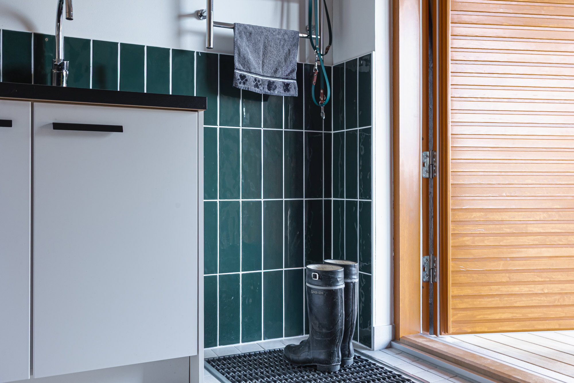 Kodinhoitohuoneeseen suunniteltiin oma uloskäyntinsä, jotta kuraisen koiran kanssa pääsee sinne suoraan pesulle. Kura-allas on ollut kätevä arjessa aktiivisen koiran kanssa.