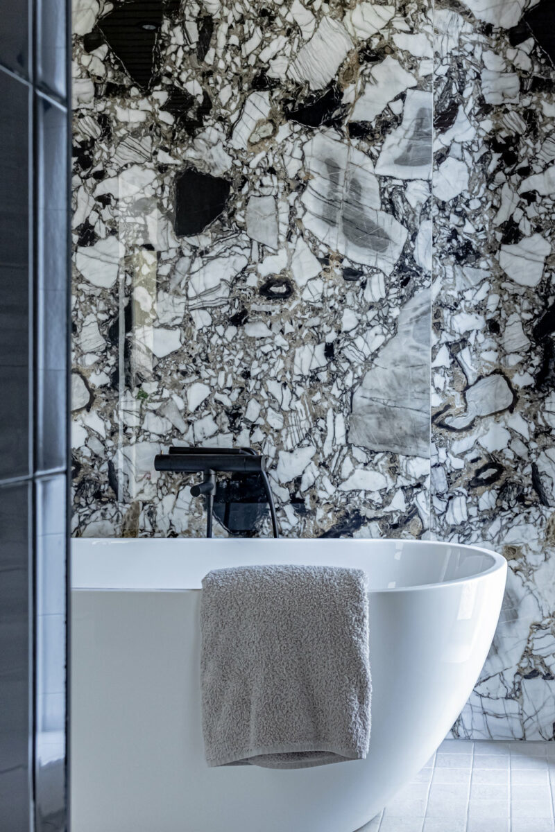 Kylpyhuoneen, makuuhuoneen ja vaatehuoneen yhdistelmä on pariskunnan ikioma hotellisiipi. Kylpytiloihin haettiin spa-tunnelmaa ja sinne haluttiin suurten laattojen lisäksi kylpyamme. Suuret laatat löytyivät Caisla-laattojen valikoimasta. Muut seinälaatat löytyivät ABL-laattojen poistomyynnistä ja Pukkilan lattialaatat toisen rakennustyömaan ylijäämänä. Laatoituksiin palkattiin ulkopuolinen ammattilainen.