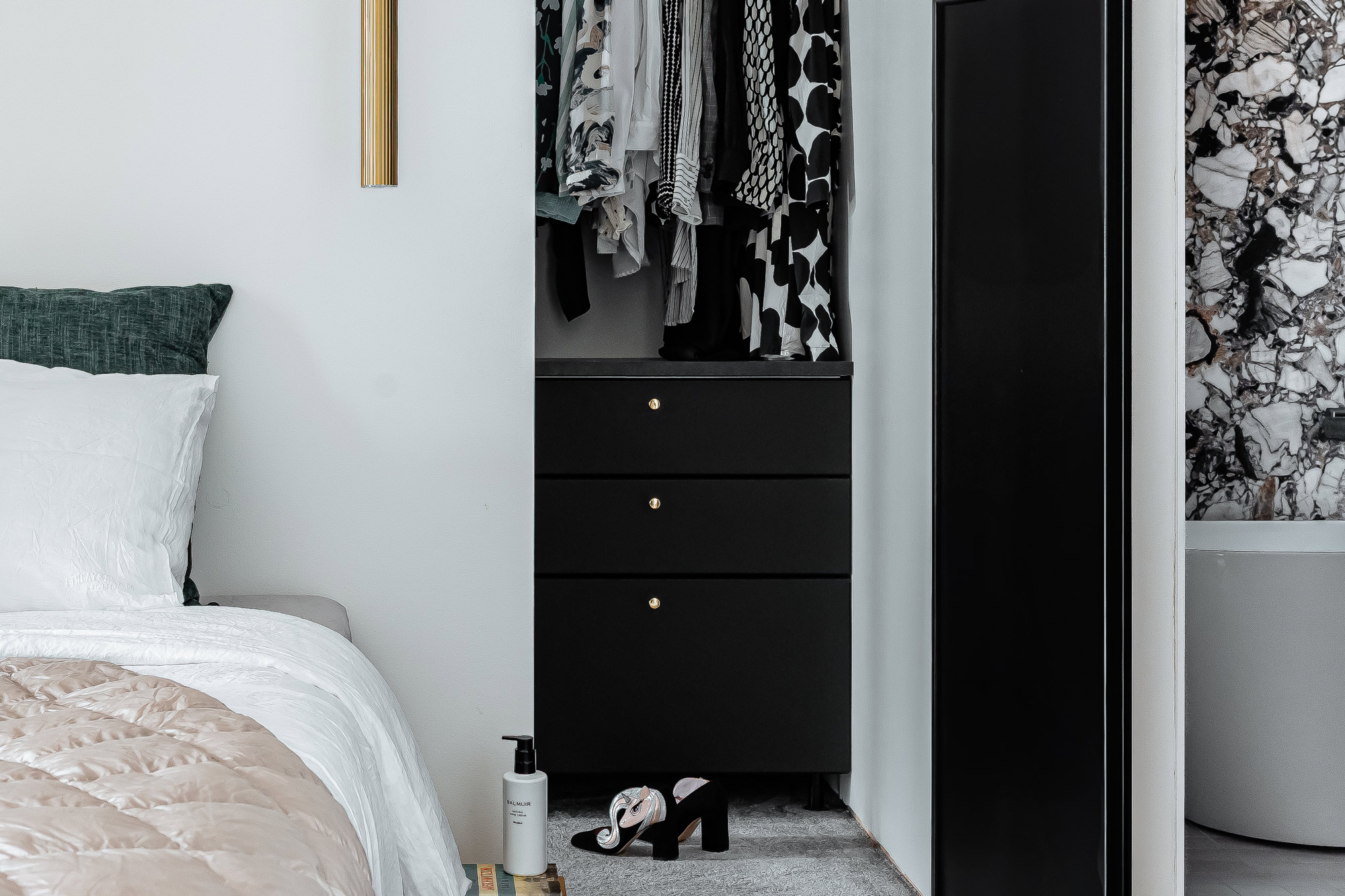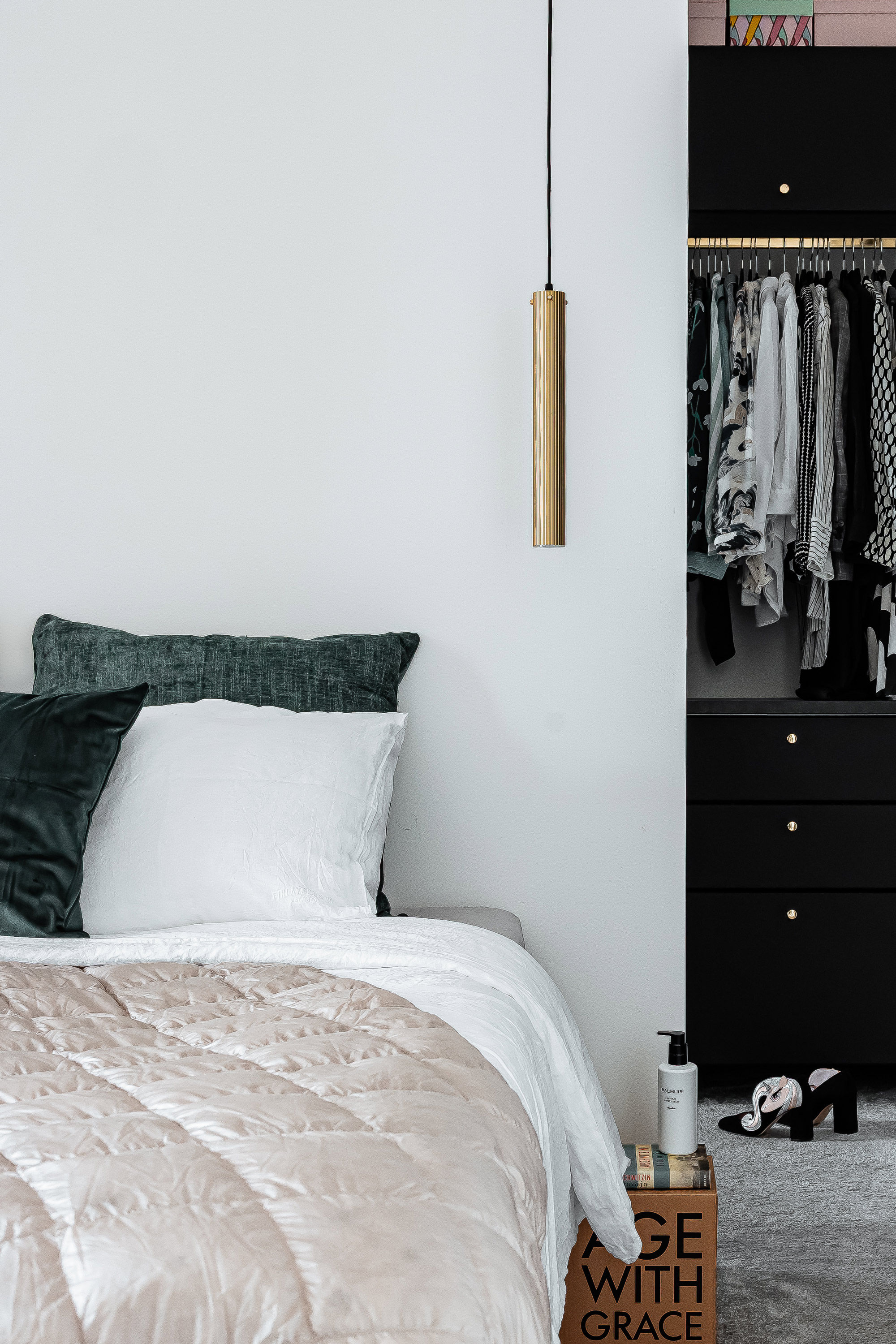 Yöpöytinä toimivat kauniit pahvilaatikot, jotka ovat hauska budjettiratkaisu. Pukeutumisesta ja kengistä pitävälle Satumaijalle vaatehuone oli unelmien täyttymys.