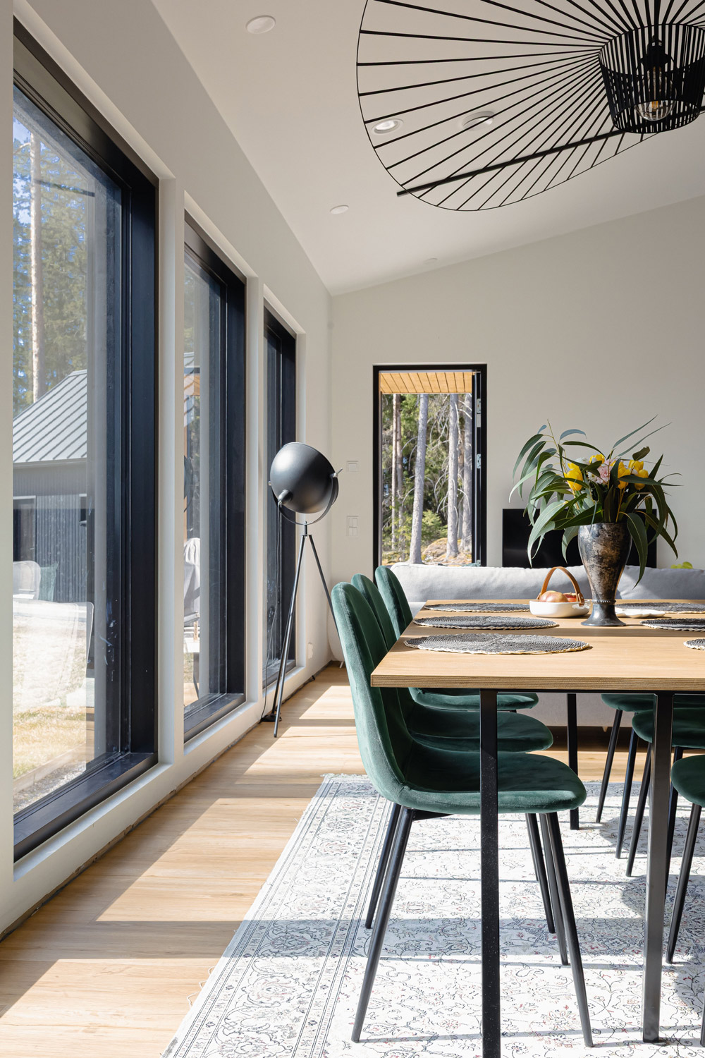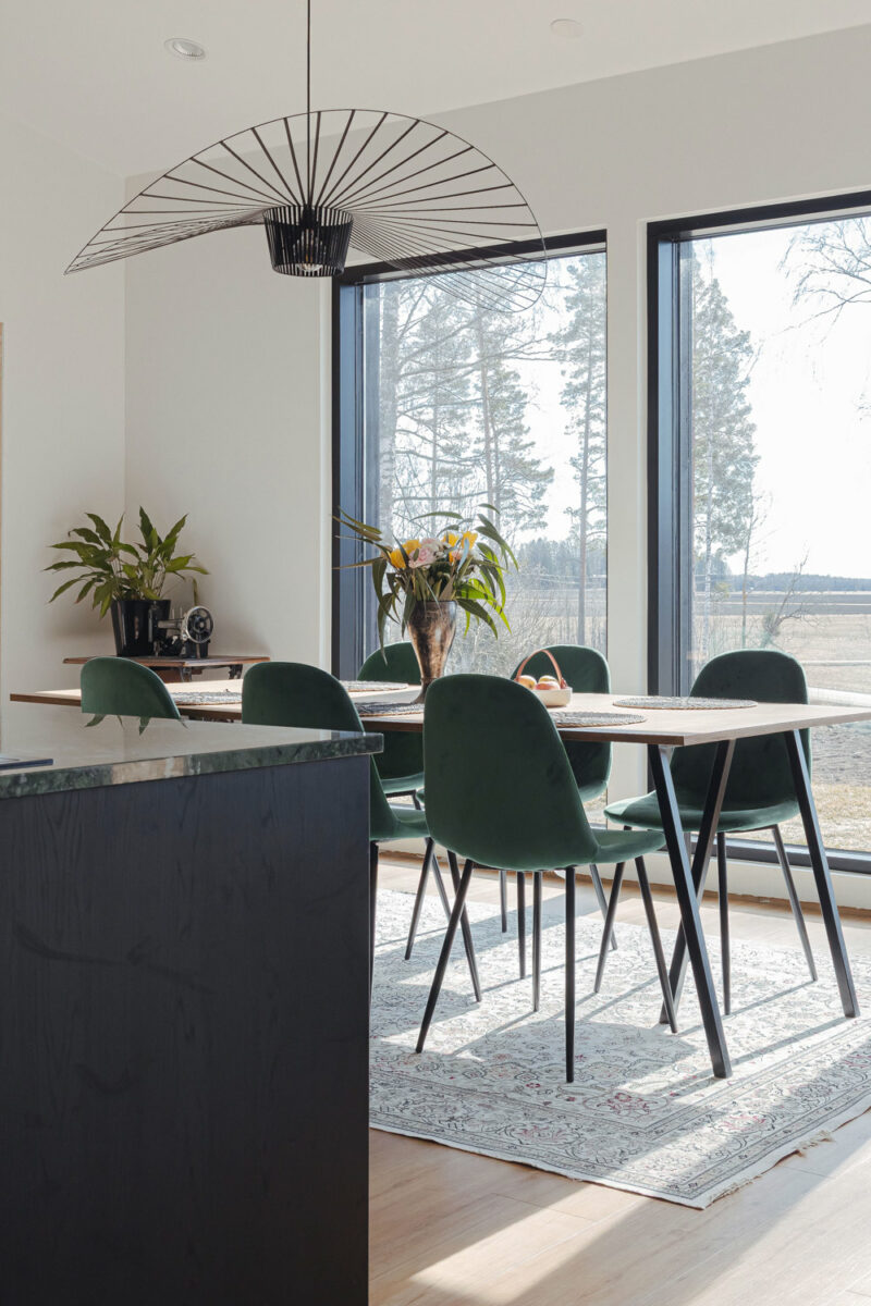Kodin lattiamateriaaliksi valikoitui Parador Classicin vinyylilankku. Edellisessä kodissa lattia oli laminaattia ja herkkäuninen Henri heräsi usein öisin koiran kynsien ääniin. “Arjessa suuri ruokapöytämme on hyvin vähällä käytöllä. Sen ääressä tehdään lähinnä välillä töitä, mutta syömme usein sohvapöydän ääressä”, Satumaija kertoo.