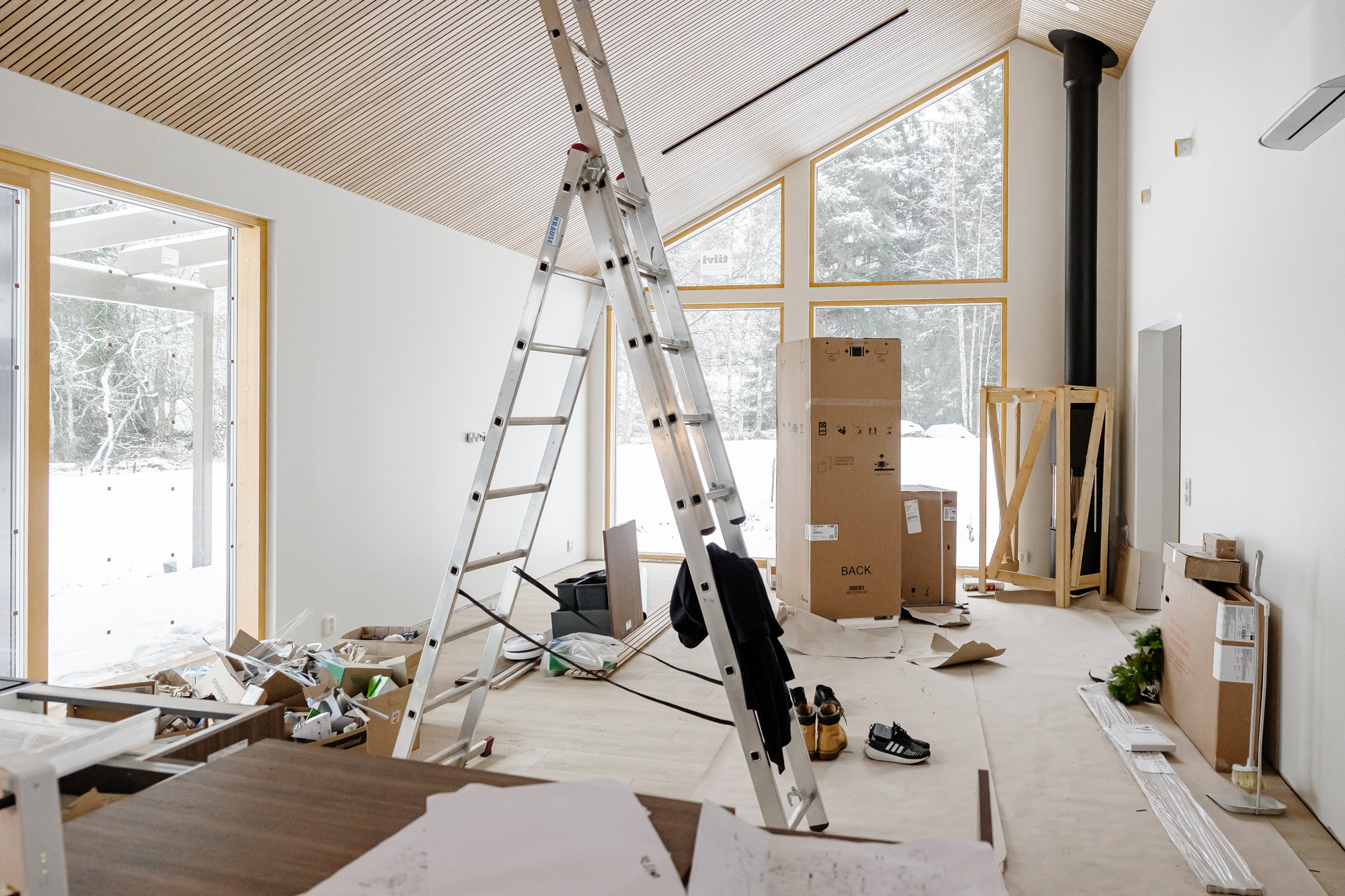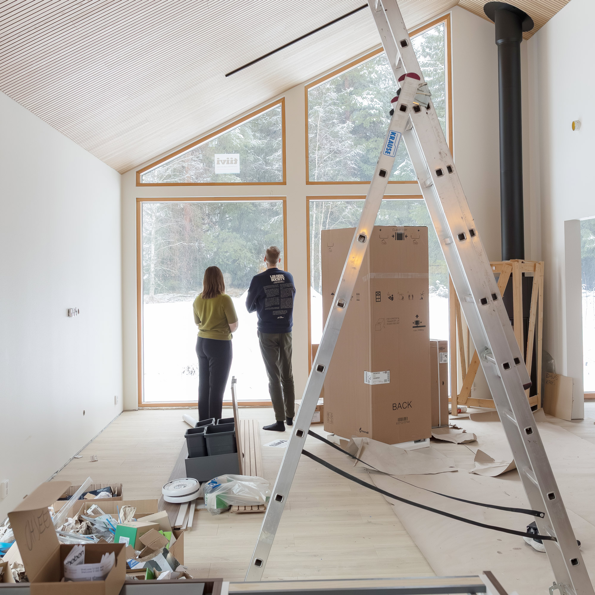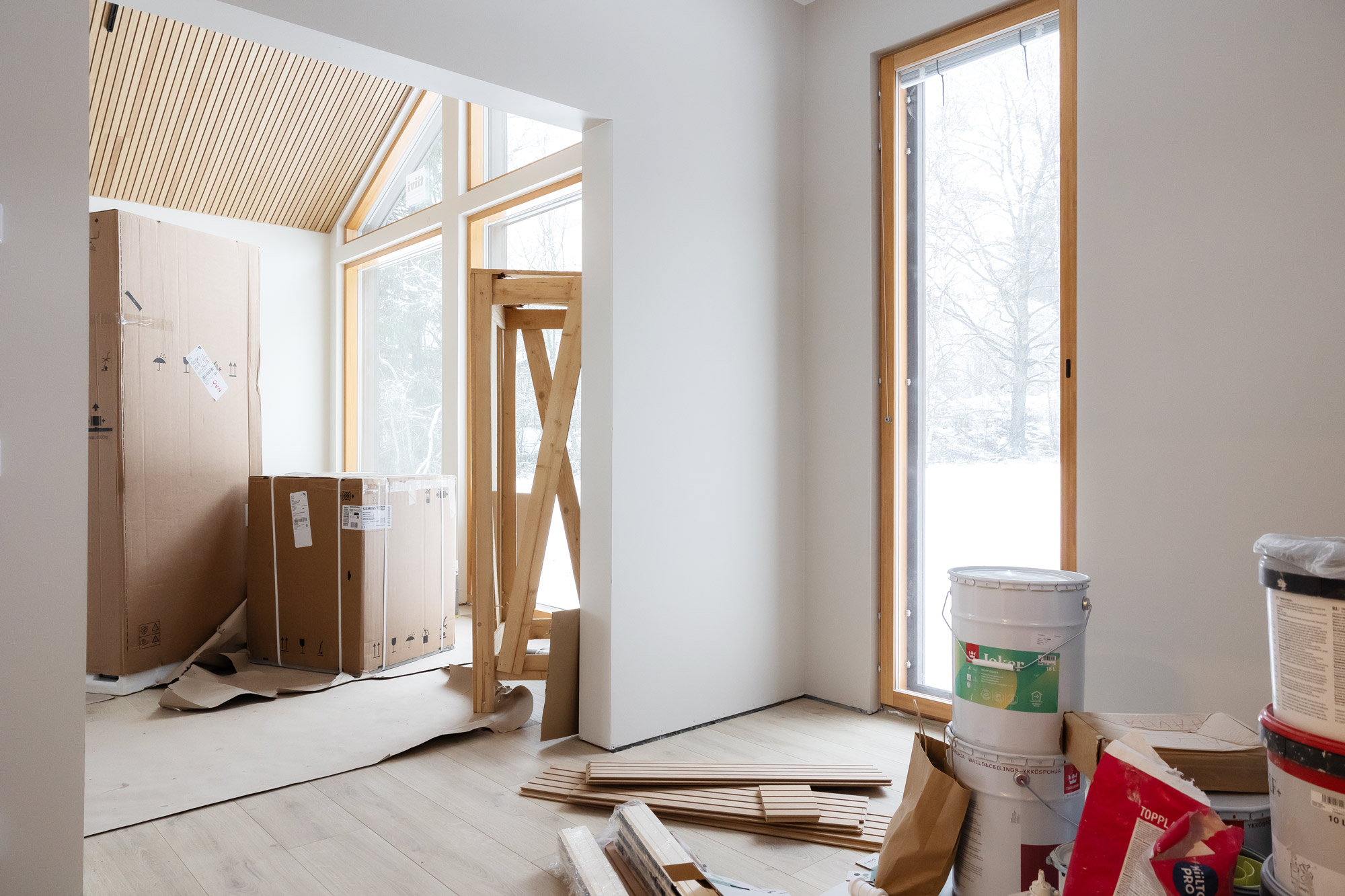 – Minun mielestäni täällä ei kyllä tunnu vielä kotoisalta, vaan lähinnä ahdistaa tämä keskeneräisyys. Tältä täällä tulee näyttämään vielä pari kuukautta. Lassi on käynyt talolla nyt enemmän, itse en niin paljoa. Joudun välillä hieman välttelemään tänne tulemista, etten alkaisi vielä kunnolla siivoamaan, Eveliina nauraa.