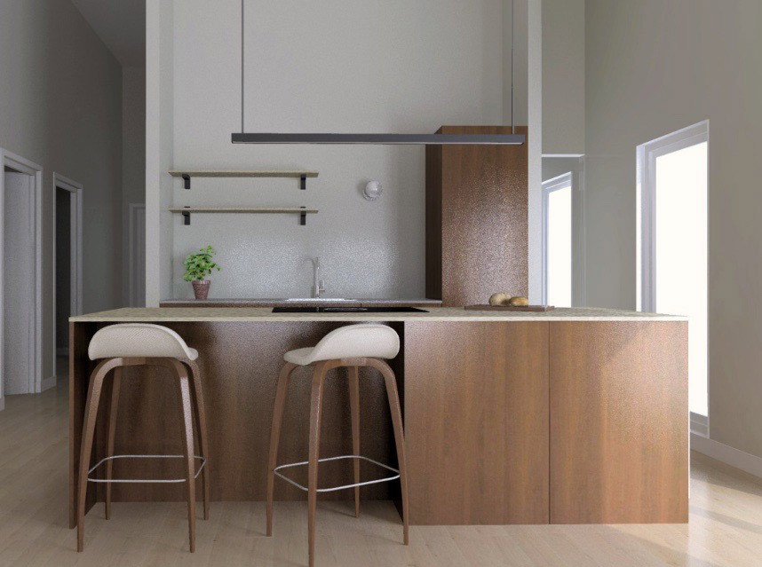Kodin materiaalivalintojen ja keittiön suunnittelun tukena hyödynnettiin mallinnettuja kuvia. Havainnekuva Cassandra Correa, Woodio.