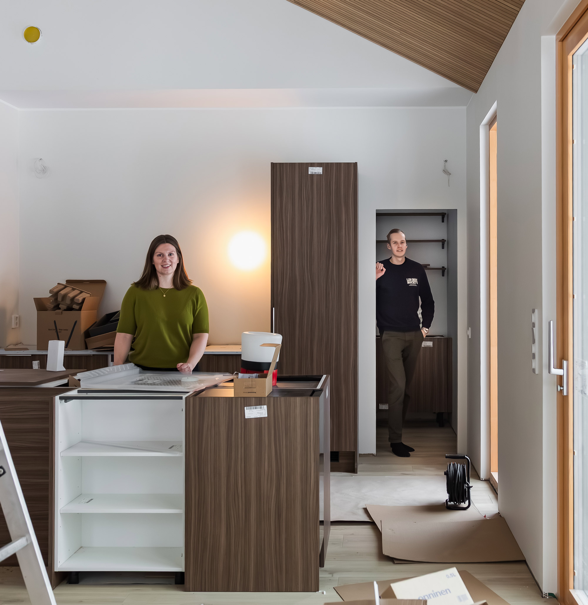 – Täällä alkaa tuntua pikkuhiljaa kotoisalta. Ja täähän on jo melkeen valmis! Mutta ei viitsi vielä liikaa innostua, kun muuttoon on niin paljon aikaa. Olemme todenneet, että meidän tarvitsee hankkia kauheasti uusia huonekaluja. Ja olemme nauraneet, että kuka tämän kaiken sitten siivoaa? Tulevassa kodissamme odotan eniten sitä, että on omaa pihaa ja tilaa puuhastella, Lassi kertoo.