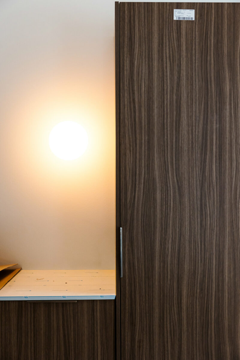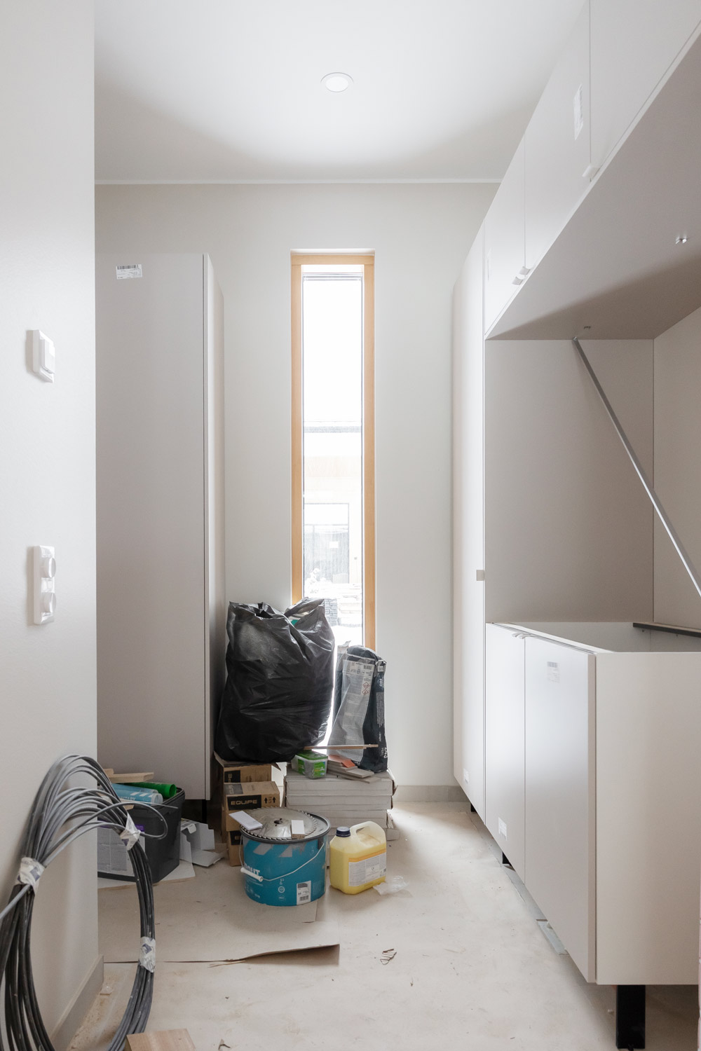 Kodinhoitohuoneen kiintokalusteiden sävyksi valikoitui ajaton Cashmere. Kapean ja korkean pystyikkunan ansiosta pyykkejä tullaan viikkailemaan ihanasti luonnonvalossa. Tavatessamme työmaalla Eveliinan ja Lassin kanssa marraskuussa, pääsivät he näkemään valmiit laatoitukset ensimmäistä kertaa. “Tää pystylaatta on ihan törkeen hienoa!”, Eveliina riemuitsi.