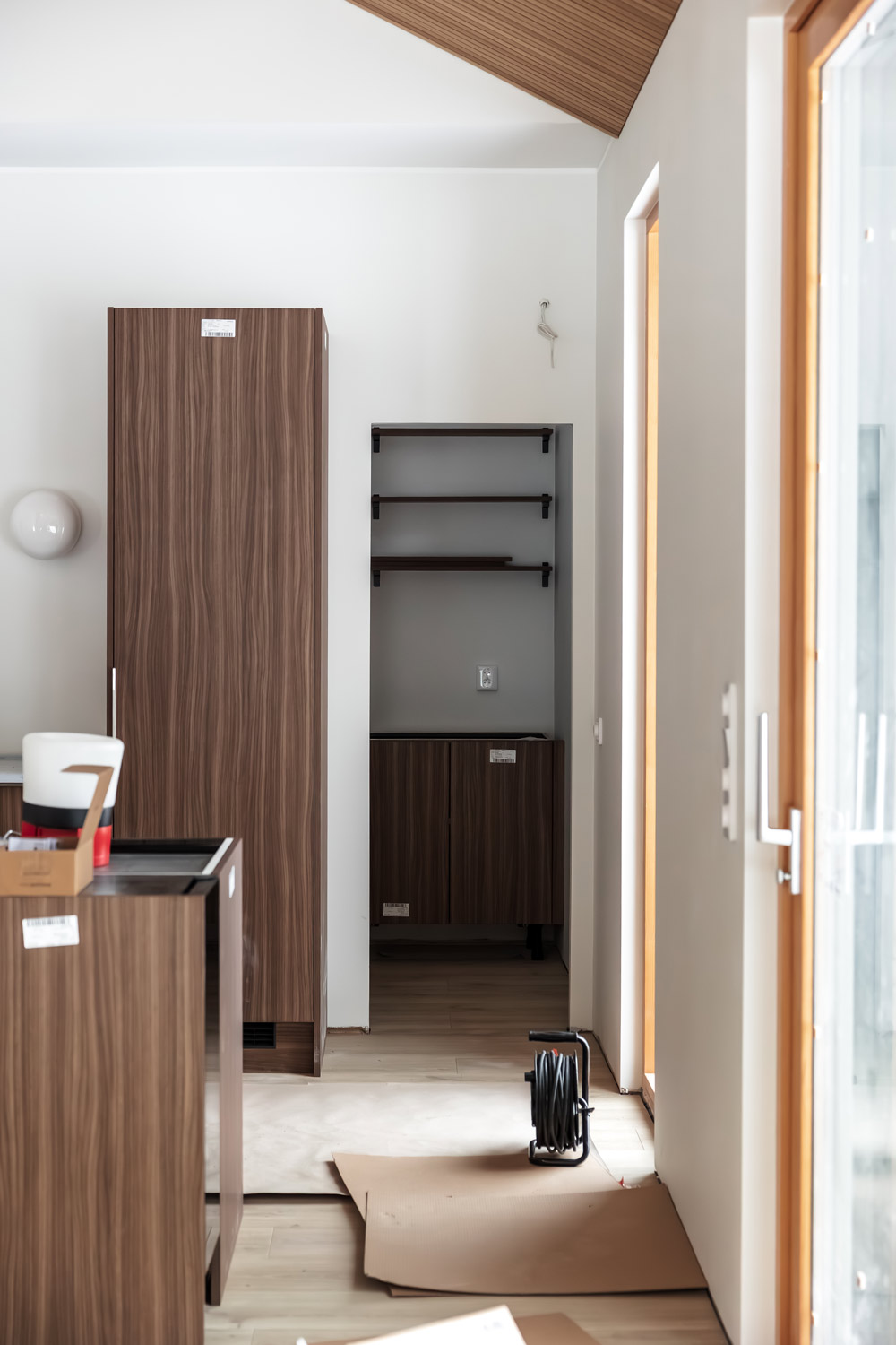 Kodin ensimmäisissä suunnitelmissa ei ollut vielä mukana Eveliinan haaveilemaa pantryä eli ruokakomeroa. Se päädyttiin lisäämään jälkikäteen, kun Lassikin innostui ajatuksesta. Pantryyn suunniteltiin säilytystilaa sekä paikat mikrolle, pakastimelle, kierrätyspisteelle sekä keittiön pienkoneille.