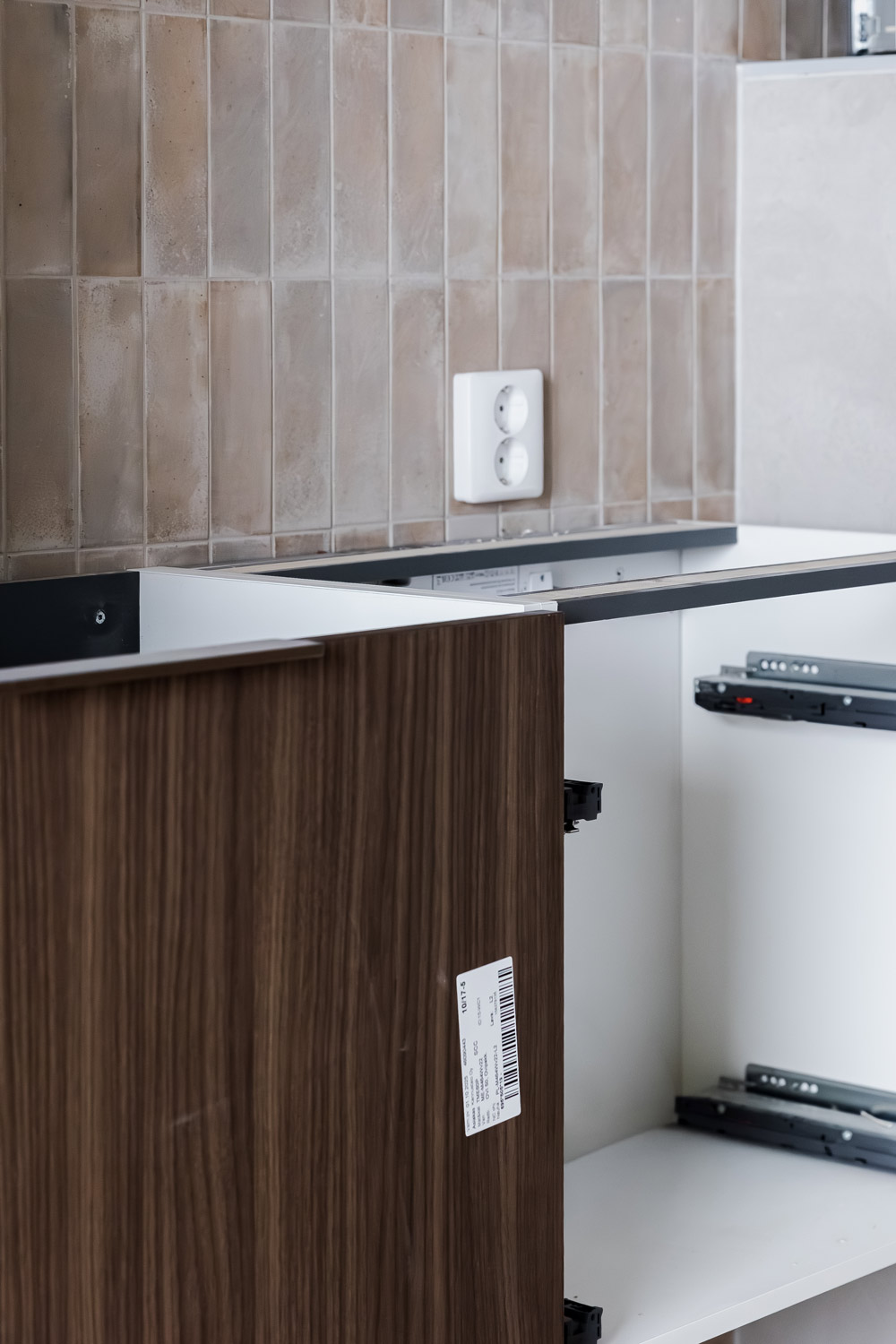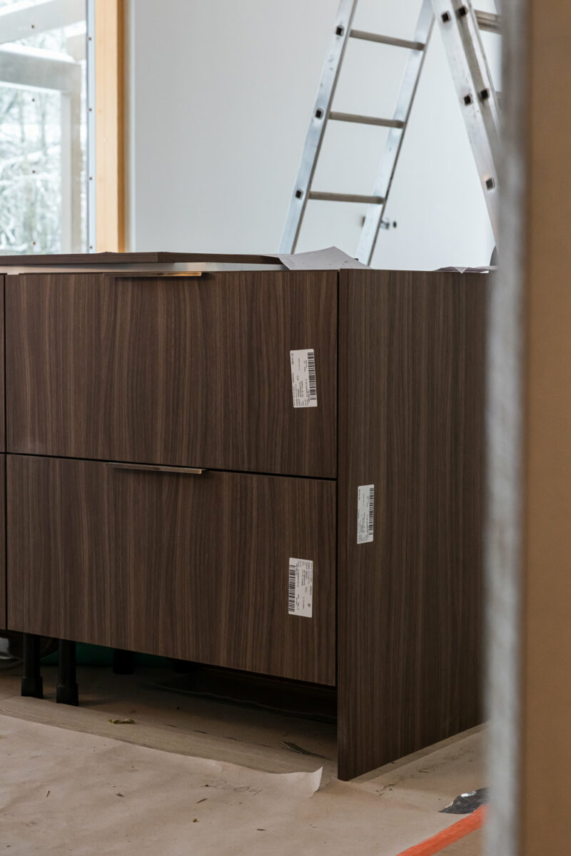 Eveliina ja Lassi ihastuivat kiintokalusteissa pähkinään. “Meillä on muutamia pähkinän sävyisiä huonekaluja, joista pidetään kovasti. Olimme etukäteen katselleet keittiöitä esimerkiksi Pinterestissä ja sitä kautta todettiin, että pähkinä näytti myös siellä kivalta. Katsottiin muitakin vaihtoehtoja, mutta pähkinä tuntui parhaimmalta vaihtoehdolta”, Eveliina kertoo.