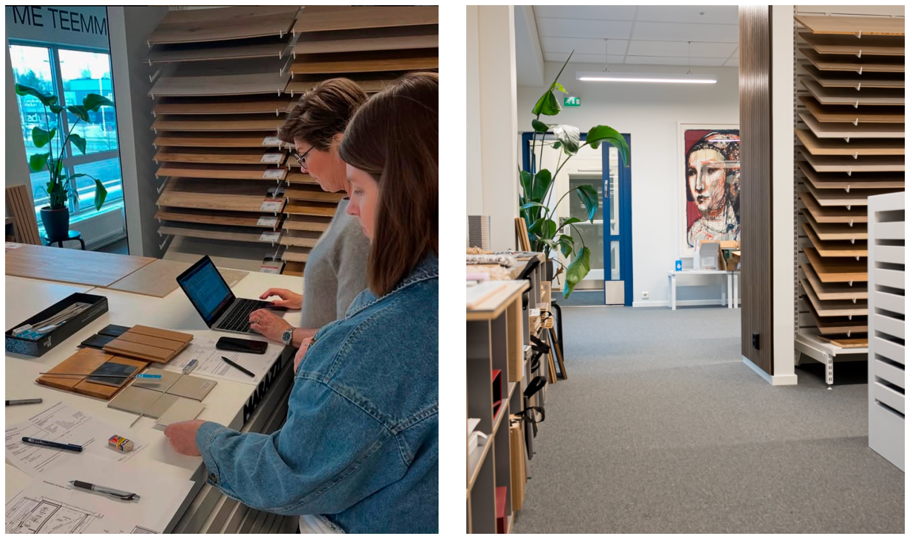 – Vierailimme Kotimaailmassa, kun teimme materiaalivalintoja. Olihan se mukavaa päästä näkemään valikoimaa ja kokeilemaan erilaisia yhdistelmiä. Toki mallipalat ovat hyvin pieniä, eli vaikeaa oli kuvitella isommalle pinnalle. Tässä apuna meillä oli Helena, joka osasi rajata vaihtoehtoja ja antaa vinkkejä valintoihin. Ennen Kotimaailmassa vierailua olimme tehneet kiintokalustesuunnitelmat Puustellin kanssa sekä keskustelleet Woodion kanssa tasoista ja altaista. Myös rimakatto oli aika selkeä jo tuossa vaiheessa. Menimme molemmat aika avoimin mielin sisustuskonsultaatioon, Eveliina kertoo.