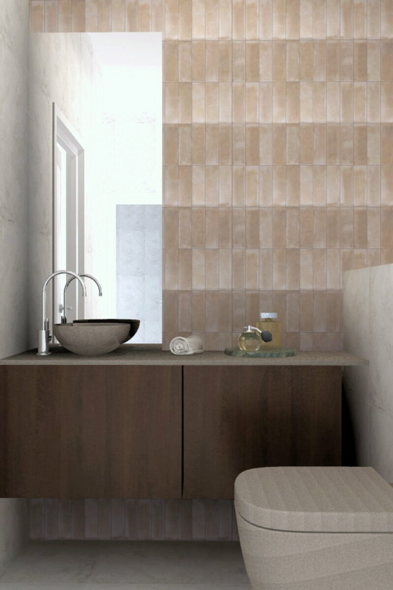 Erillisen wc:n suunnittelussa hyödynnettiin virtuaalisesti mallinnettuja kuvia. Havainnekuva Cassandra Correa, Woodio. Pähkinäisen kiintokalusteen pariksi seinään valittiin Equipe Rakun Sand-laatta.