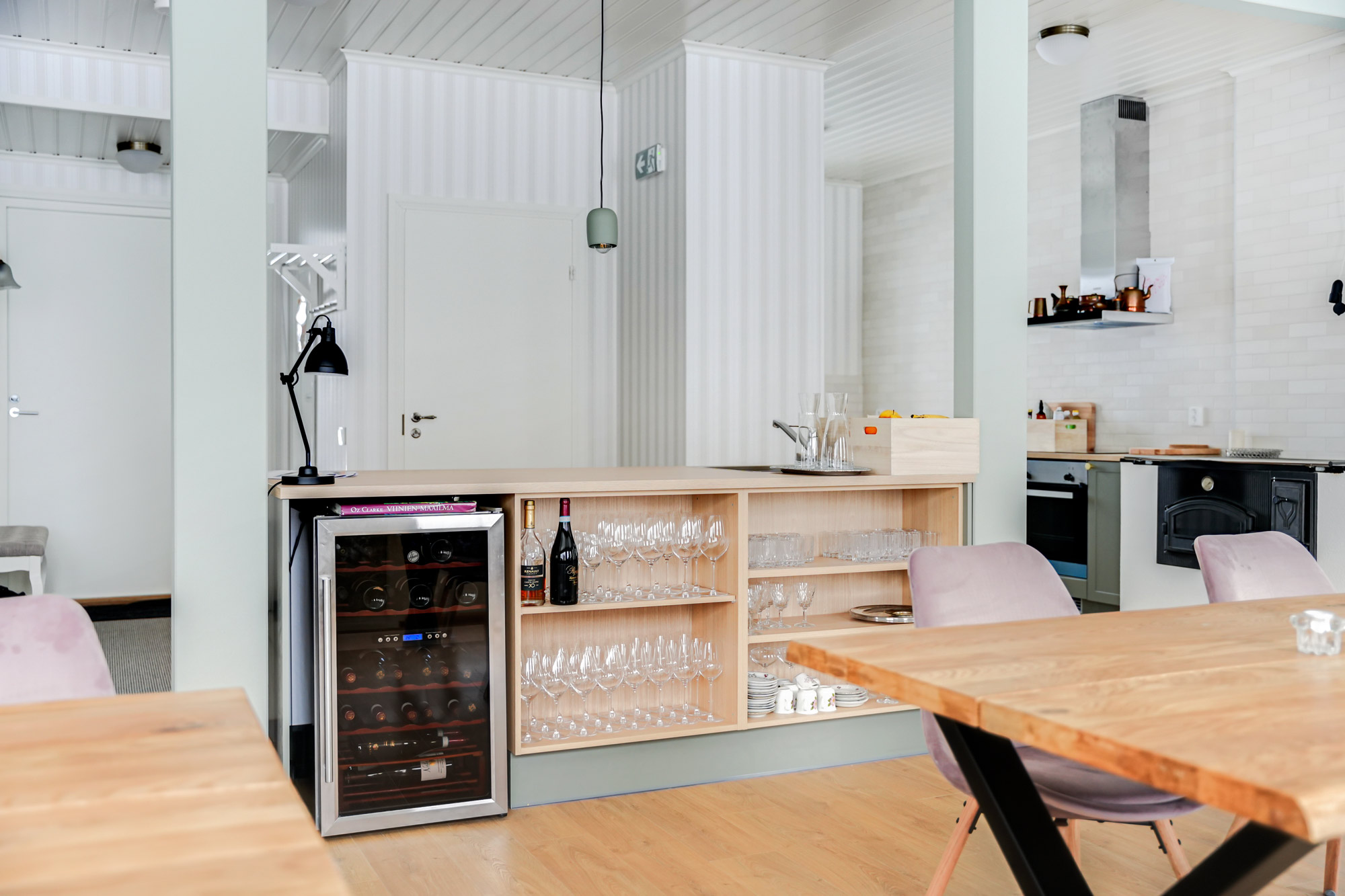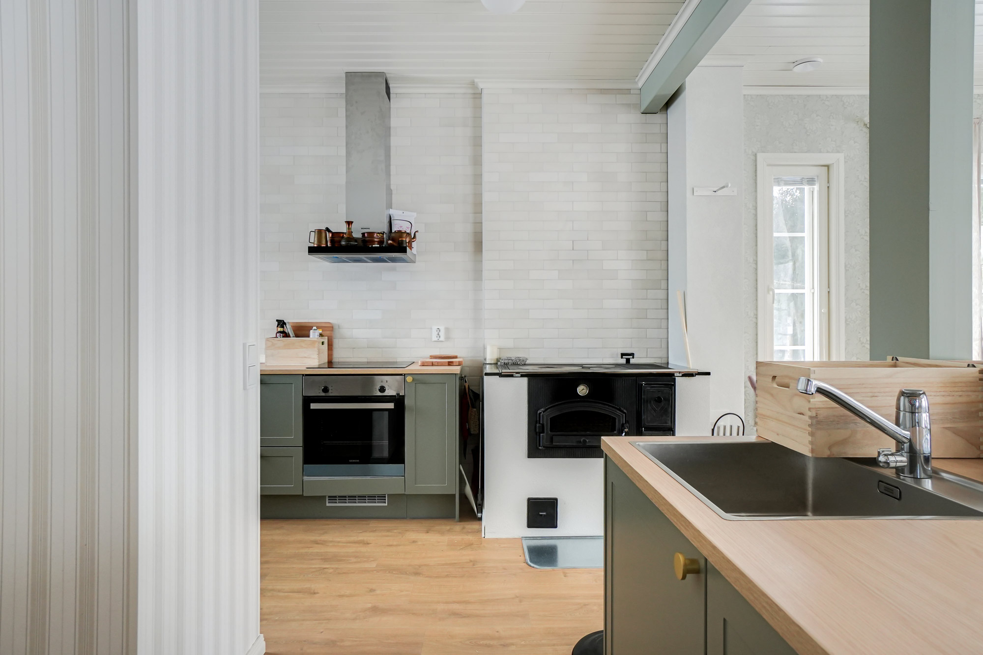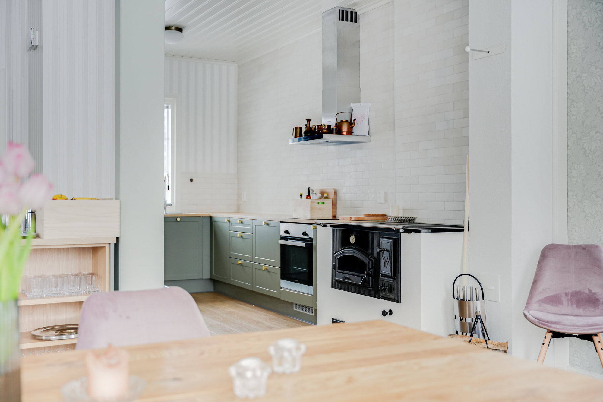 – Päätimme keittiökaappien värityksen ja vetimet sekä se, ettei keittiöön tule ollenkaan yläkaappeja. Halusimme, että keittiö näyttää siistiltä, avaralta ja valoisalta. Katsoimme Helenan kanssa, missä on ruokapöytä, missä valmistan ruokaa ja mitä asiakkaat näkevät takanani. Ajattelin, että siellä voi olla joku kaakeli. Helena vastasi, ettei se voi olla mikä tahansa kaakeli. Olisin valinnut jonkun edullisen vaihtoehdon, mutta Helena sai meidät vakuuttumaan, että kaakelin täytyy olla kaunis ja laadukas. Päätimme, että kaakeli menee keittiötasosta kattoon asti. Kun kaakeleita ei tarvittu montaa neliötä ei hintaerokaan ollut kovin suuri, mutta lopputuloksen kannalta sillä on iso merkitys.