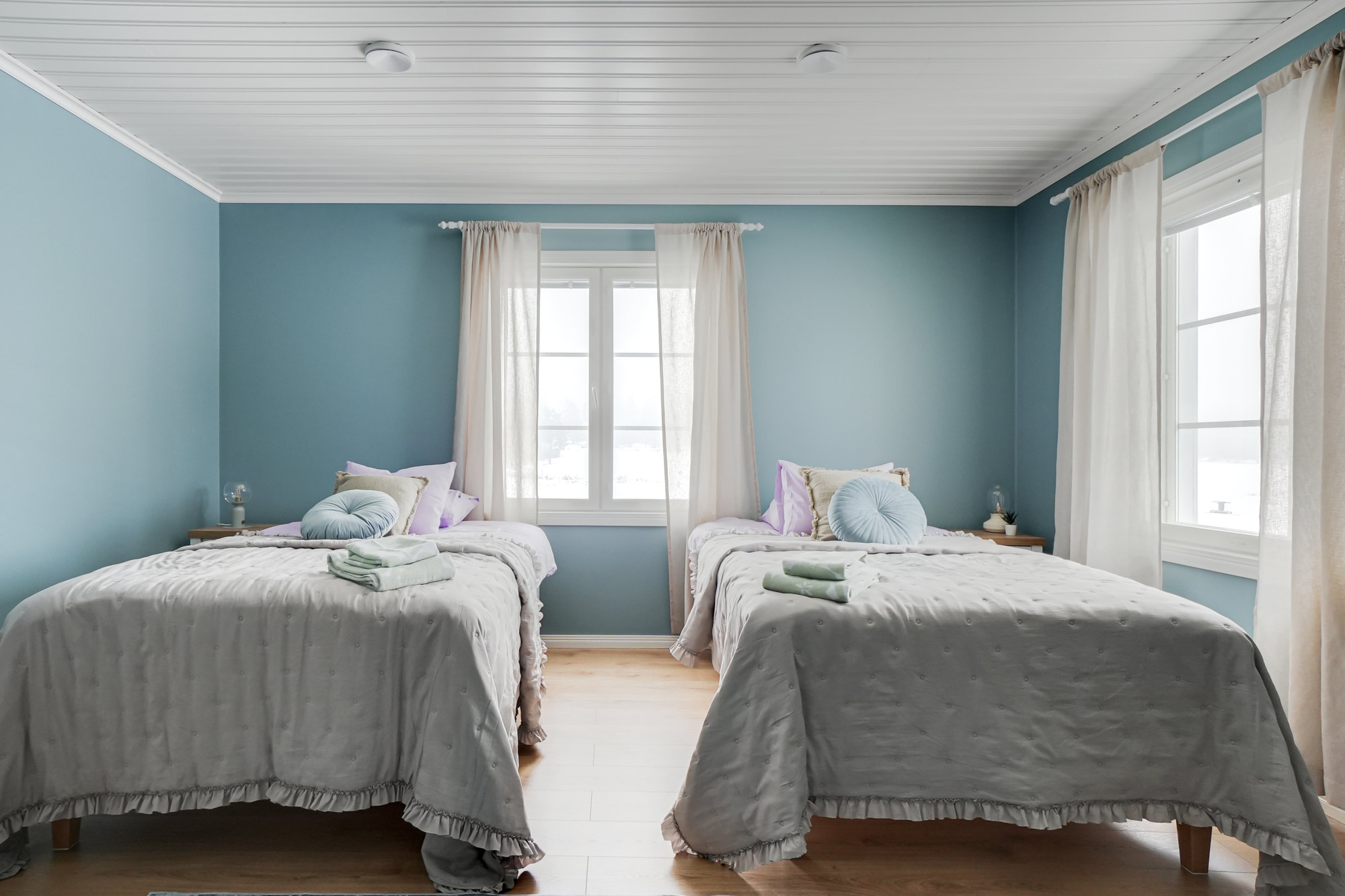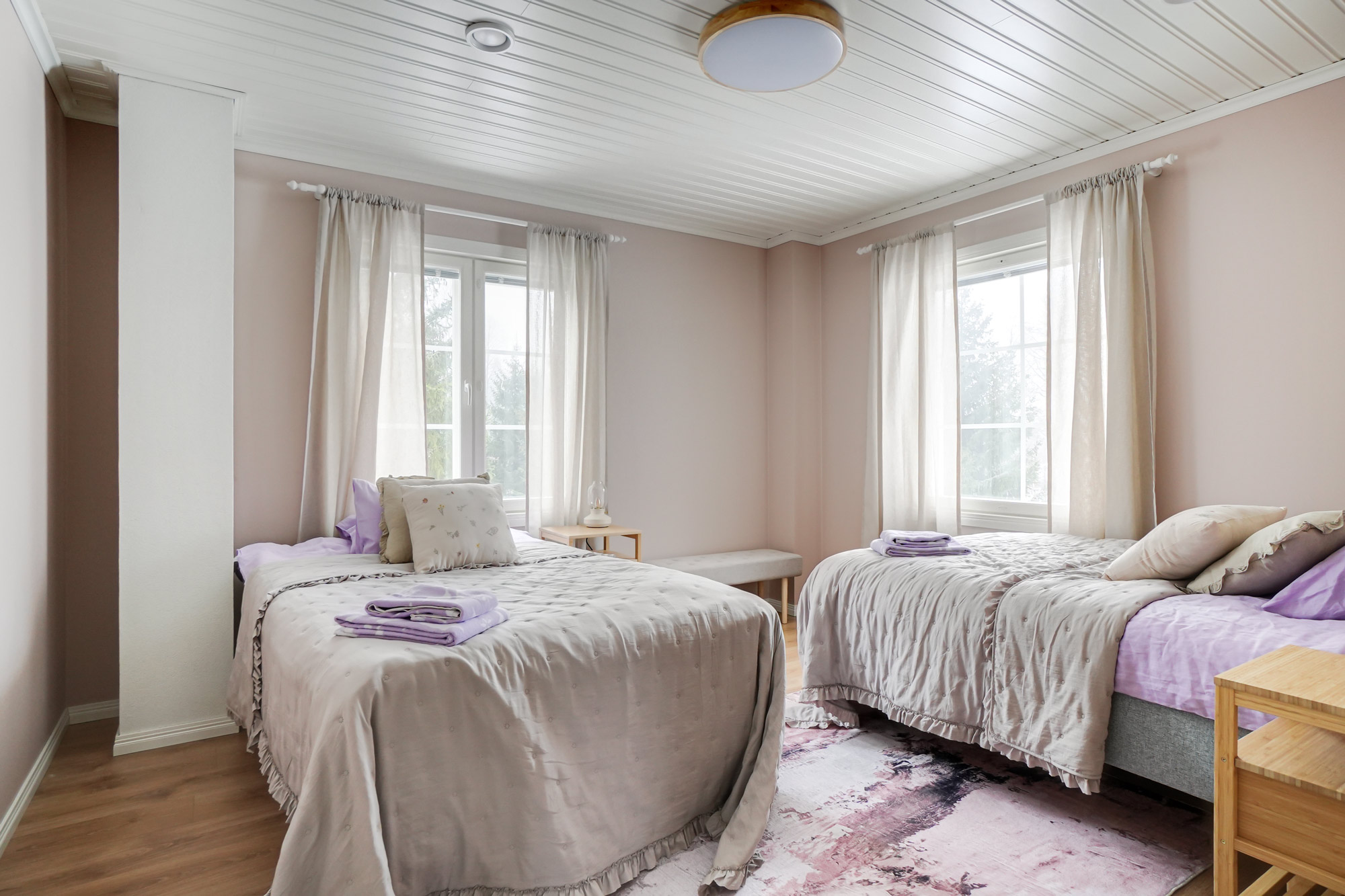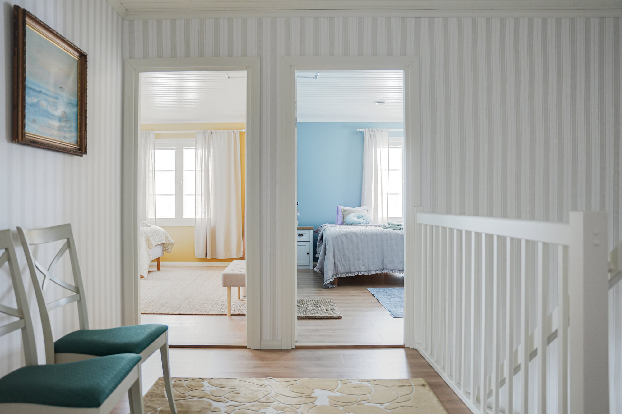 Ilman ammattilaisen apua yläkerran huoneet olisi maalattu kaikki valkoisiksi. Nyt jokainen huone on hillitty, mutta väritykseltään erilainen, esimerkiksi ohran, rosmariinin tai vaahtokarkin värinen. Kun kaikki on mietitty pienintä yksityiskohtaa myöten, värit ja materiaalit ovat harmoniassa keskenään.