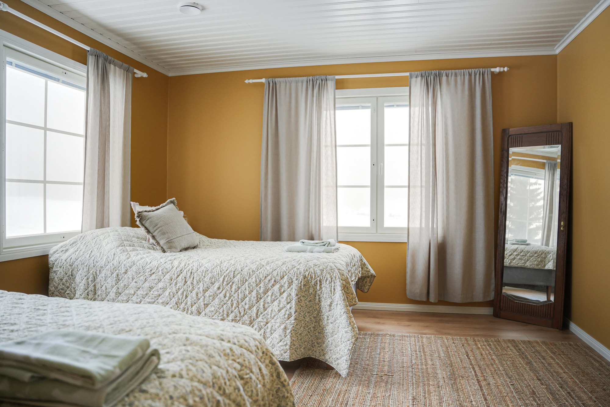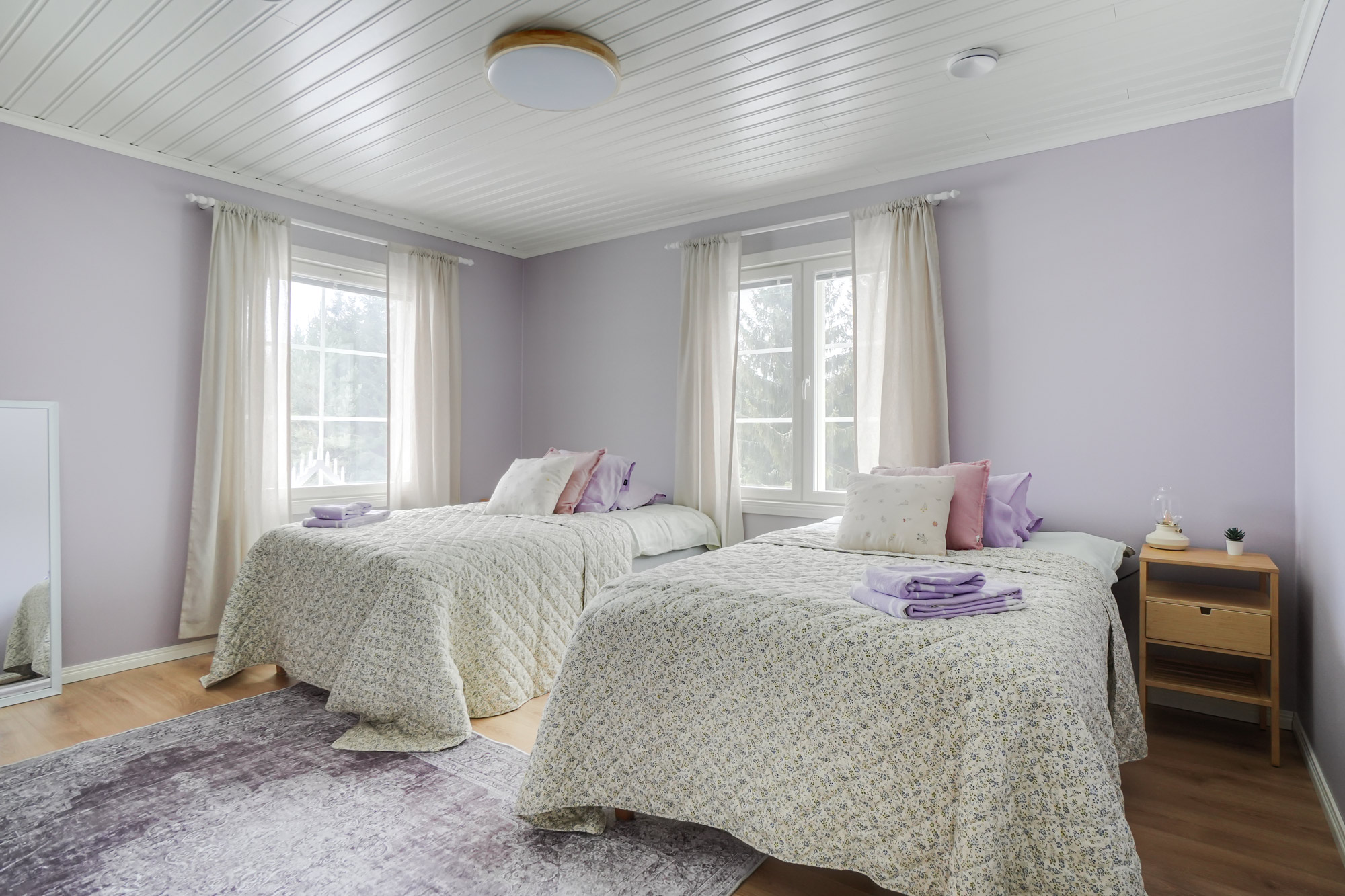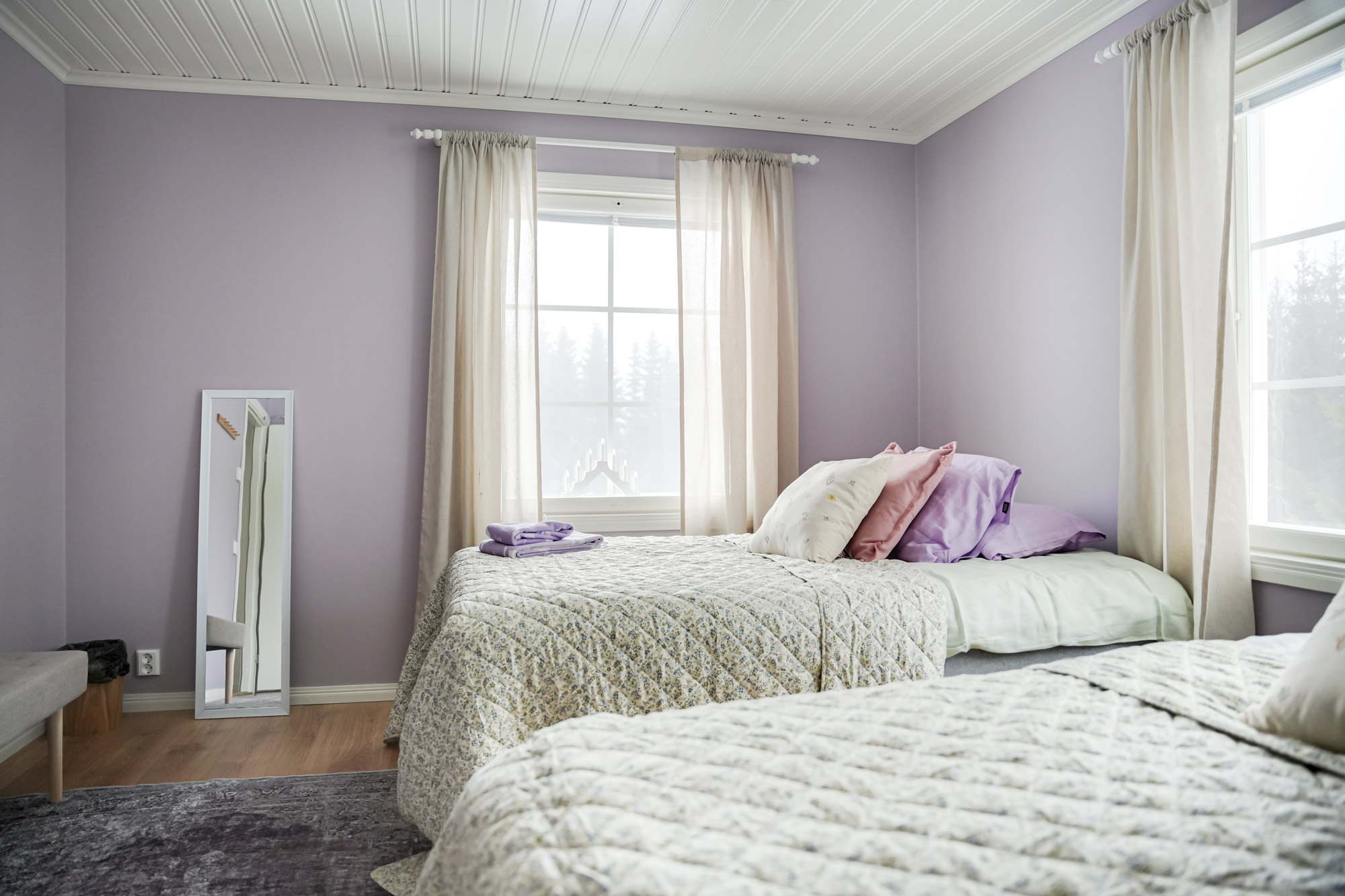 Ilman ammattilaisen apua yläkerran huoneet olisi maalattu kaikki valkoisiksi. Nyt jokainen huone on hillitty, mutta väritykseltään erilainen, esimerkiksi ohran, rosmariinin tai vaahtokarkin värinen. Kun kaikki on mietitty pienintä yksityiskohtaa myöten, värit ja materiaalit ovat harmoniassa keskenään.