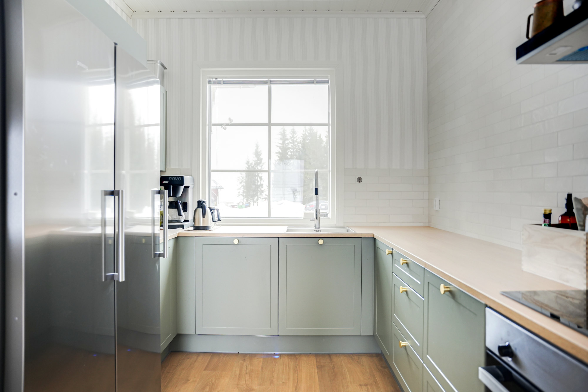 Kattoon asti ulottuva kaakeliseinä luo keittiöön laadukkaan tunnelman, siihen halusimme panostaa.