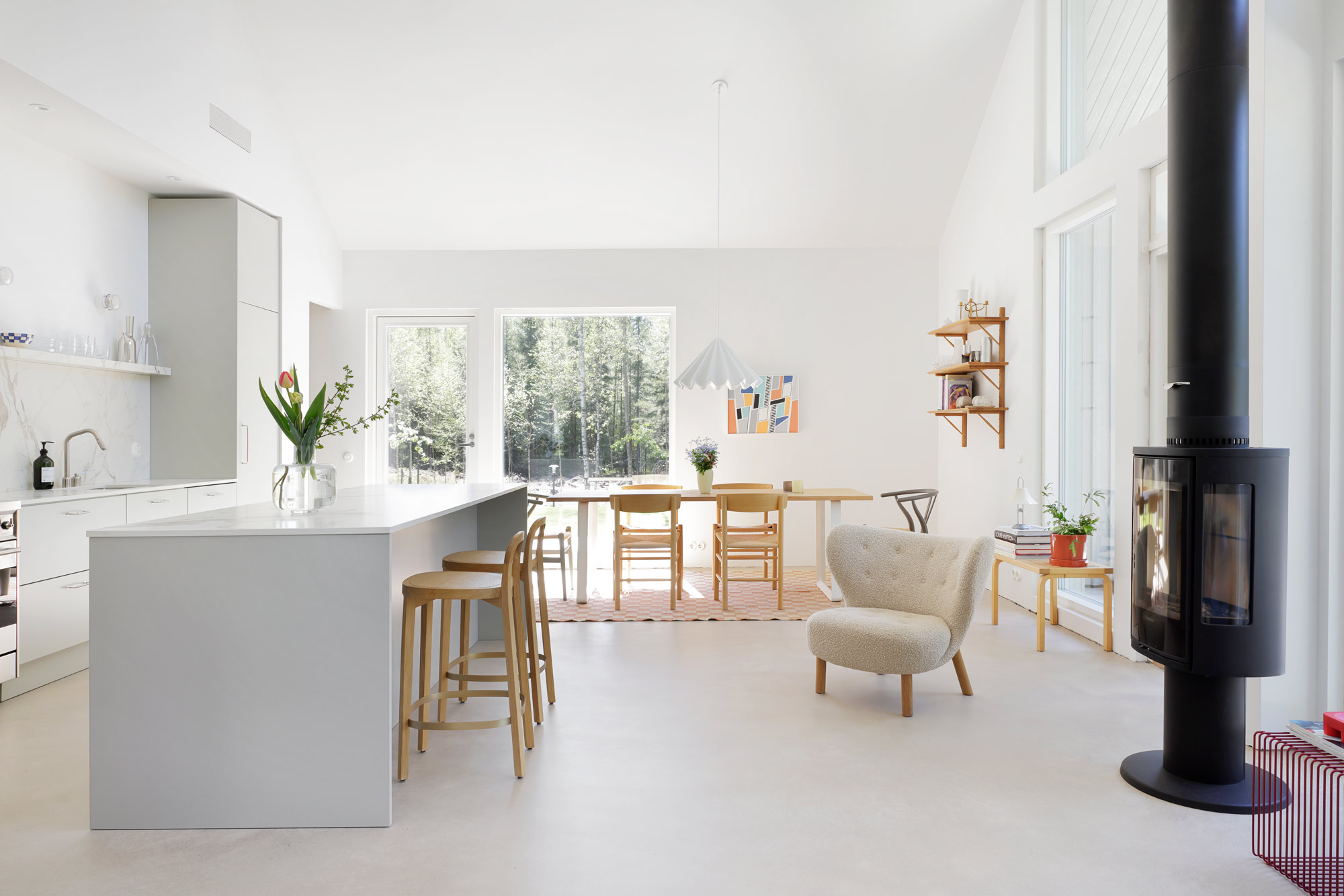 Koko talossa on itse valettu betonilattia. Eteisessä on Unique Homen malliston tammiviilutettu, Rubio Monocoat -öljyllä käsitelty kaapisto. Matto Tikau, Domino-penkki Hakola. Messinkiset Passepartout-kattovalaisimet &Tradition. Avoin oleskelutila pysyy päivälläkin viileänä, kun iso ikkuna aukeaa länteen. Takka Contura. Anne nauttii kotona puuhailusta. Kauniisti sisustettu koti on myös paras paikka rentoutua.