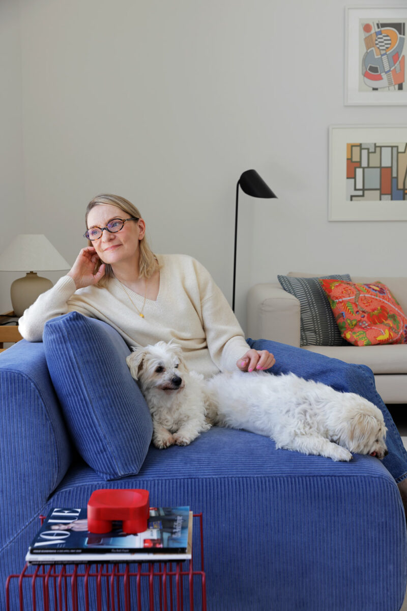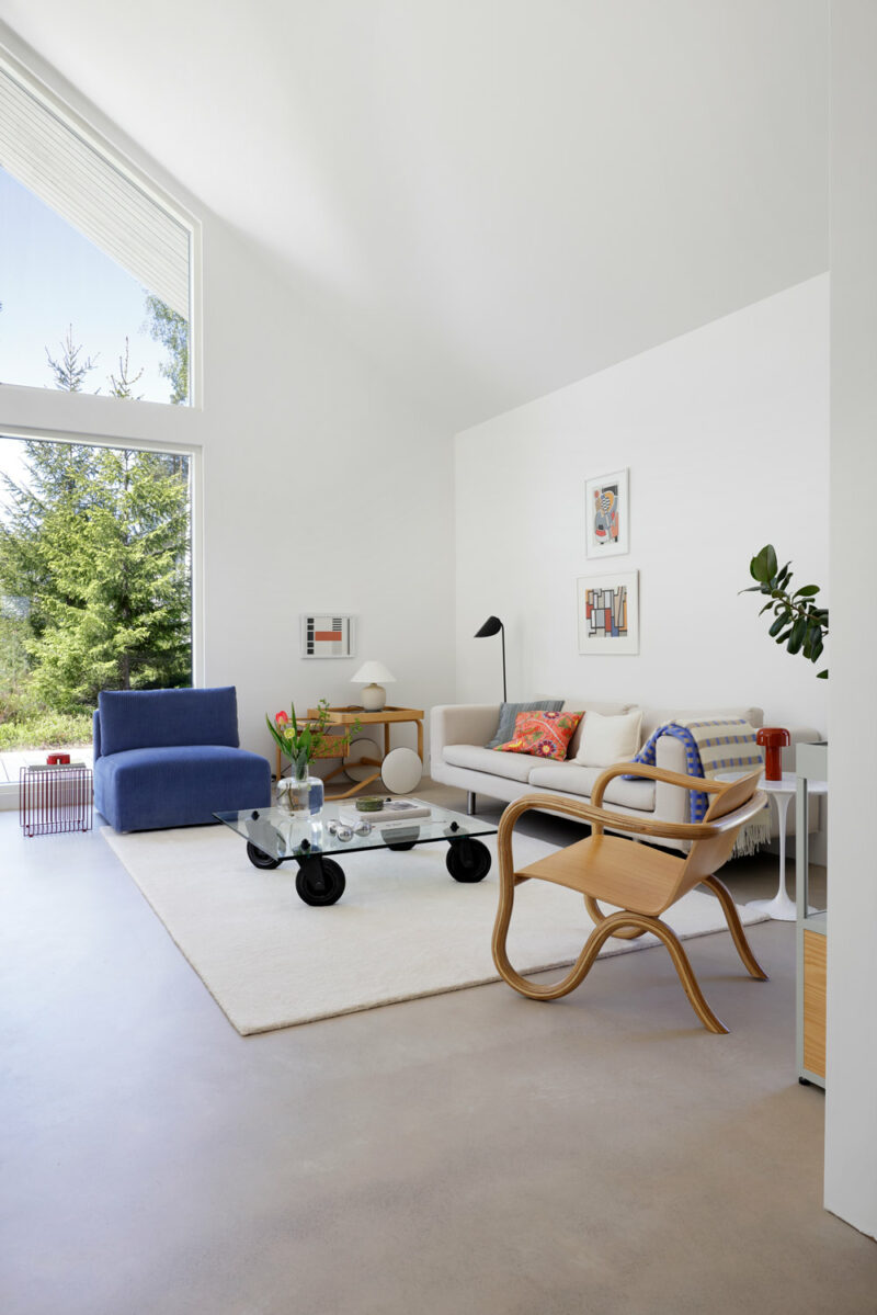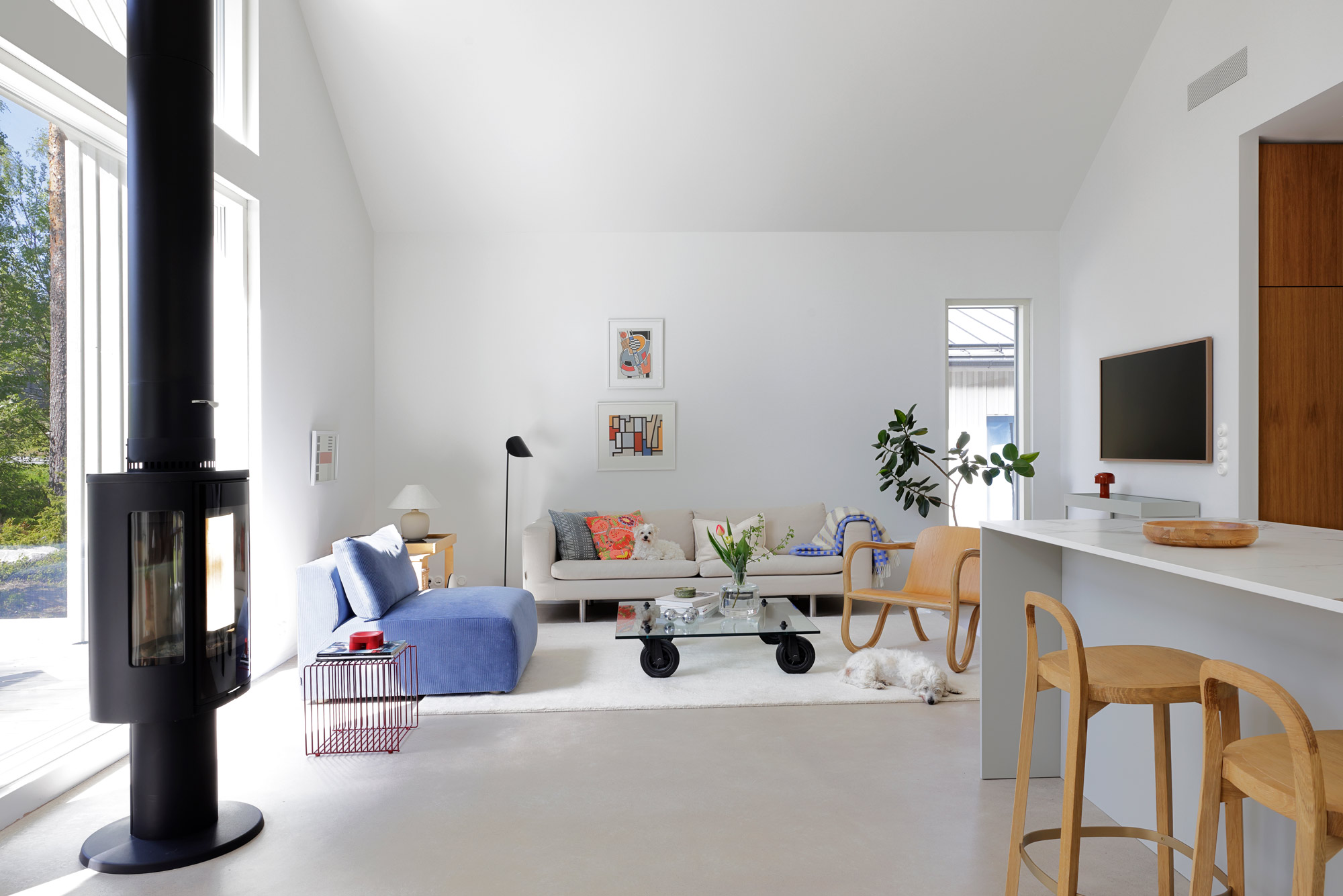 Avoimessa tilassa on hyödynnetty talon koko harjakorkeus. Olohuoneseen hankittiin Roots Livingin Pile Wool -villamatto. Hakolan Puzzle-istuinmoduuli on verhoiltu vakosamettikankaalla, väri vaaleansininen 12. Tanskalainen Söderlundin klassikkosohva on kulkenut pitkään mukana ja on nyt verhoiltu Annalan Anja-villakankaalla. Edessä Made by Choicen Kolho-tuoli. Sohvapöytänä FontanaArten Tavolo con Ruote. Seinillä Annen isän Juhani Melenderin töitä.
