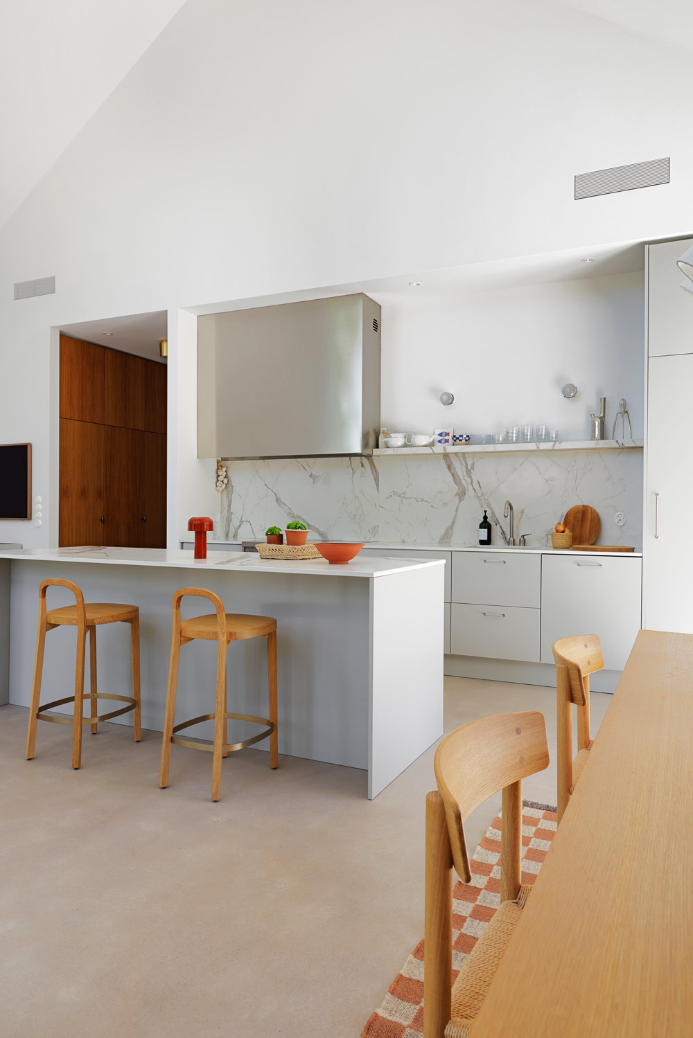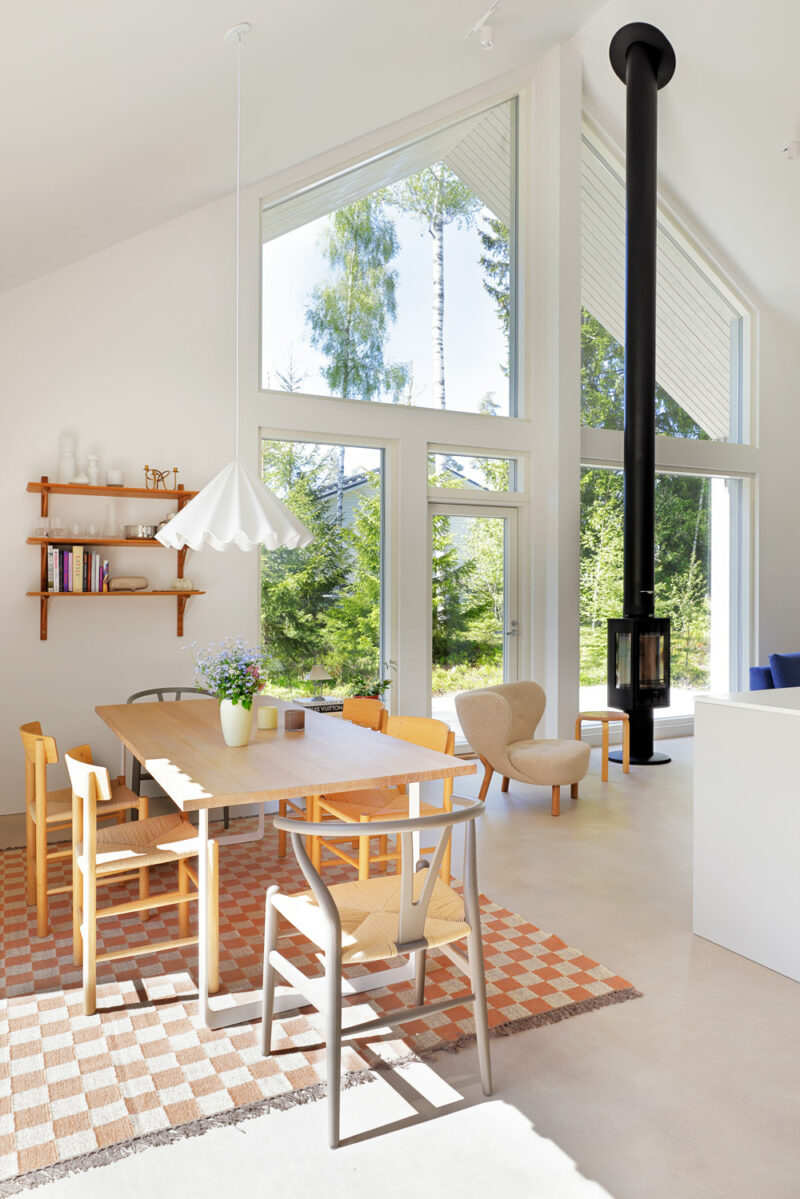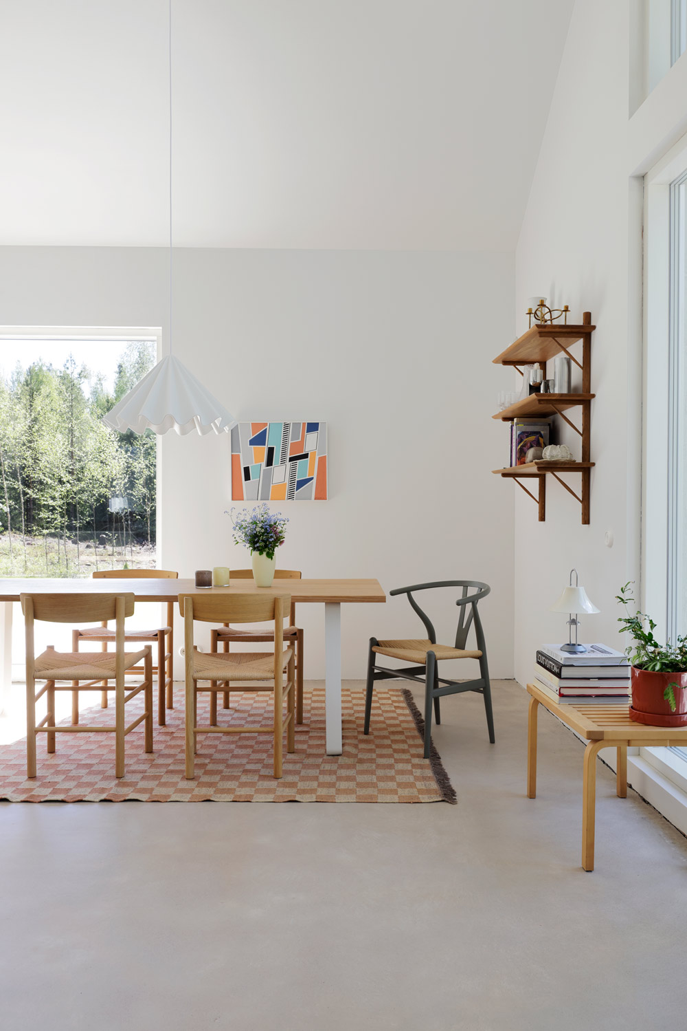 Ruokapöytä on yhdistetty Muuton erillisestä pöytälevystä ja jaloista. Seinällä on Stolabin tamminen Icon-hylly. Valaisin Audon Dancing Pendant. Tuolit Fredericia J39 Mogensen, päissä on Francklysta löydetyt Ilse Crawfordin malliston sävyiset Carl Hansenin suunnittelemat Wishbone-tuolit. Takka Contura.