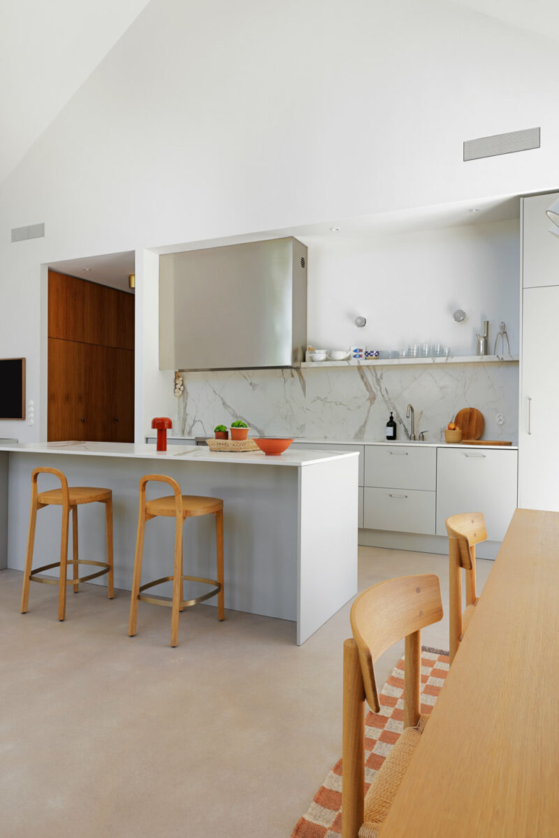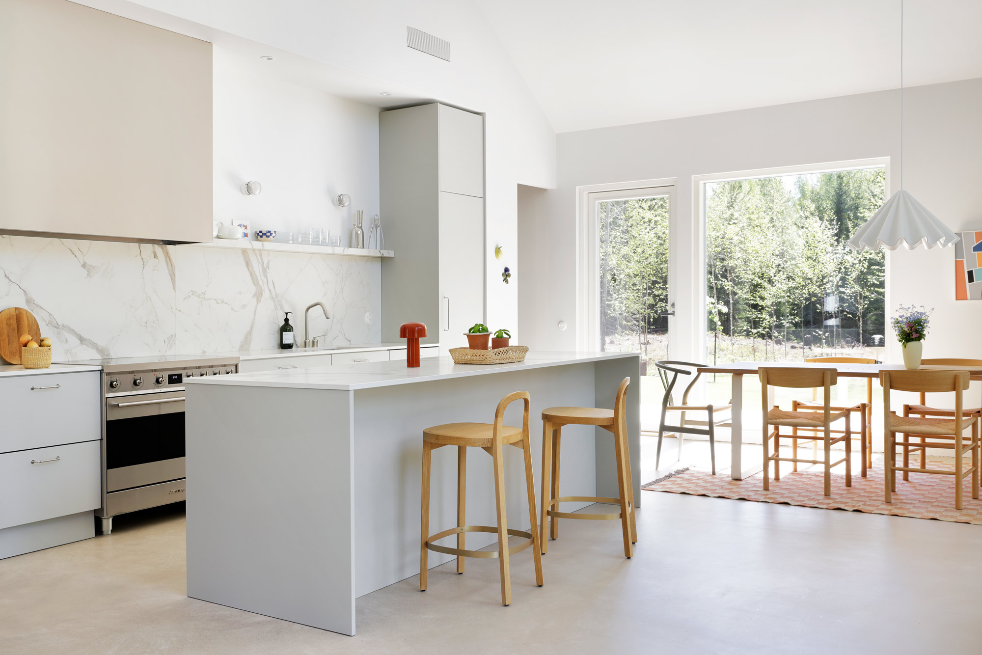 Unique Homen keittiökalusteiden sävy on sama kuin talon ulkoväri, RAL 7044. Keittiössä on Dekton tasot, hylly ja välitila, jotka on helppo pitää puhtaana. Ruokapöytä on yhdistetty Muuton erillisestä pöytälevystä ja jaloista. Seinällä Stolabin tamminen Icon-hylly. Kattovalaisin Audon Dancing Pendant. Tuolit Fredericia J39 Mogensen, päissä Carl Hansenin suunnittelemat Wishbone-tuolit.