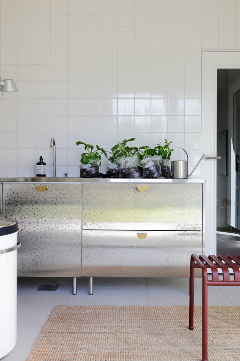 Kodinhoitohuoneen kaapisto on Stalan Seven-sarjaa. Messingin väriset vetimet on tilattu Australiasta. Lattia on laatoitettu Pukkilan pilkullisilla laatoilla.