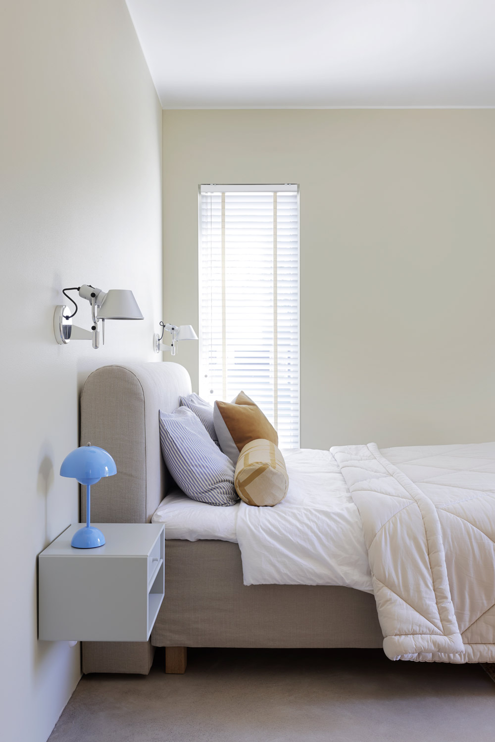 Makuuhuoneen seinä maalattiin Teknoksen Lagom T1659 -sävyllä. Makuuhuoneeseen tulee valo kahdesta suunnasta, idästä ja etelästä. Sänky ja sängynpääty Matri. Lukuvalot Artemiden Tolomeo ja sininen &Traditionin Flowerpot, väri Swim Blue.