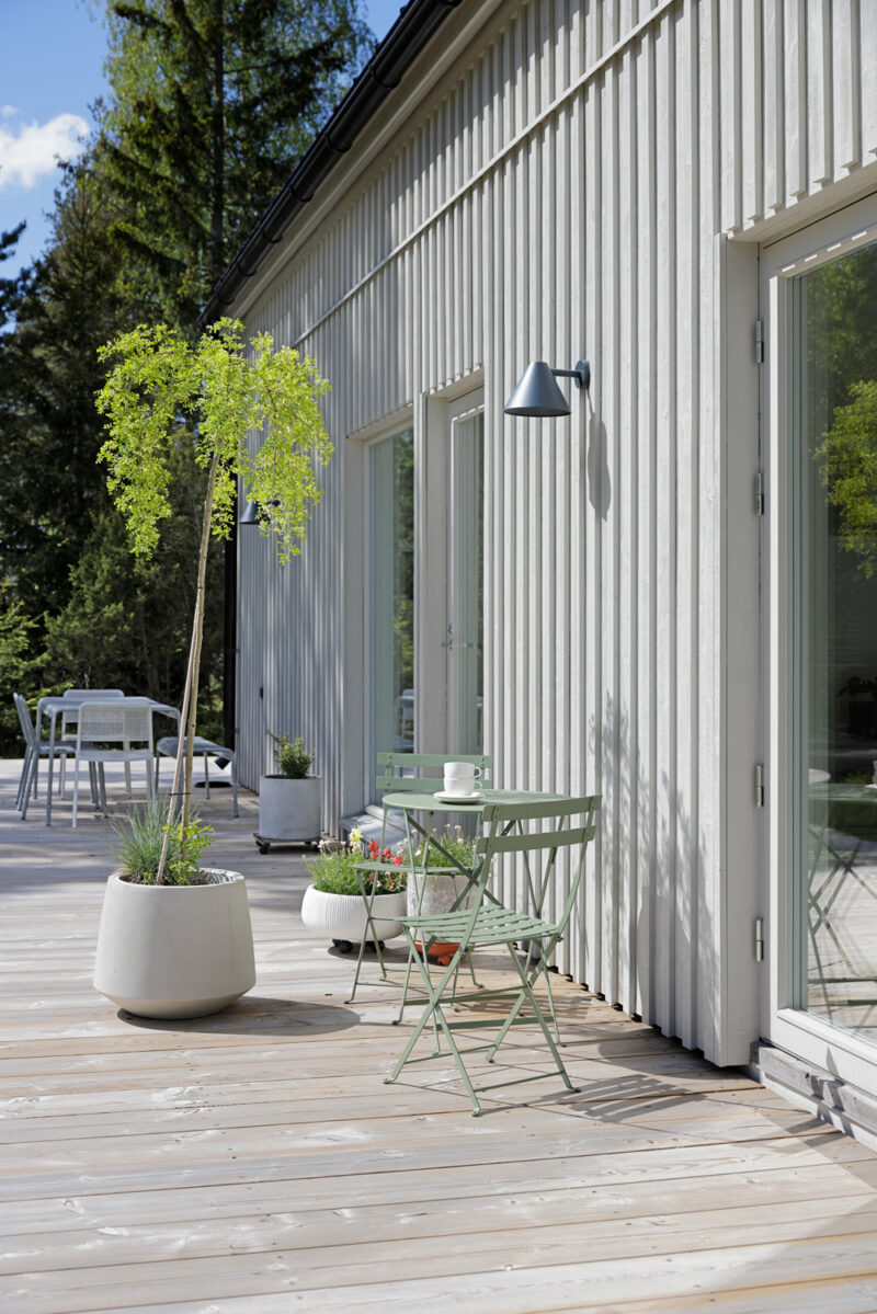- Terassin ruokailuryhmä sijoitettiin niin, ettei se näy olohuoneen ja keittiön ikkunoista sisään.