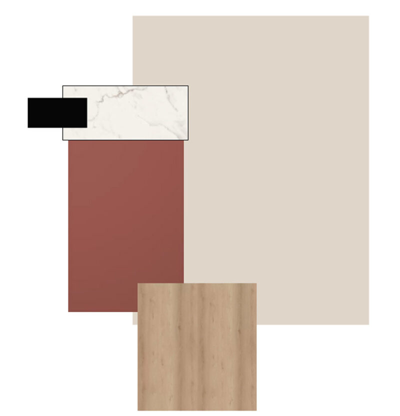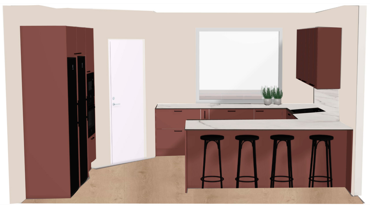 Viivi oli ihastunut hurmaavaan viininpunaisen sävyyn nähtyään sen Puustellin Instagramissa. Värikkäämmästä kiintokalustevalikoimasta löytyi myös sininen ja vihreä vaihtoehto. Tasomateriaaliksi valikoitui laminaattitaso marmorikuvioinnilla.