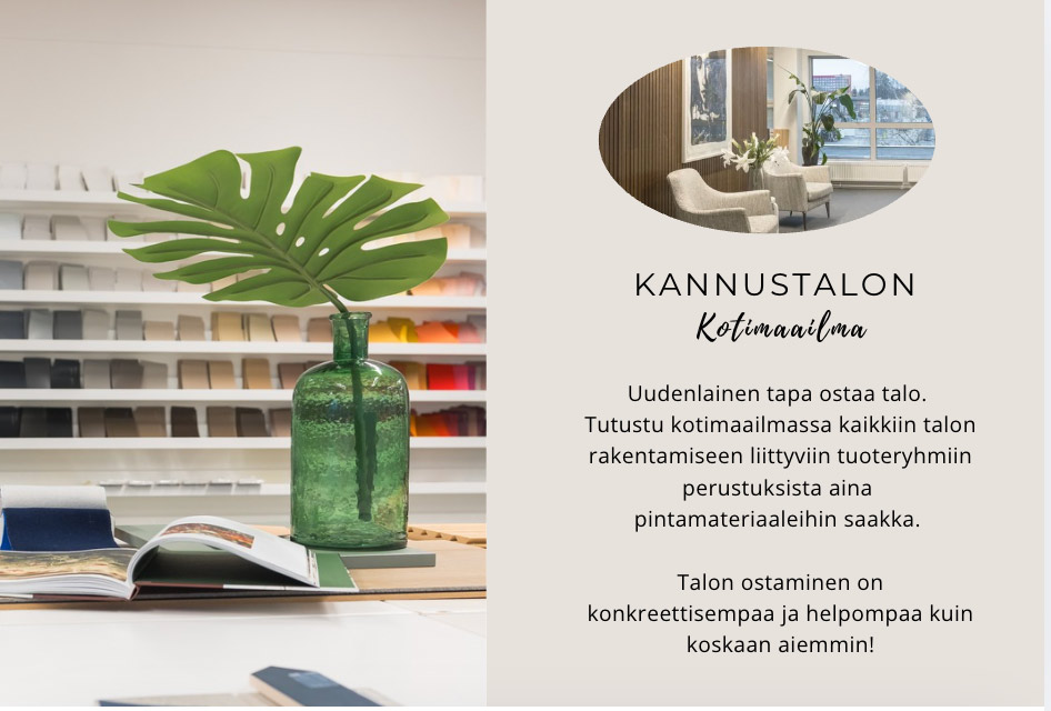 Kannustalon Muuttovalmis-koteihin kuuluu kolmen tunnen sisustuskonsultaatio. Kannustalon yhteistyökumppanin, sisustussuunnittelija Helena Karihtalan avulla kodin väri- ja materiaalivalinnat saatiin lyötyä lukkoon.- Koska halusimme käyttää kodissamme runsaasti erilaisia värejä, sisustussuunnittelijasta oli suuri apu soljuvan kokonaisuuden luomisessa, Viivi kertoo.